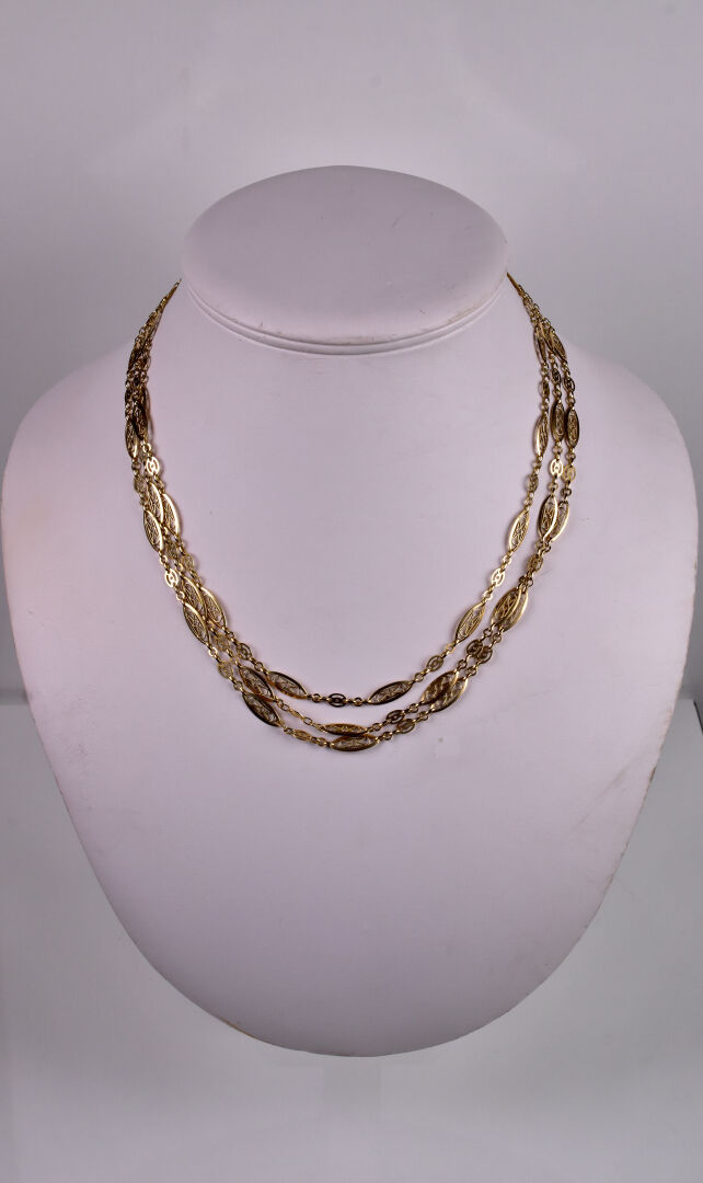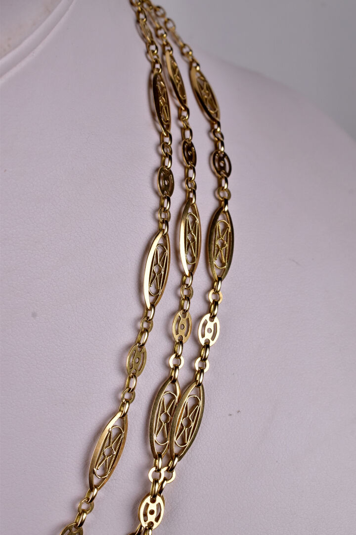 Longue chaine giletière double rang en or jaune 18K 750/1000e à maille filigranne. Long. : 76 cm. Poids. : 28,6 g.