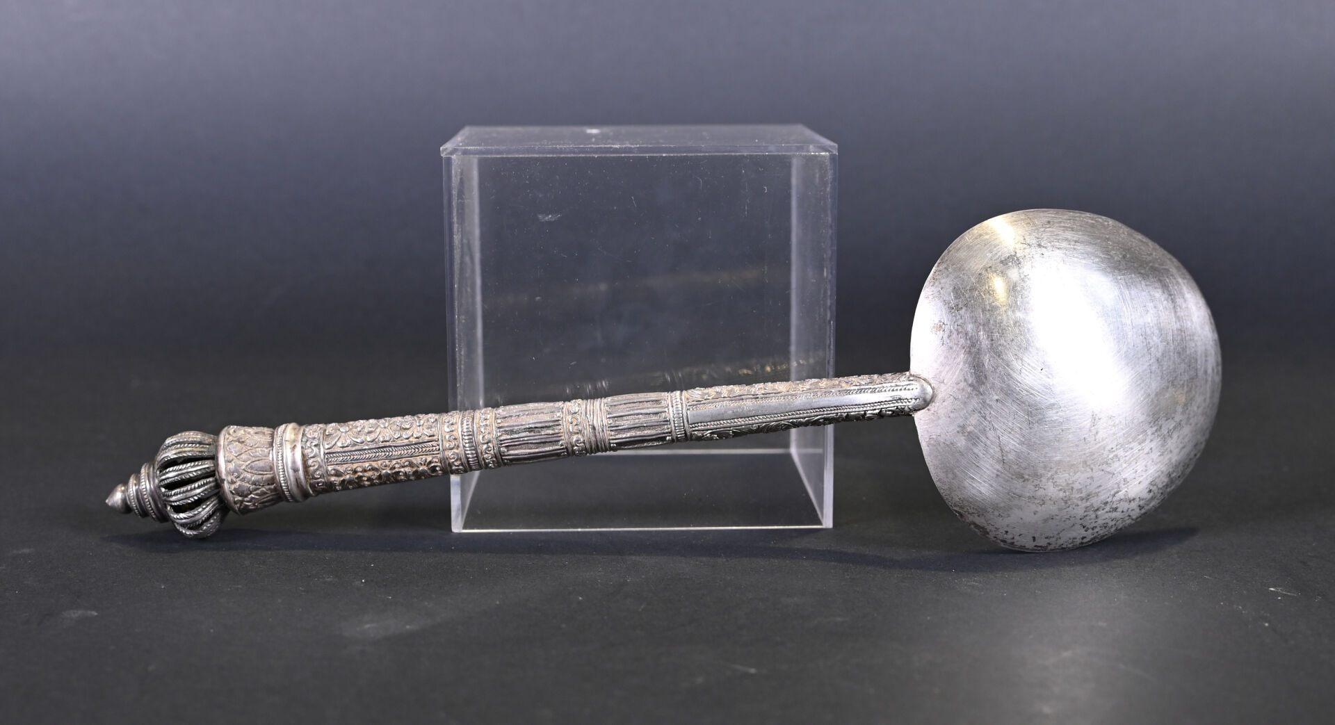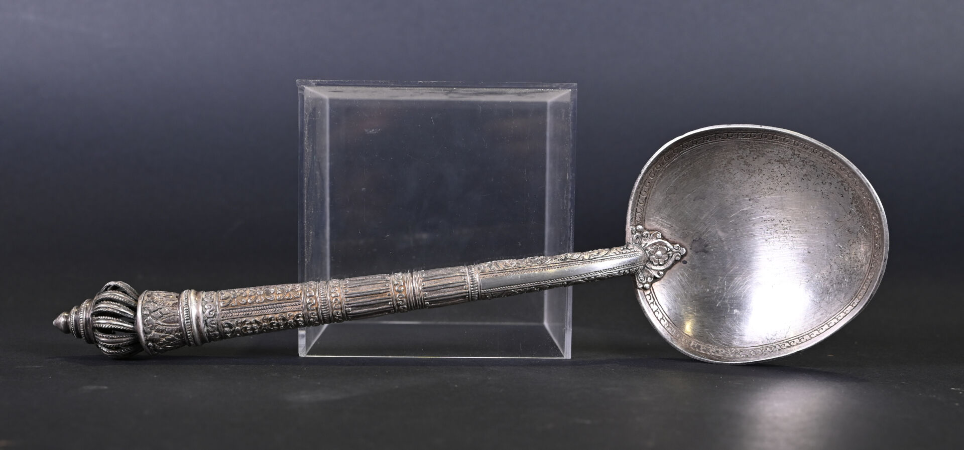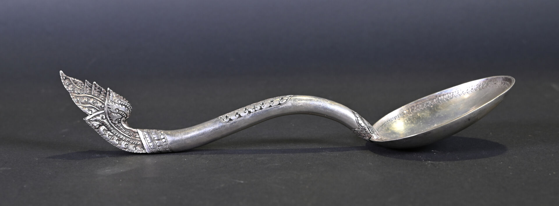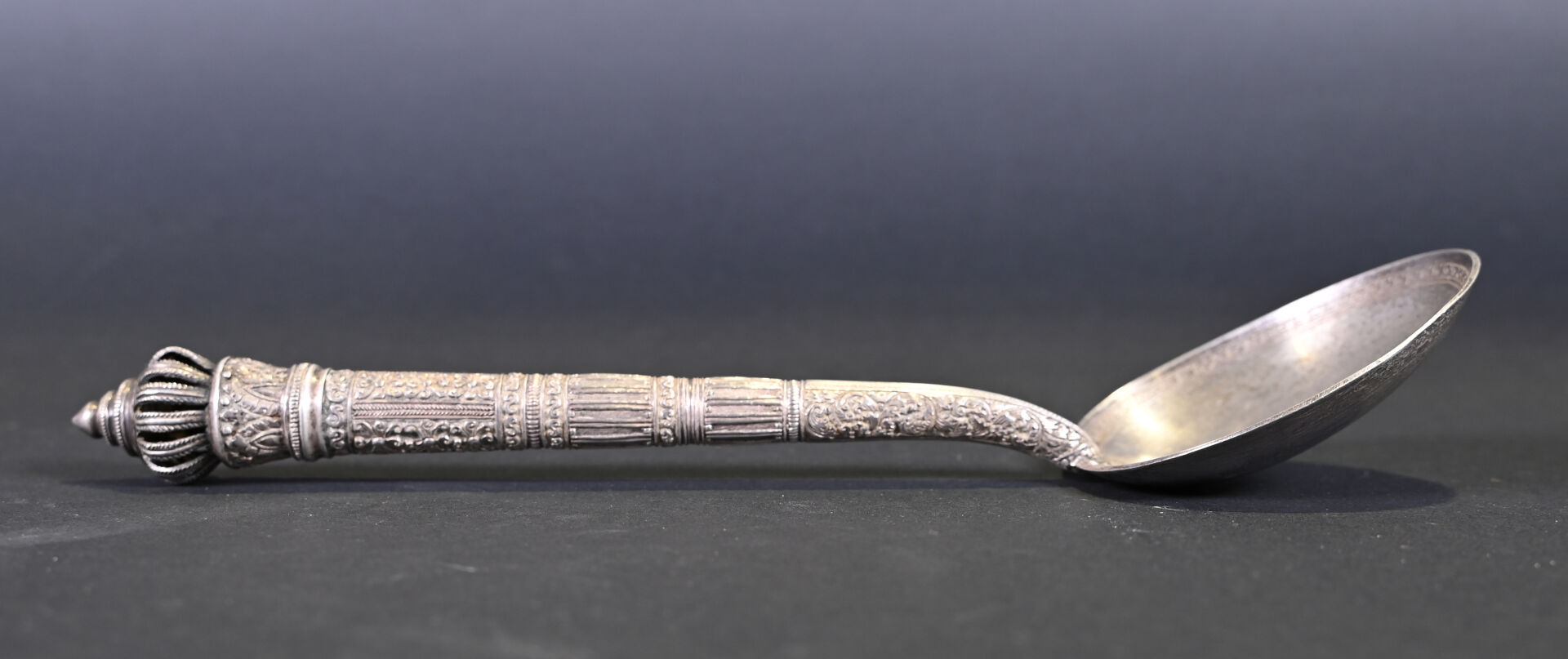 Lot comprenant deux grandes cuillères en argent 925/1000e ciselé, dont une à décor floral. Poids : 254 g. On joint un couteau dont le manche est en argent fourré, à motifs de fleurs. Poids : 35 g. Et une cuillère plus petite en argent bas titre. Tibet, XXe siècle.