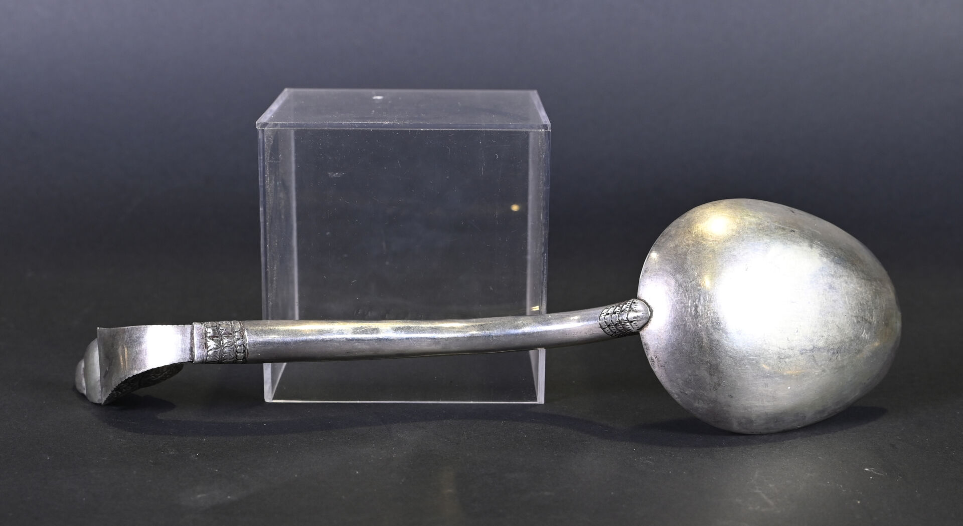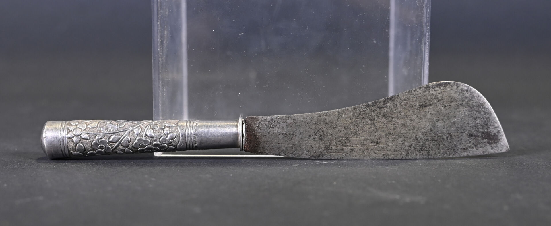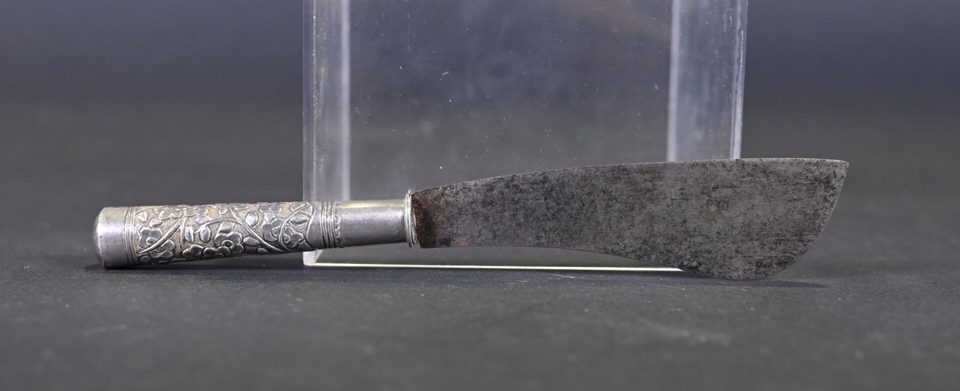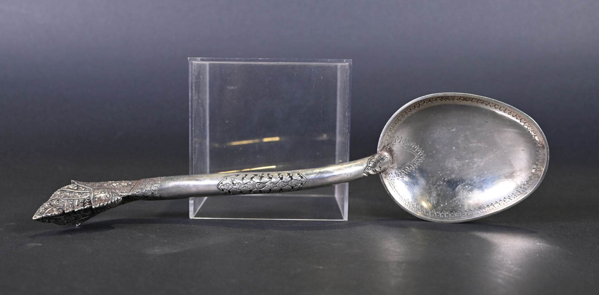 Lot comprenant deux grandes cuillères en argent 925/1000e ciselé, dont une à décor floral. Poids : 254 g. On joint un couteau dont le manche est en argent fourré, à motifs de fleurs. Poids : 35 g. Et une cuillère plus petite en argent bas titre. Tibet, XXe siècle.
