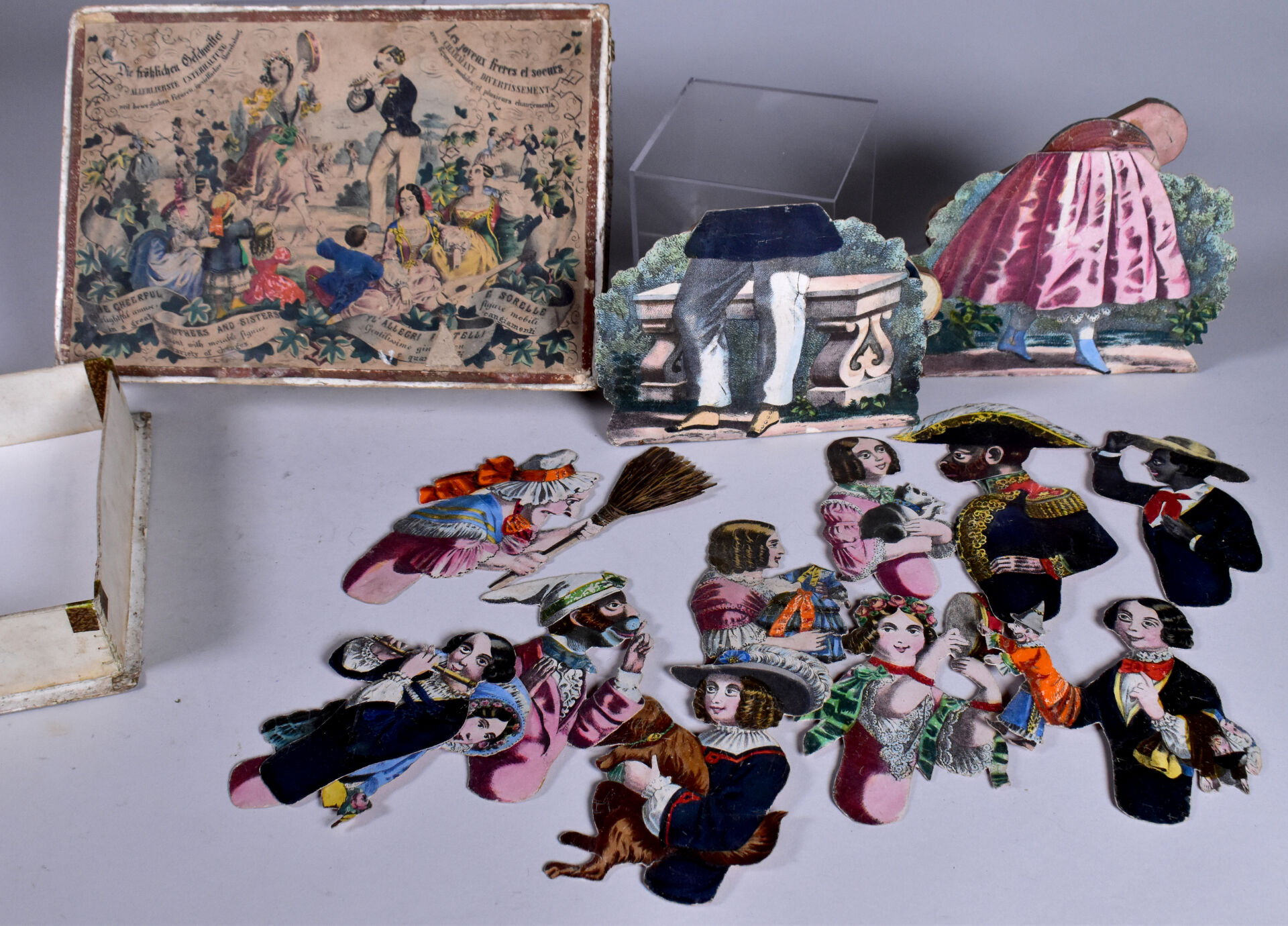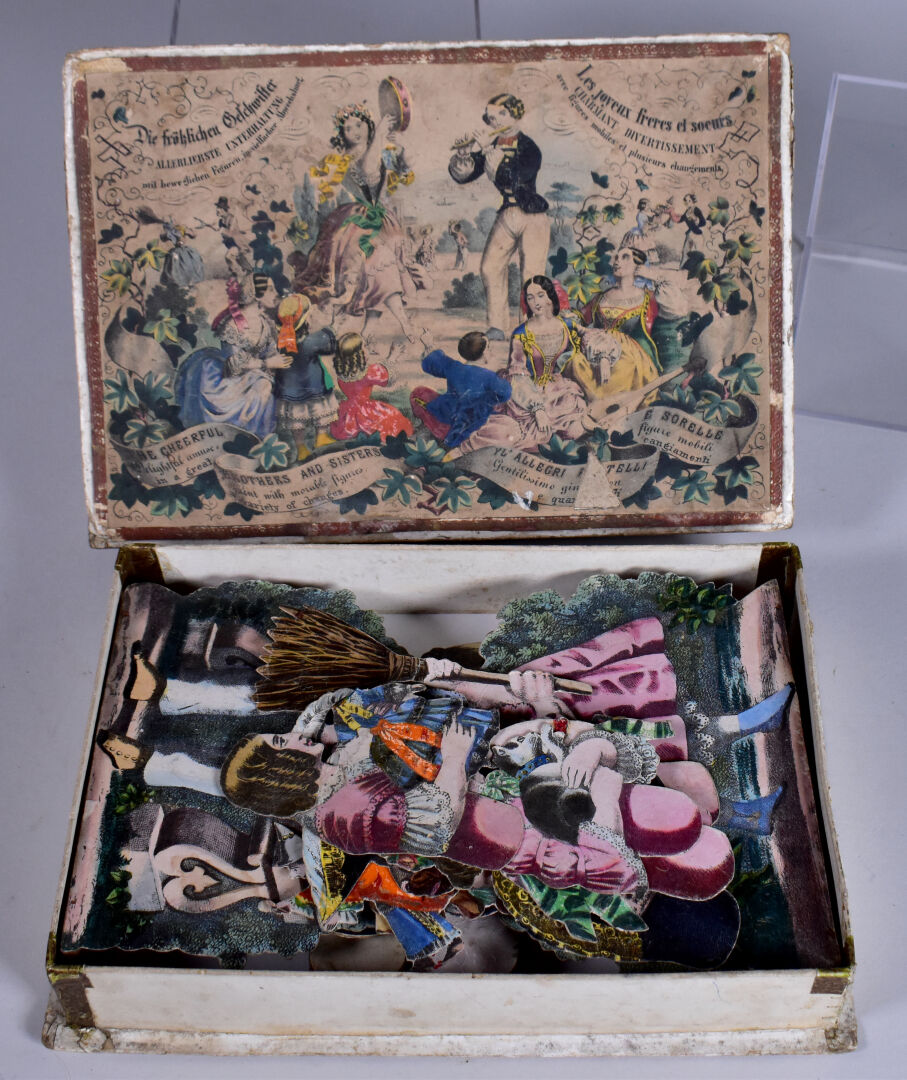 Lot comprenant jeu ancien fin 19 ème en cartonnage( boite en état d’usage) « les joyeux frères et sœurs charmant divertissement » état d’usage complet ?? on y joint masque de poupée de boudoir 26cm