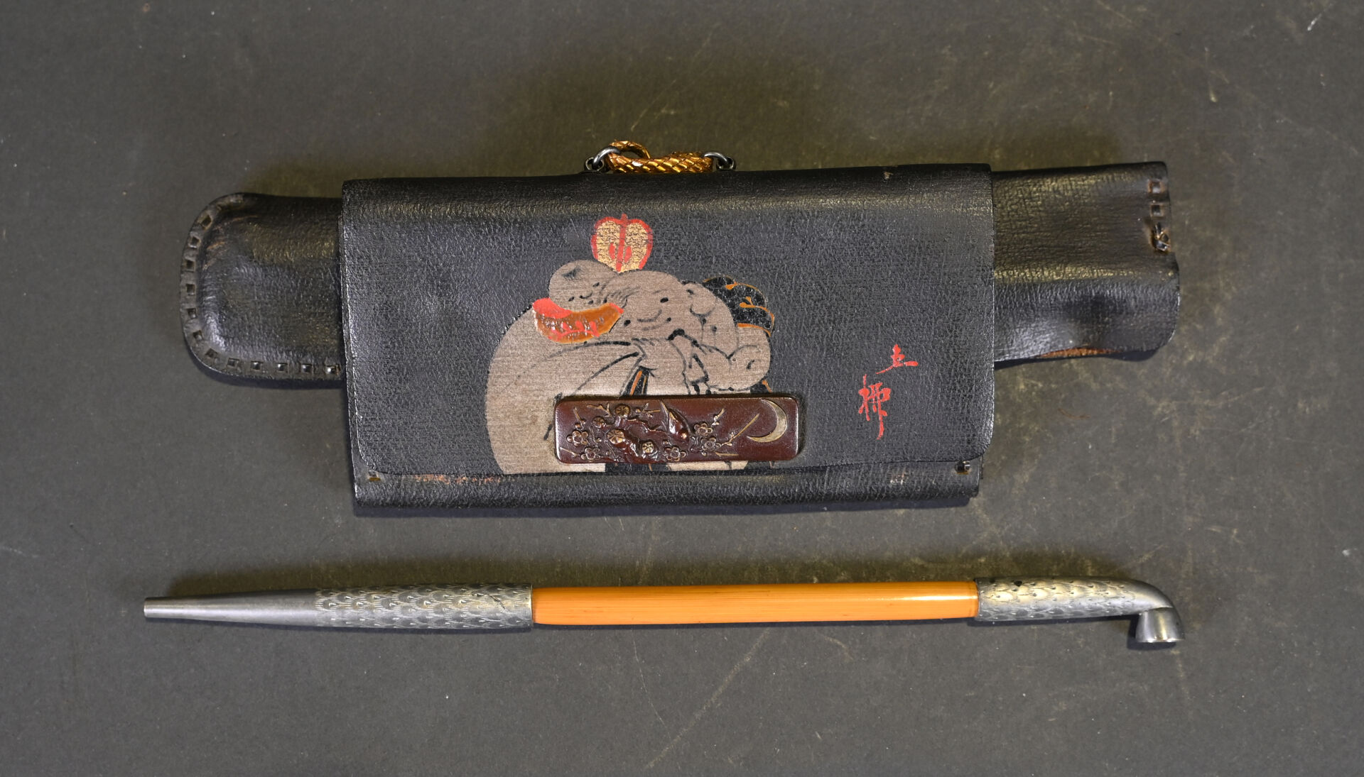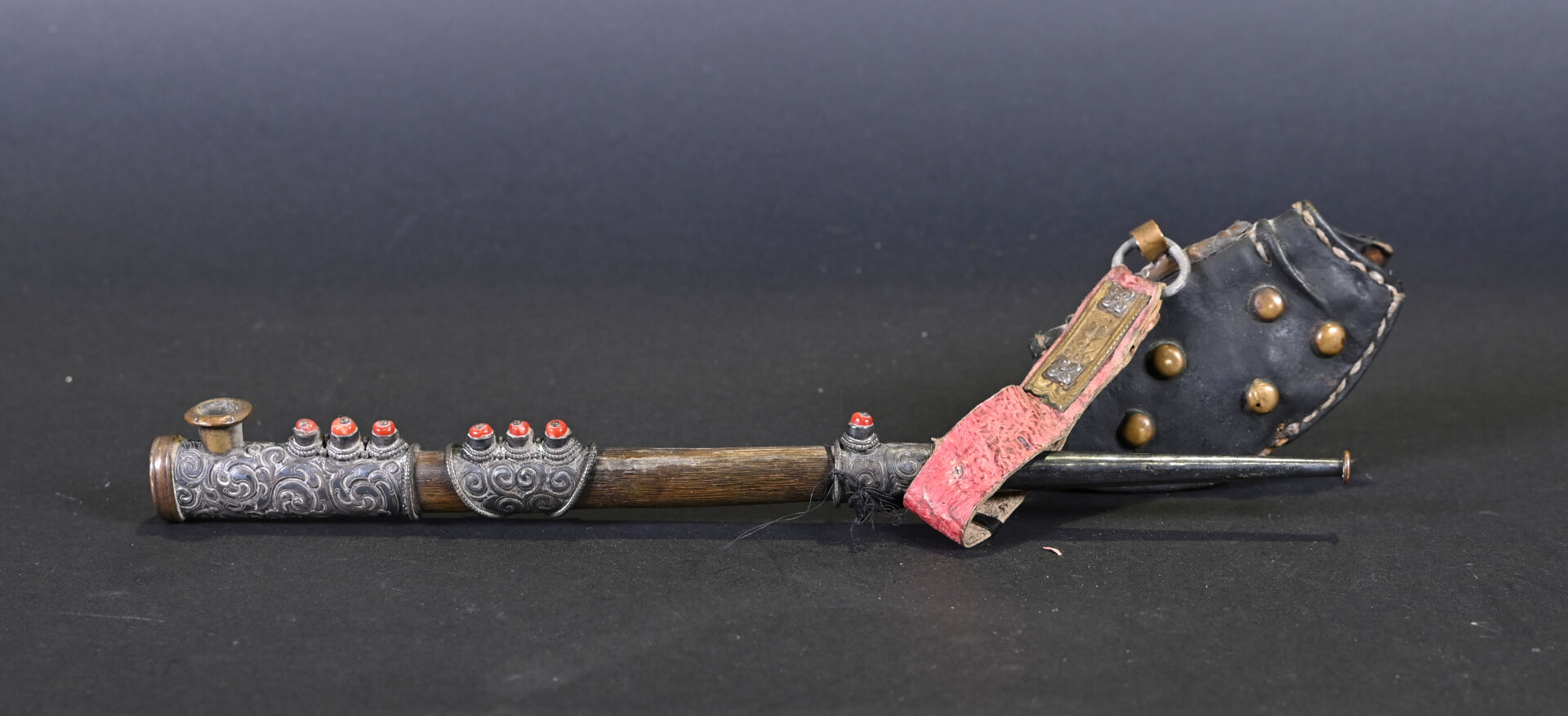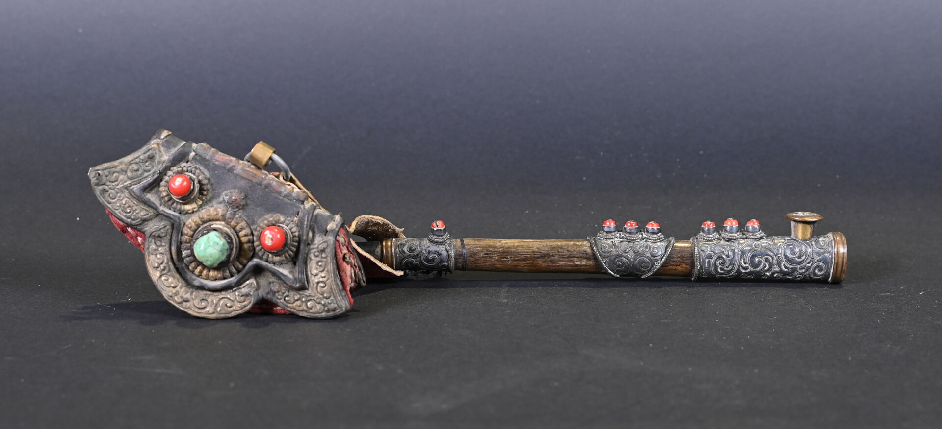 Lot comprenant une pipe en bois et éléments appliqués en métal argenté à motifs floraux, agrémenté de cabochons de corail, avec sa blague à tabac ornée de cabochons de corail et turquoise ; et un kiseru avec son étui (kiseruzutsu) et sa poche à tabac (tabako-ire) à décor d’Hotei et d’un enfant, et une plaque en bronze à décor en léger relief d’oiseau et fleurs. Tibet et Japon, vers 1900.