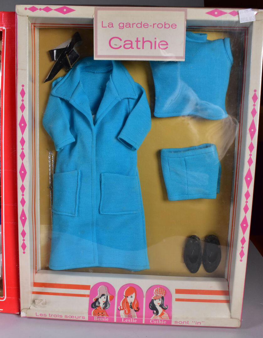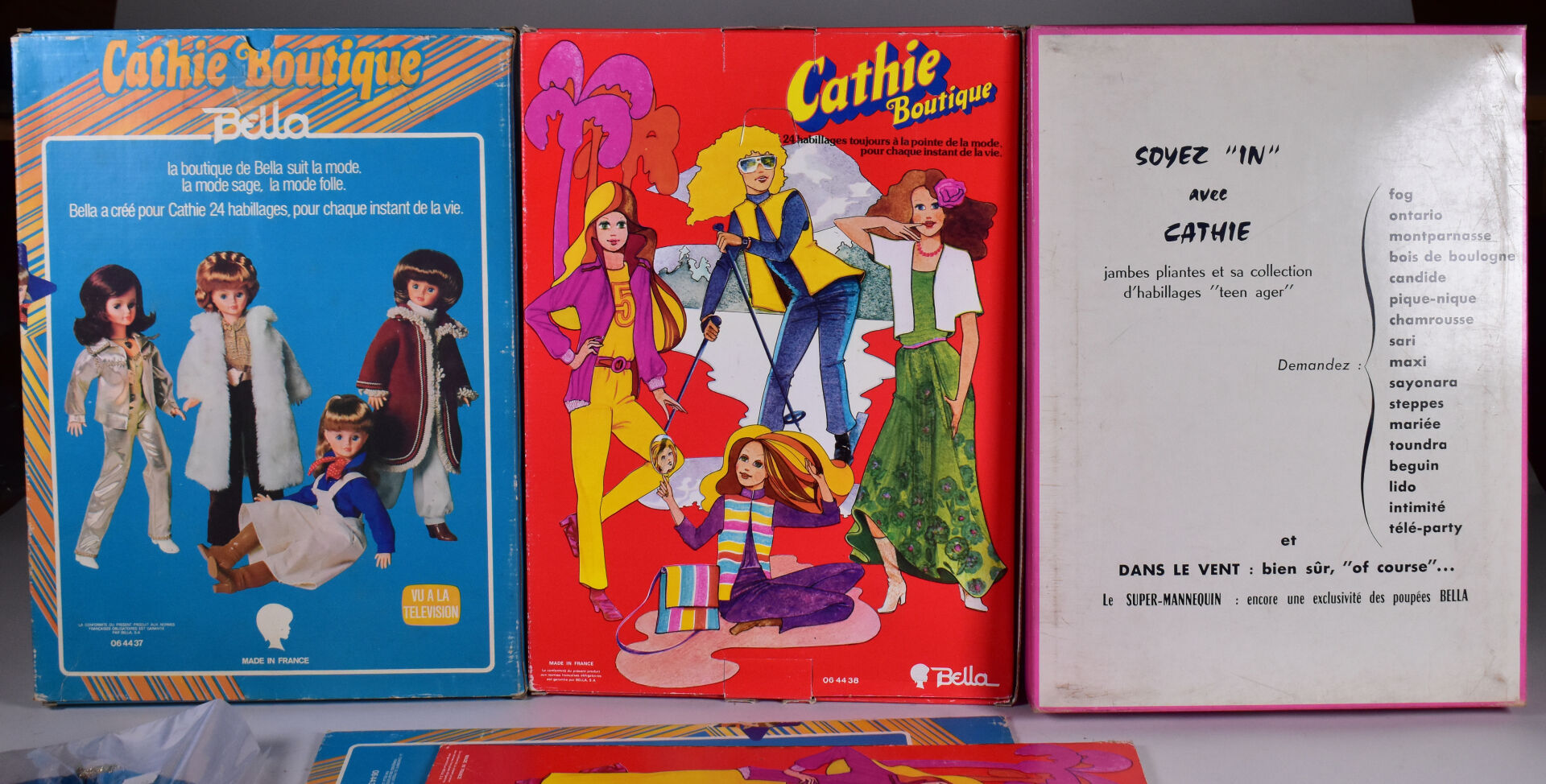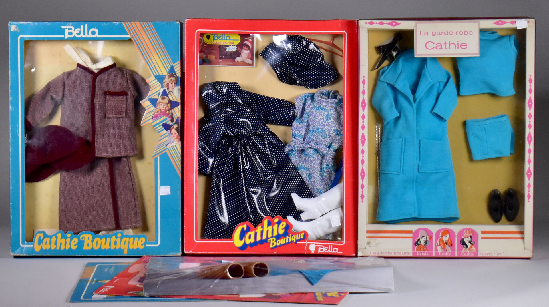 Lot de 3 vêtements de Cathy Bella sous blister dont Soyer IN avec Cathy, Cathy boutique (2) on y joint y joint deux plaques en carton Cathy boutique et 1 vêtement sous blister neuf sans cartonnage