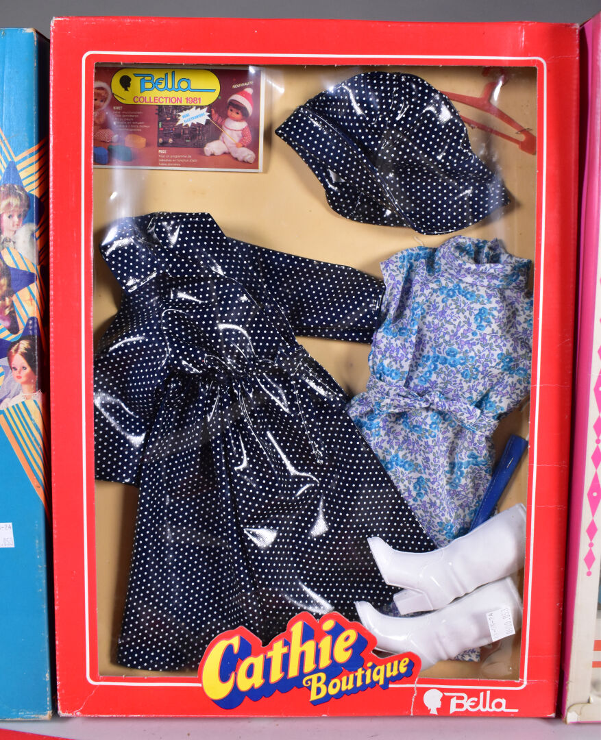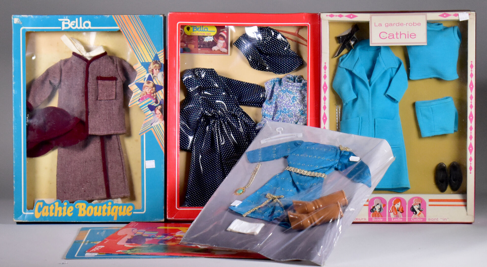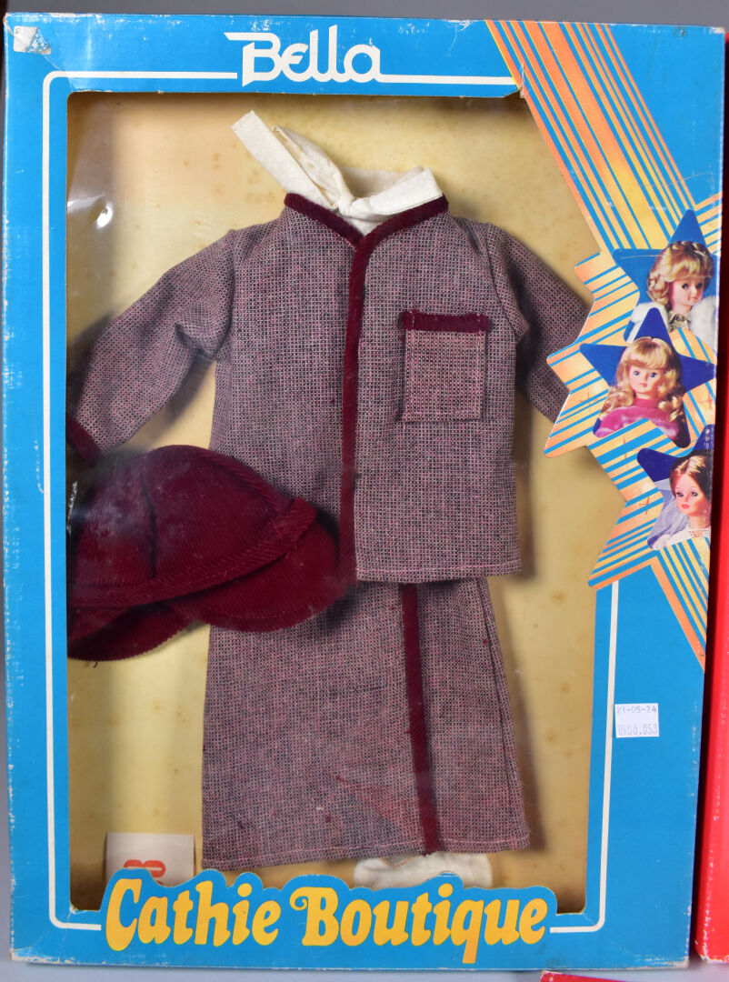 Lot de 3 vêtements de Cathy Bella sous blister dont Soyer IN avec Cathy, Cathy boutique (2) on y joint y joint deux plaques en carton Cathy boutique et 1 vêtement sous blister neuf sans cartonnage