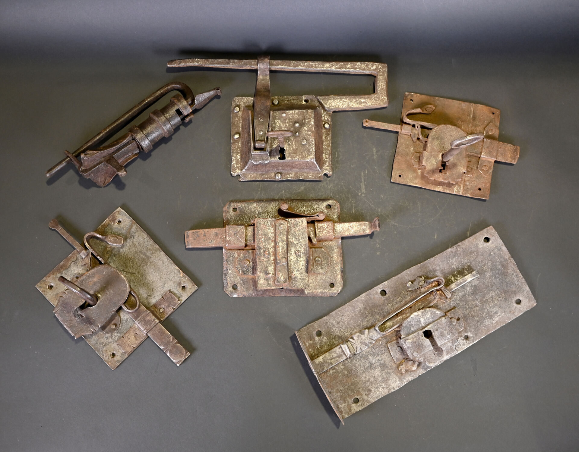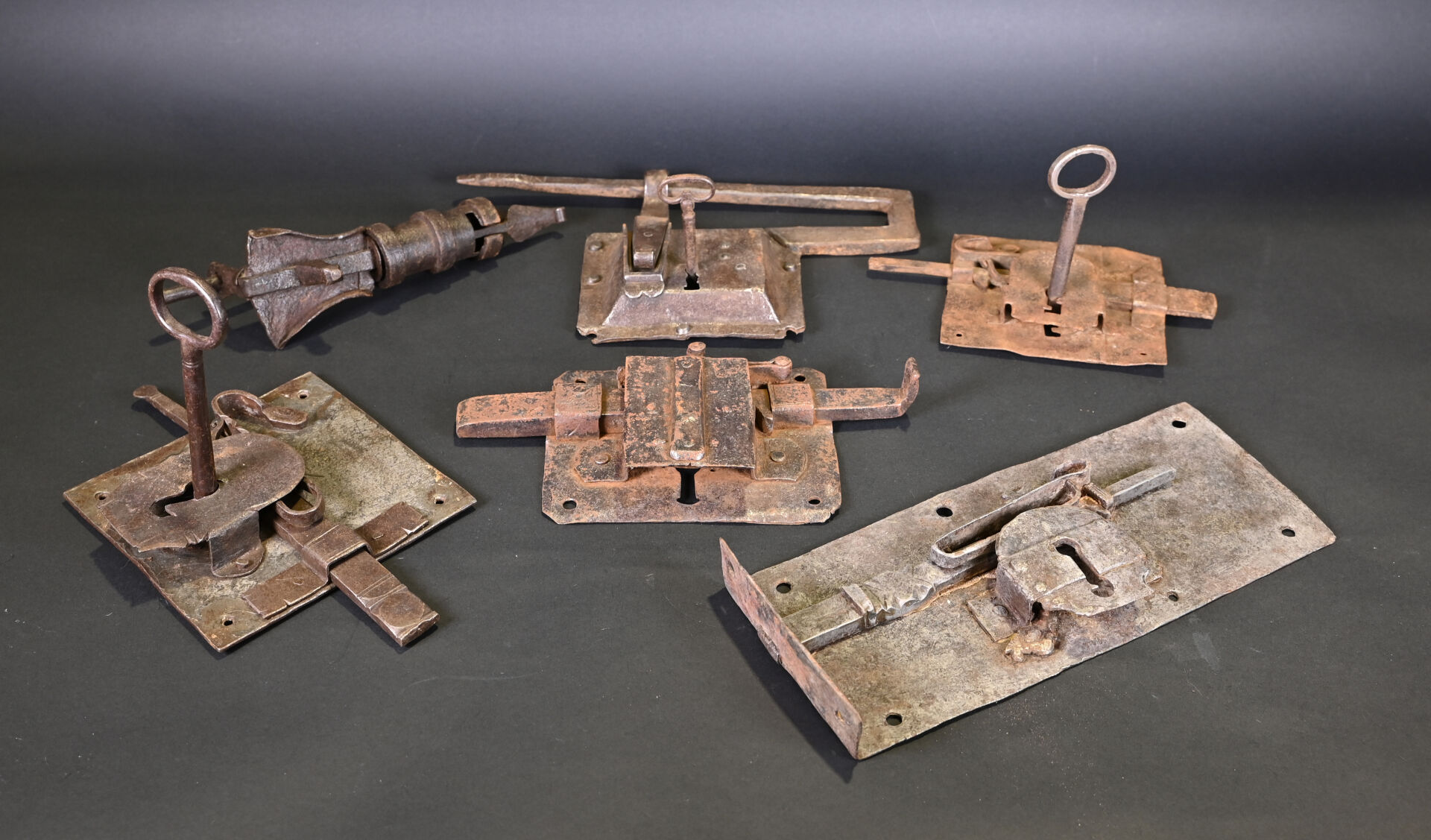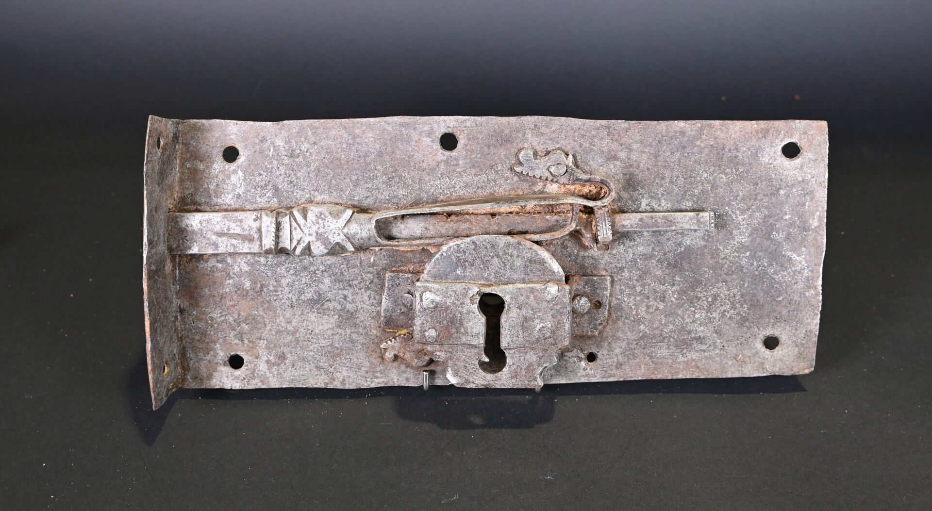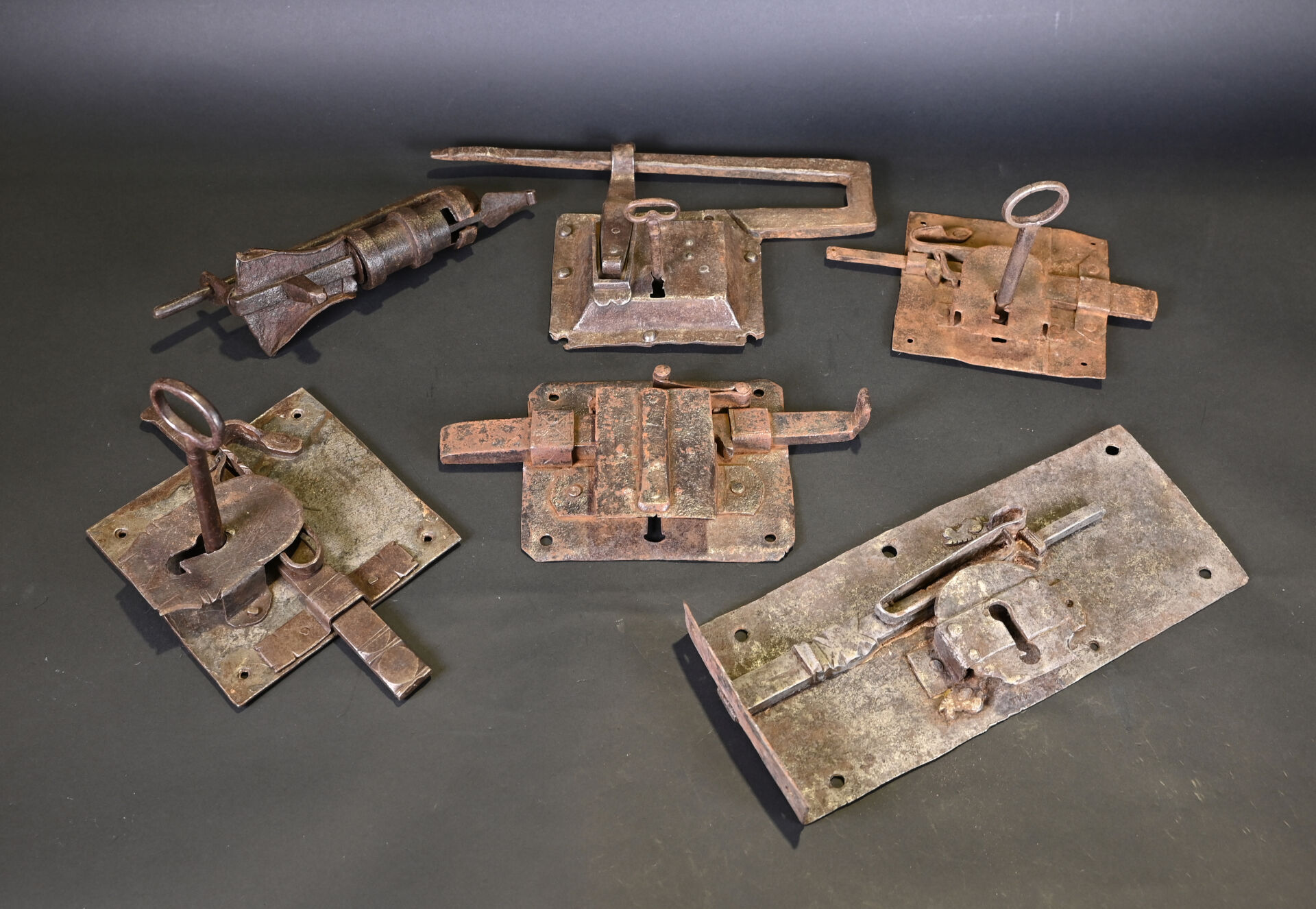 Lot de 4 serrures et 2 cadenas. En fer forgé. Dont un cadenas népalais (à corps cylindrique) et un cadenas à moraillon, à corps rectangulaire, riveté, avec une clé et quatre serrures de porte, dont deux avec une clé. XVIIIème et XIXème siècles. État : rouille, corrosion, accidents et manques.