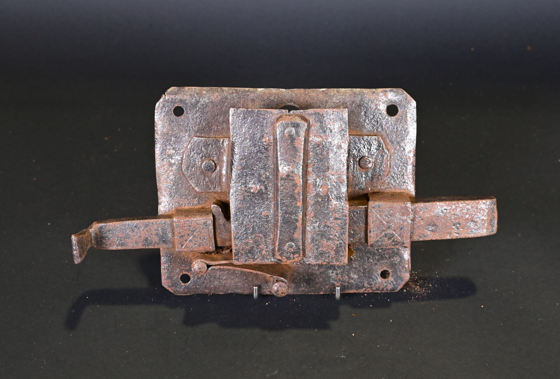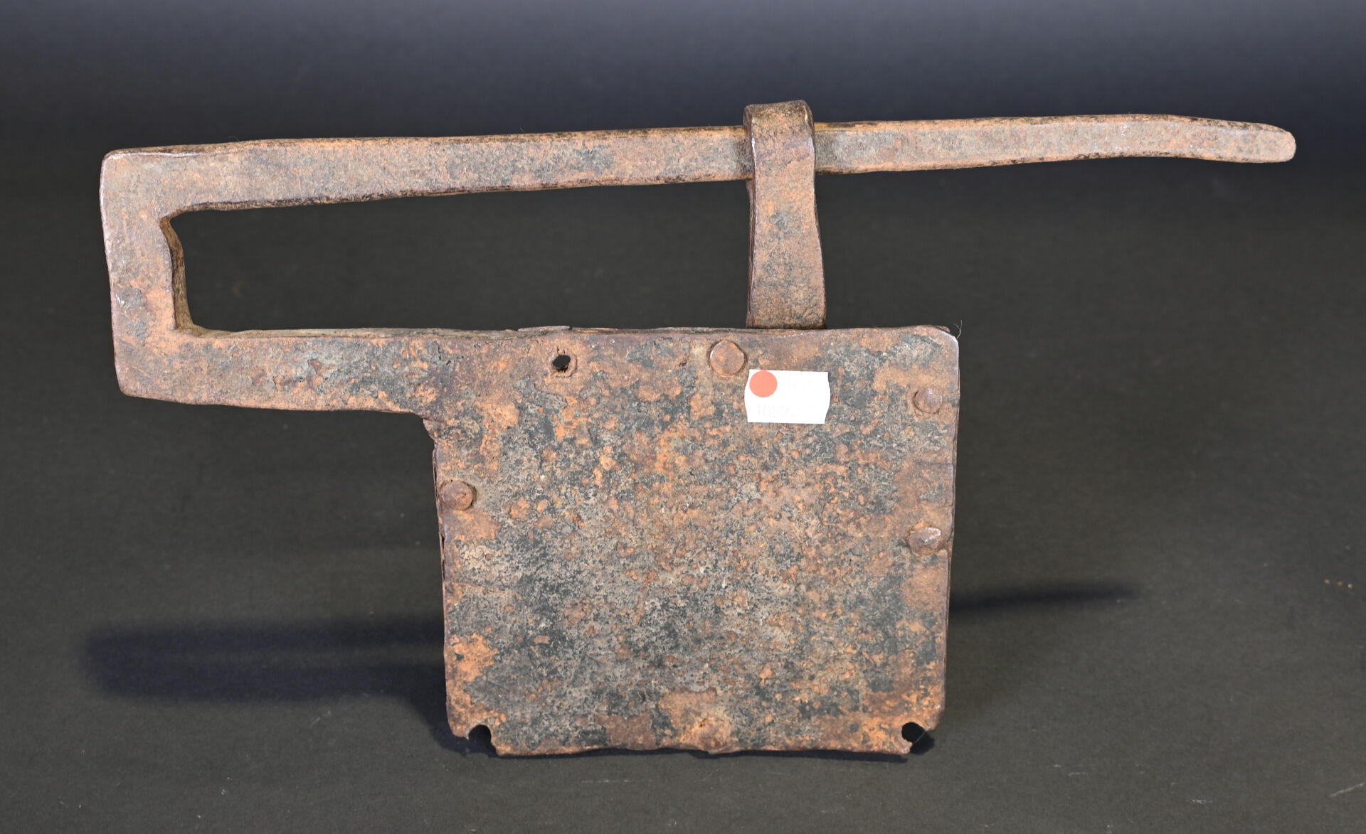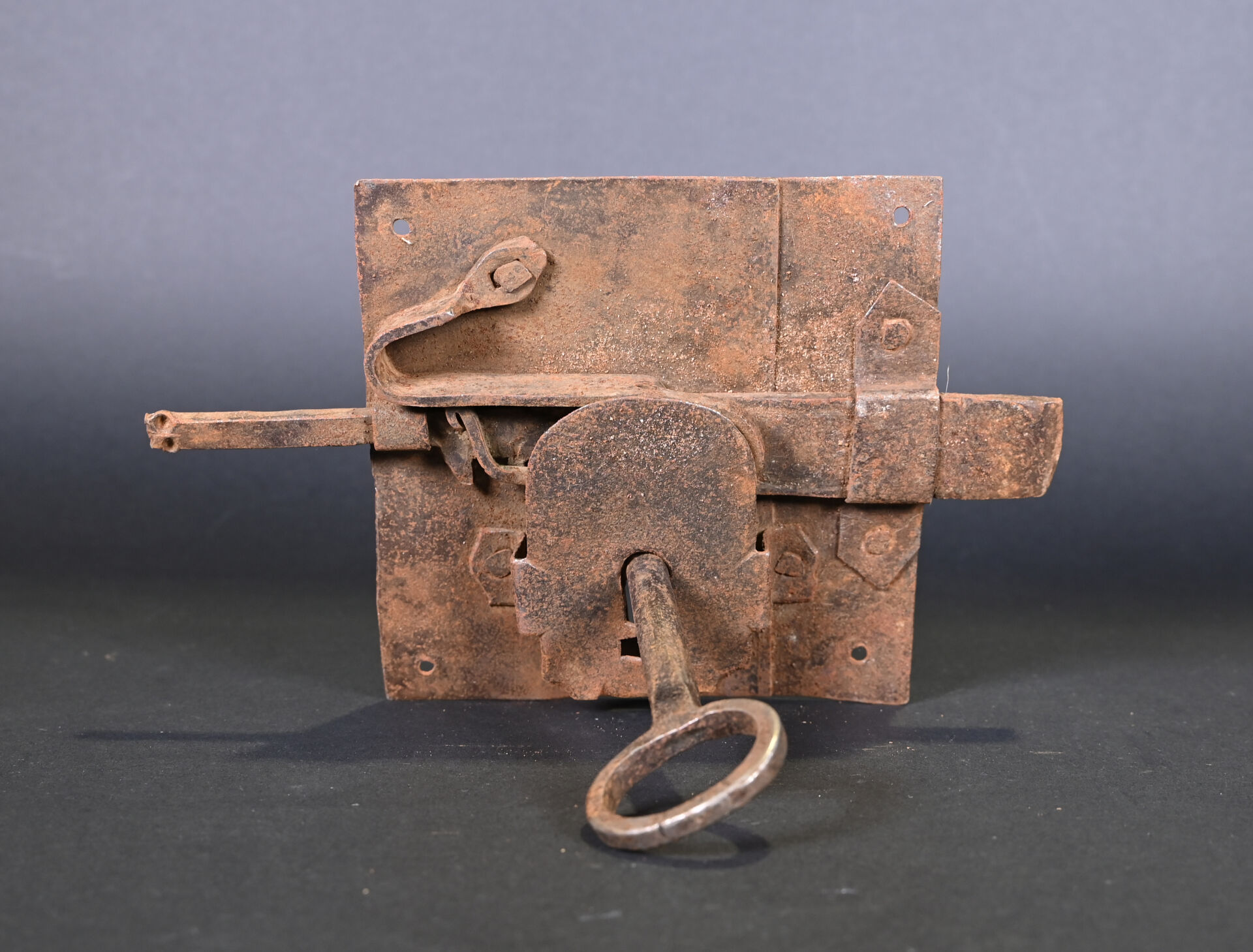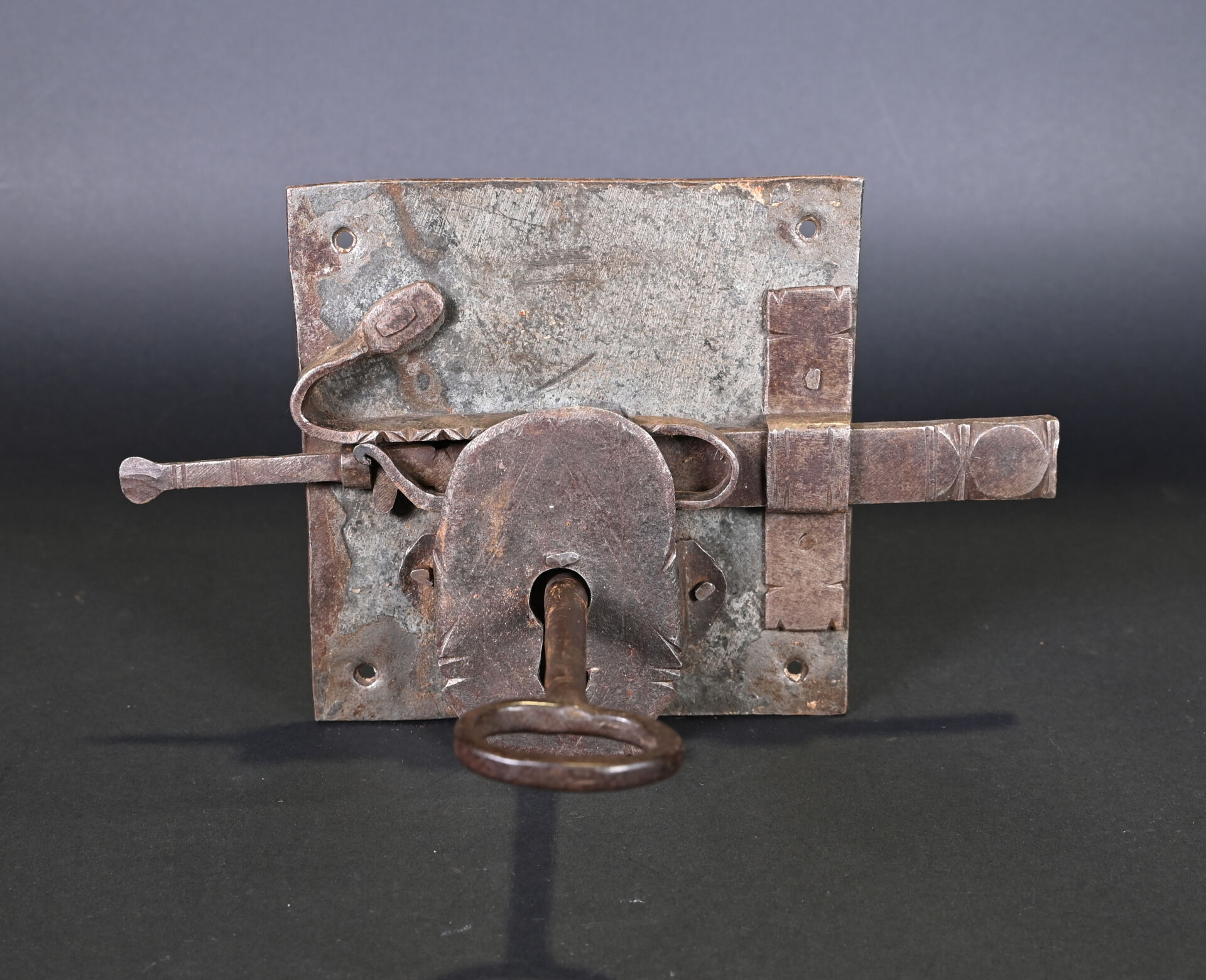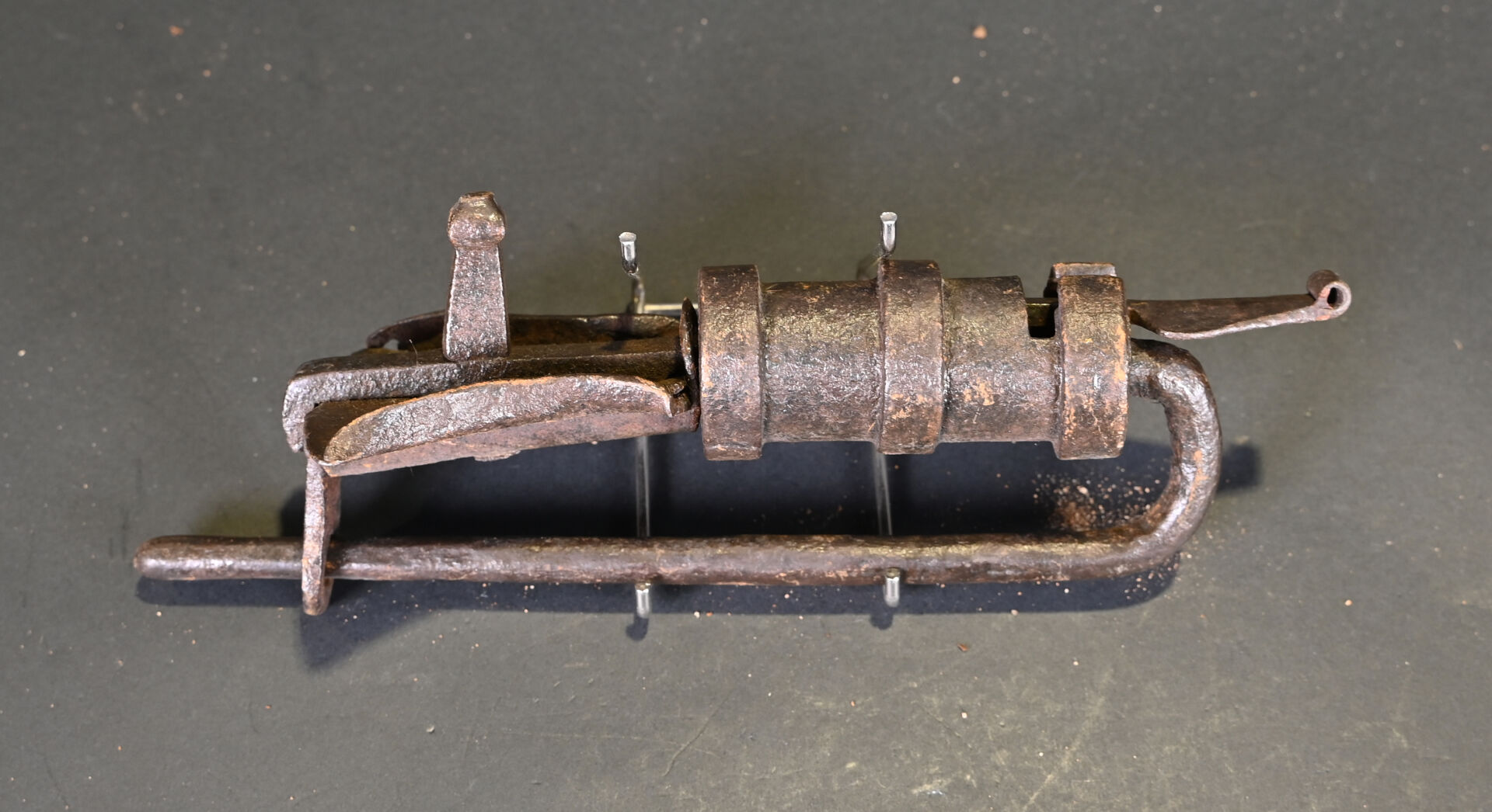 Lot de 4 serrures et 2 cadenas. En fer forgé. Dont un cadenas népalais (à corps cylindrique) et un cadenas à moraillon, à corps rectangulaire, riveté, avec une clé et quatre serrures de porte, dont deux avec une clé. XVIIIème et XIXème siècles. État : rouille, corrosion, accidents et manques.