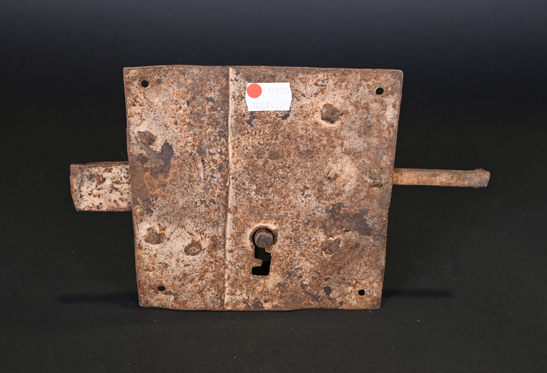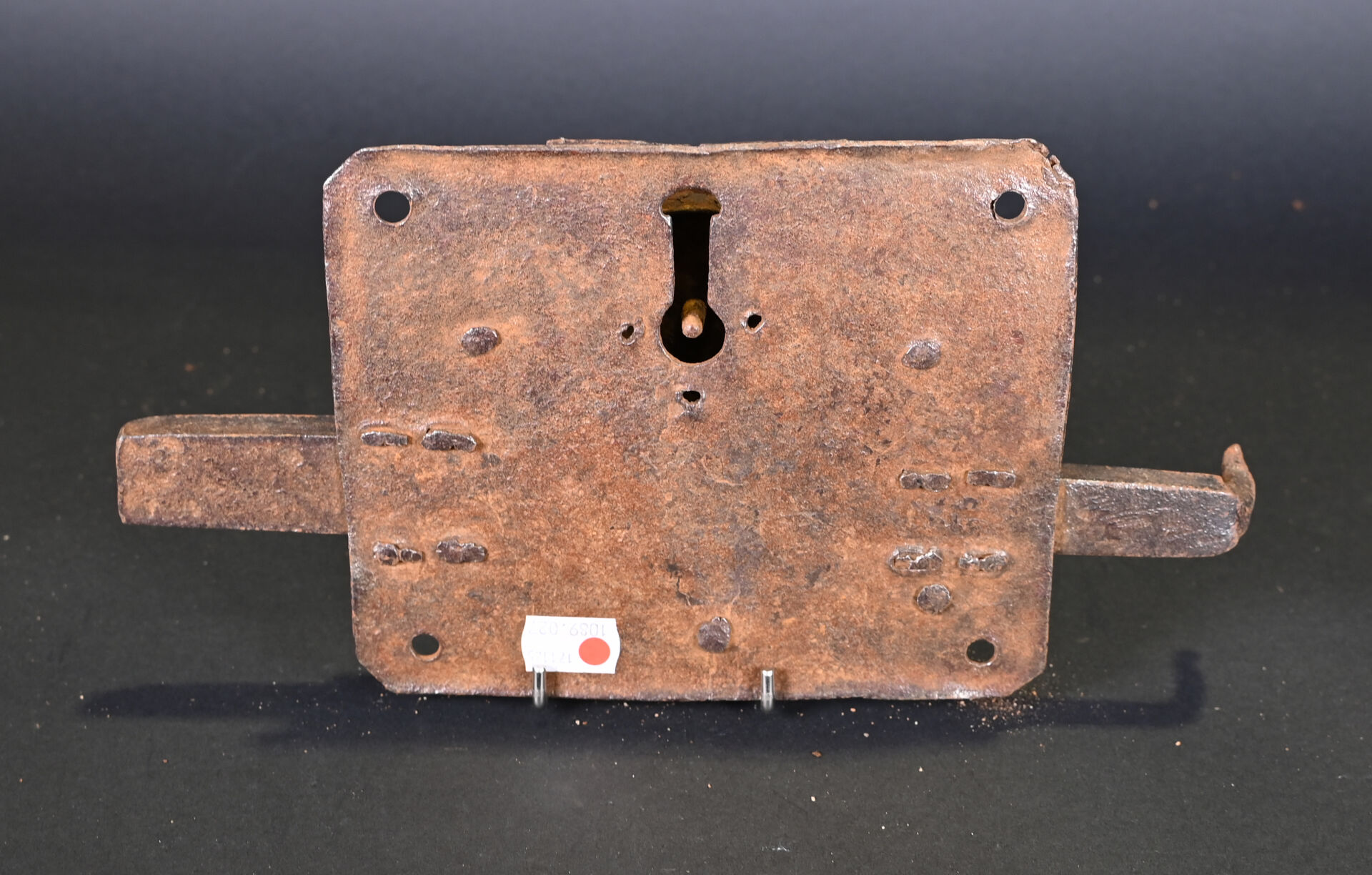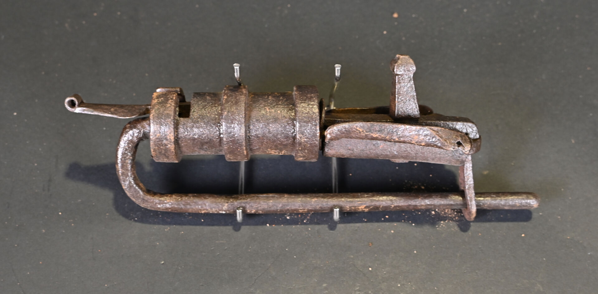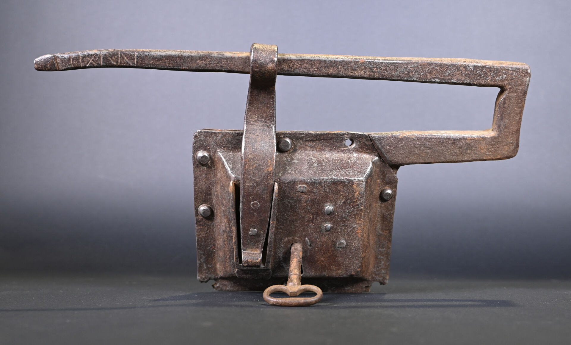 Lot de 4 serrures et 2 cadenas. En fer forgé. Dont un cadenas népalais (à corps cylindrique) et un cadenas à moraillon, à corps rectangulaire, riveté, avec une clé et quatre serrures de porte, dont deux avec une clé. XVIIIème et XIXème siècles. État : rouille, corrosion, accidents et manques.