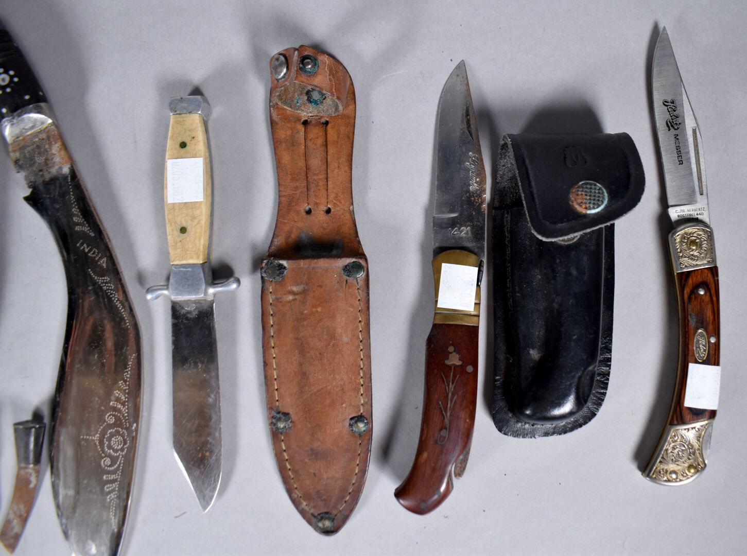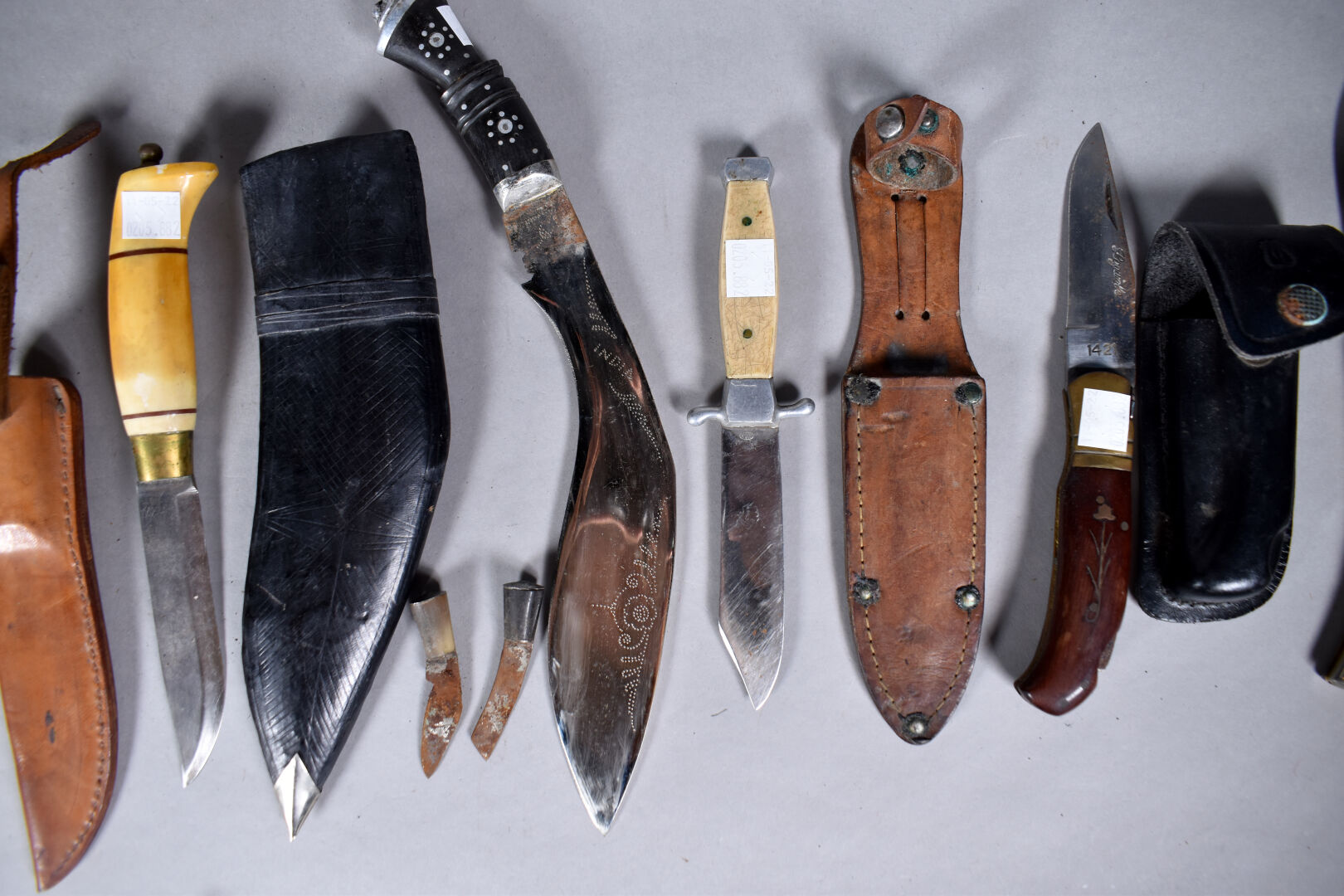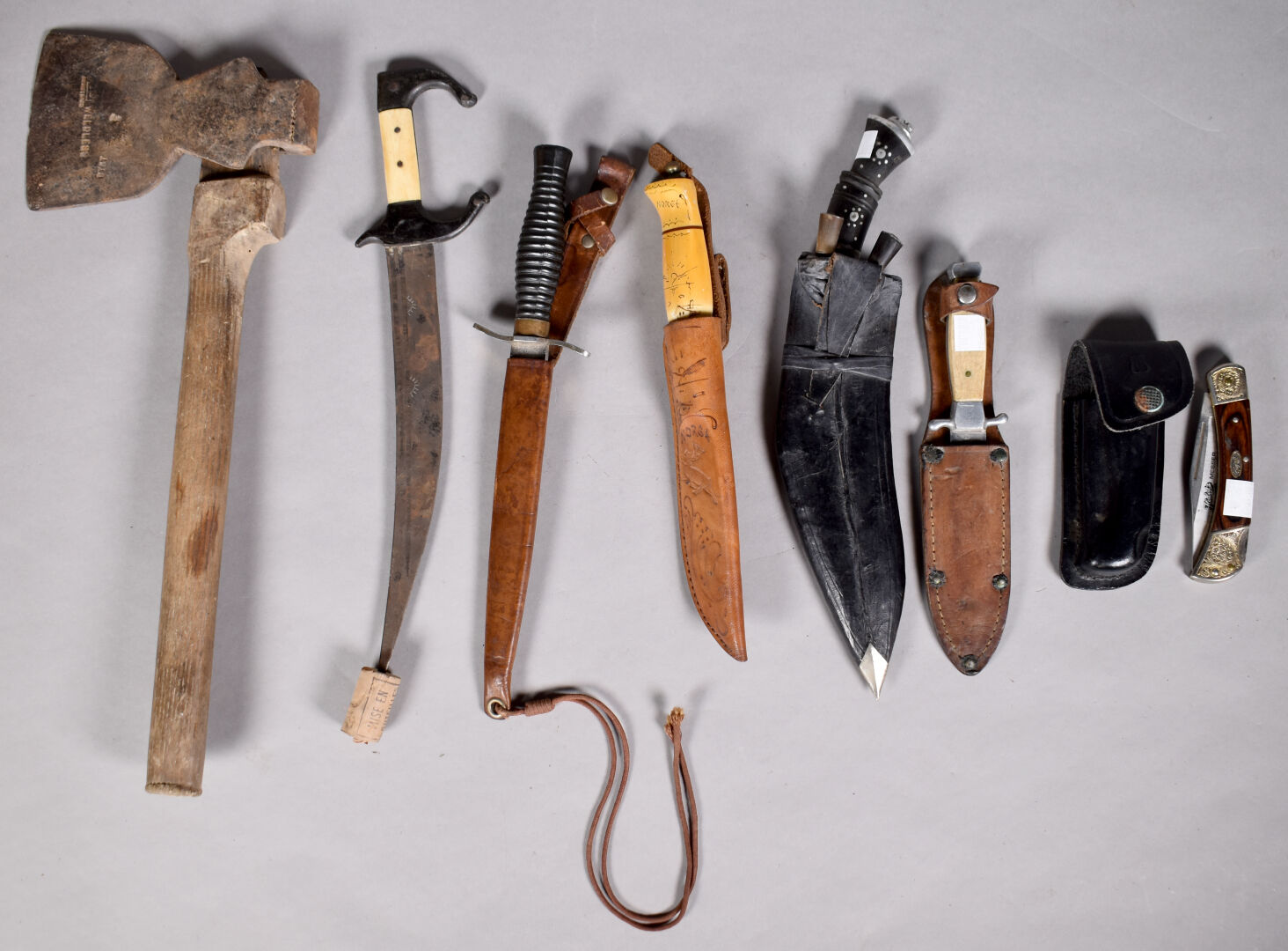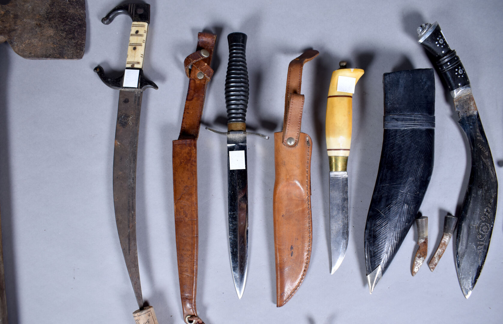 Lot de 8 armes blanches dont une hache datée 1918, un pukko, un kukris et divers couteaux moderne. Etat 2