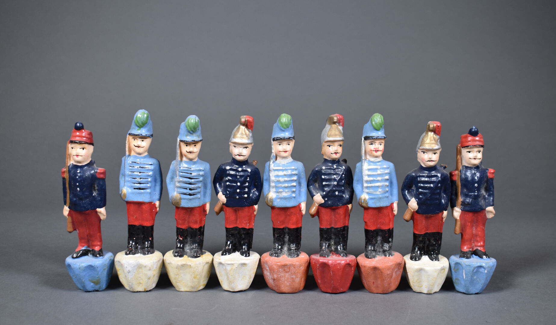 Lot de 9 quilles en composition circa 1900. Fabrication type Bon Dufour bel état trace de repeints.
