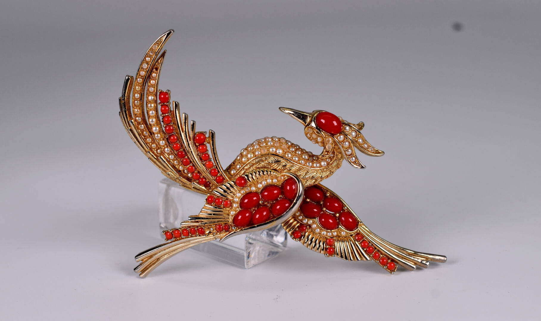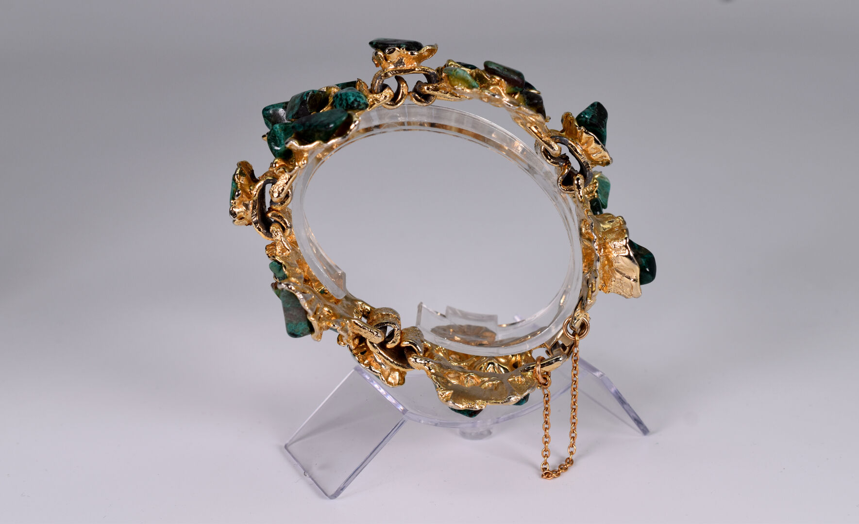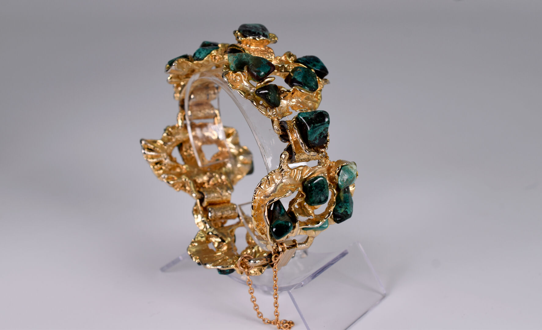 Lot de bijoux fantaisie soit deux bracelets, un orné de malachites, quatre broches à motif animalier et une gerbe à perle.