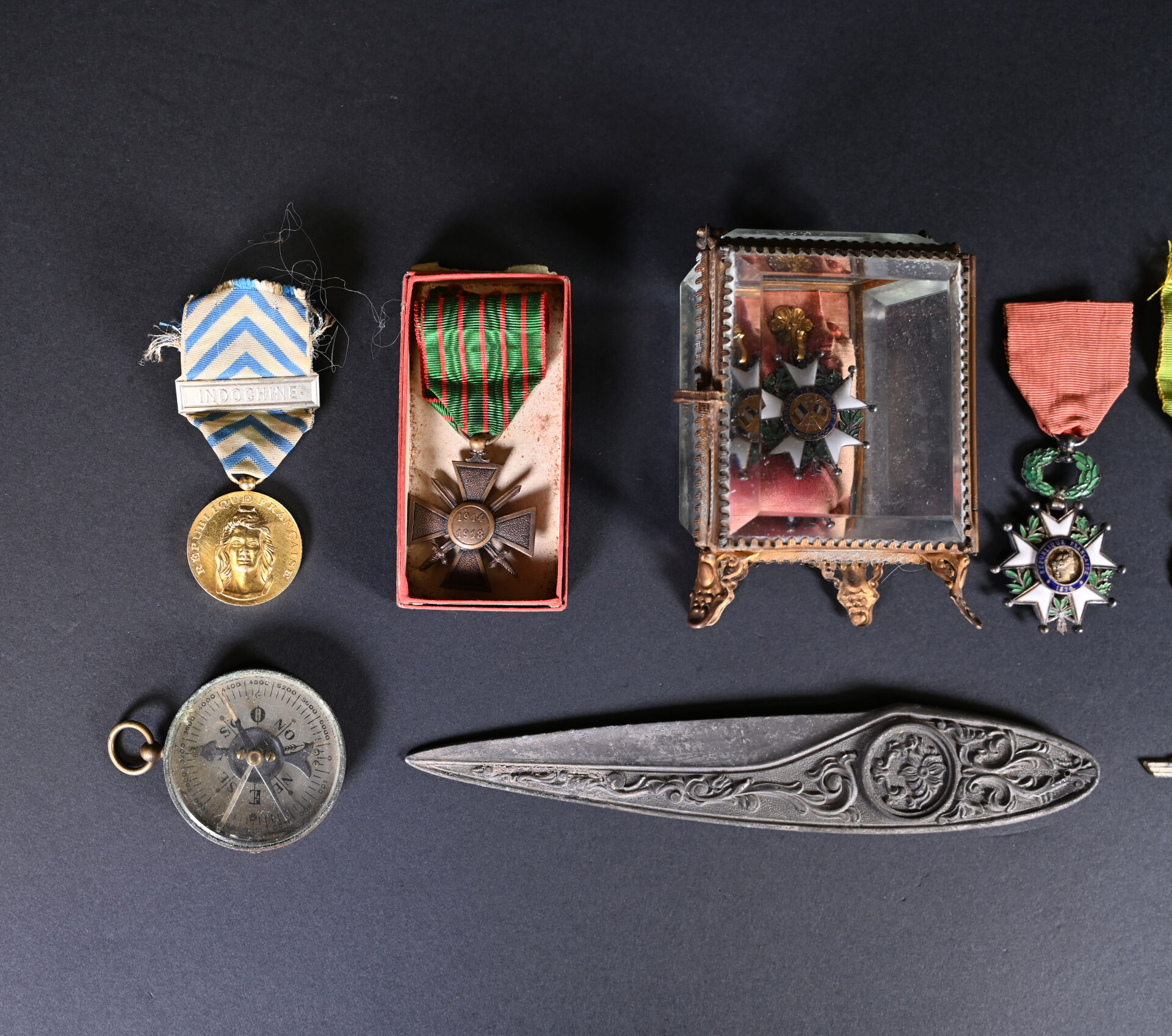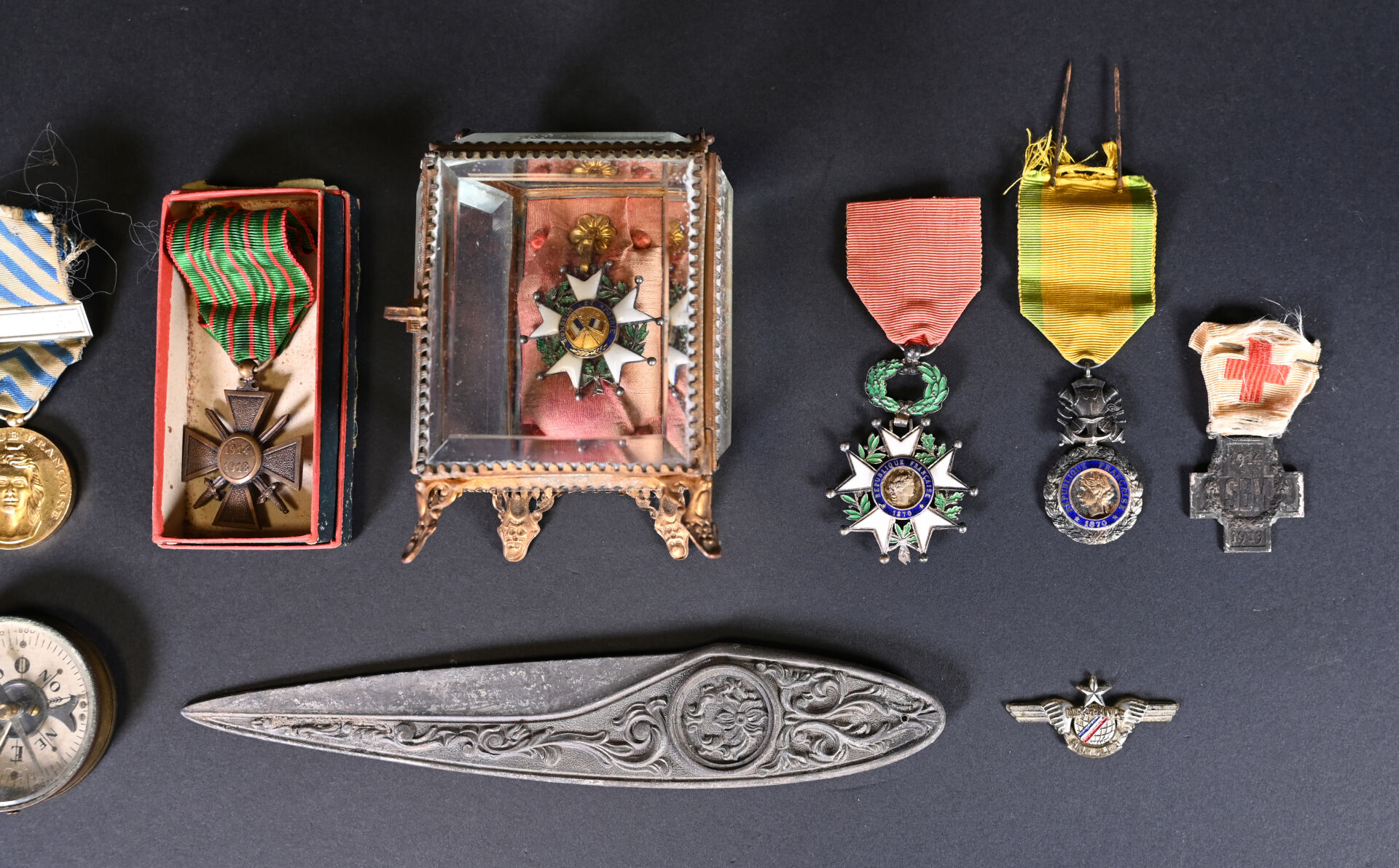 Lot de décorations diverses françaises, on y trouve une médaille de la Reconnaissance de la Nation, barrette Indochine, une médaille de la Croix-Rouge, une croix de Guerre 14-18 dans sa boite, une médaille militaire, une étoile de Chevalier de la Légion d’Honneur type IIIe République avec ruban insolé, et dans un porte-montre vitré, une étoile de Chevalier de la Légion d’Honneur IIIe République sans ruban, et une boussole en laiton, ainsi qu’un coupe-papier du 35e Régiment d’Artillerie. On y ajoute un insigne Air France de jeune pilote.