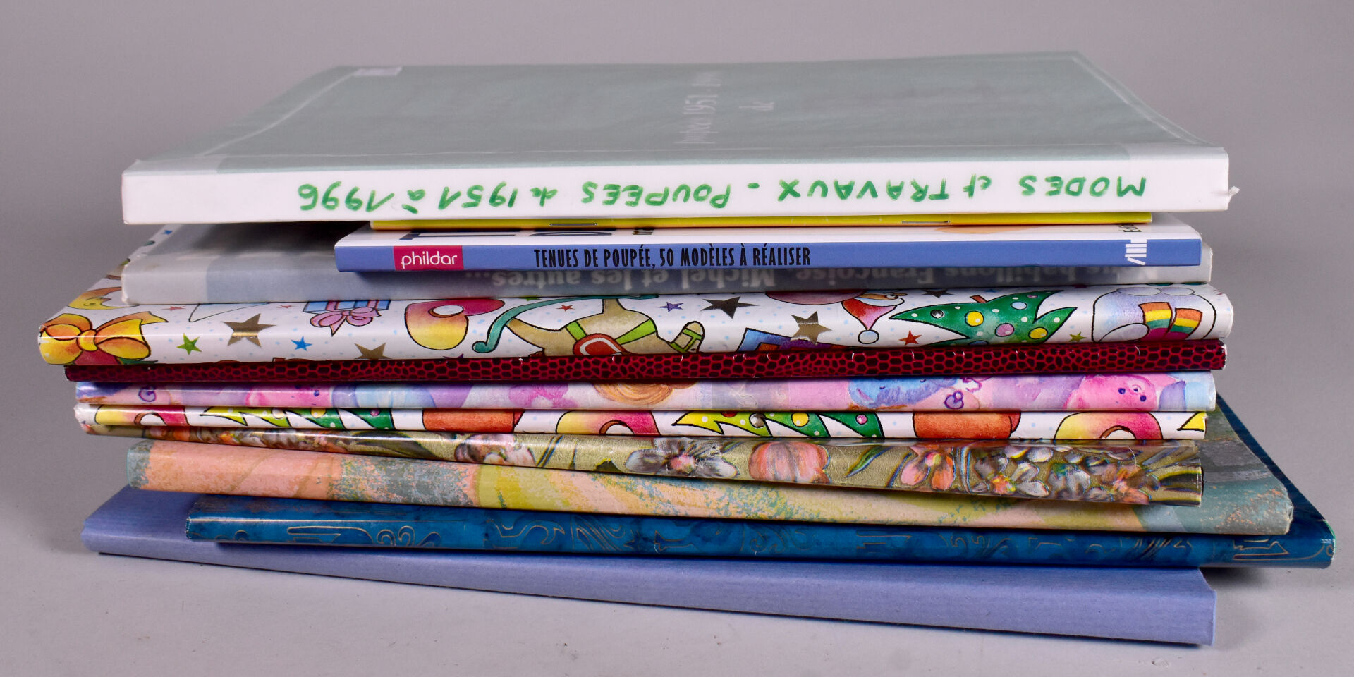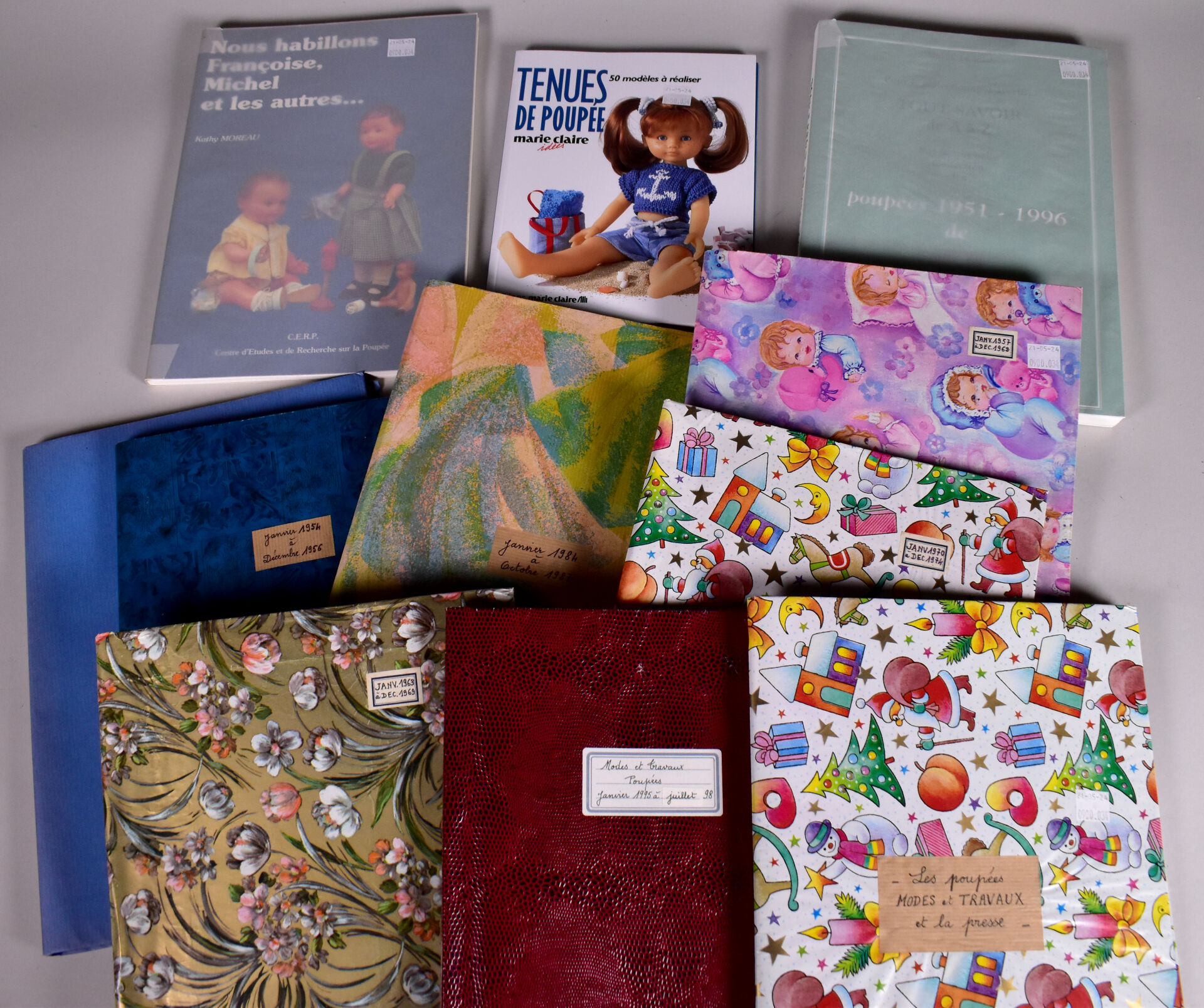 Lot de documentations, livres sur les poupées de mode et travaux dont : nous habillons Françoise Michel et les autres CERP, patrons et coupures d journaux de Mars 1951 à juillet 1998 important lot de patrons d’origines rangés dans des portes folios, livre de Michel Lieutaud tout savoir de A à Z sur la très belle collection des poupées de modes et travaux1951/1996