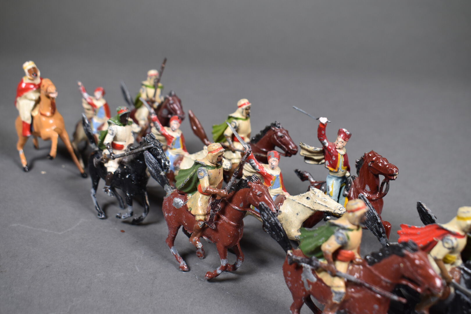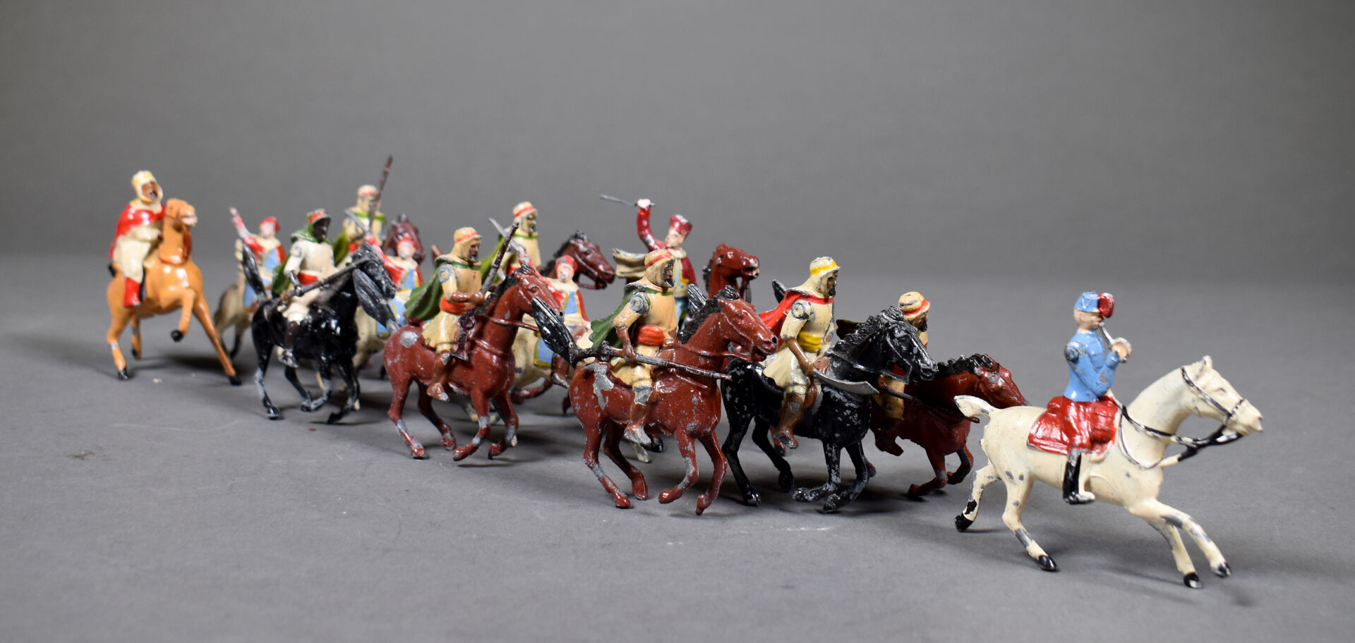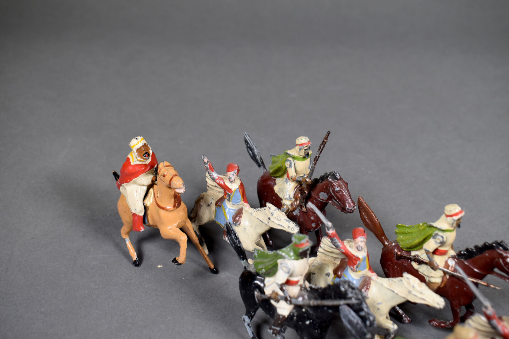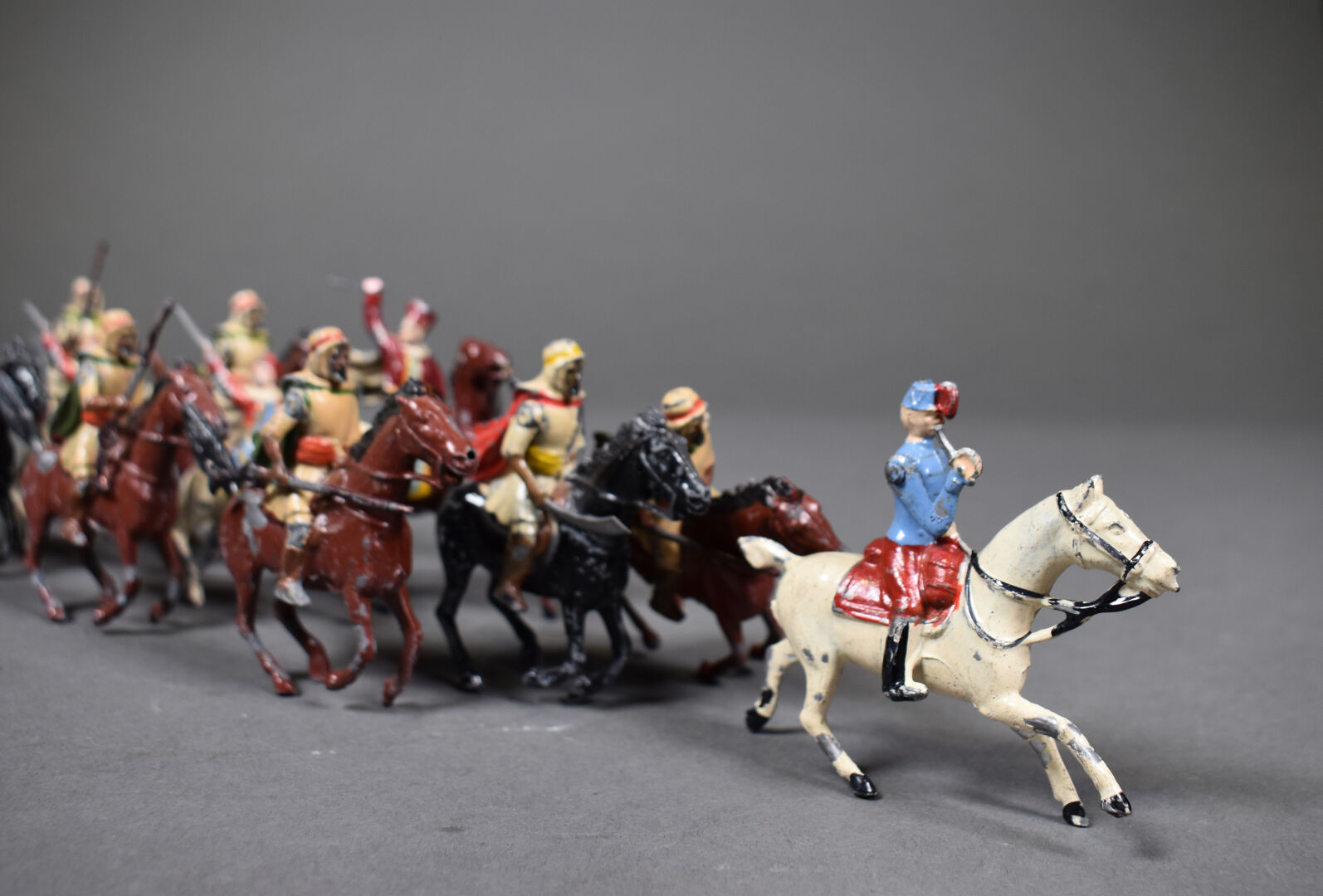 Lot de figurines de plomb creux années 30/50 en état d’usage avec accident, cavaliers berbères, spahis et divers Certains monoblocs d’autres non. Bras articulé britains ? 13 pièces.