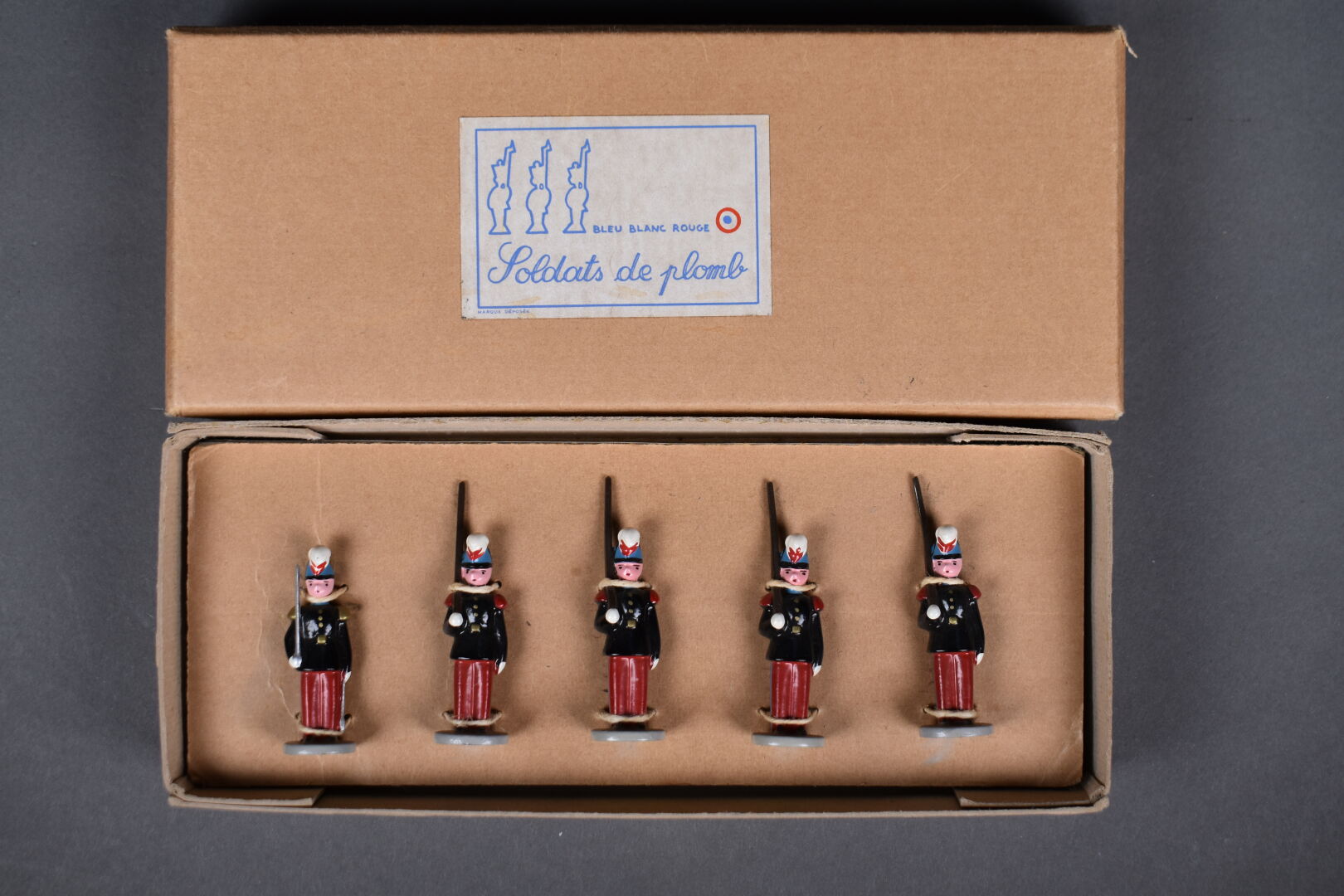 Lot de figurines de plomb récentes représentant essentiellement l’école de Saint-Cyr, diverses fabrication au total 35 pièces. On joint un lot de curieuses petites figurines de plomb 50 millimètres sur socle rond 62 pièces marque Bleu Blanc Rouge et un lot de 6 pièces en boite.