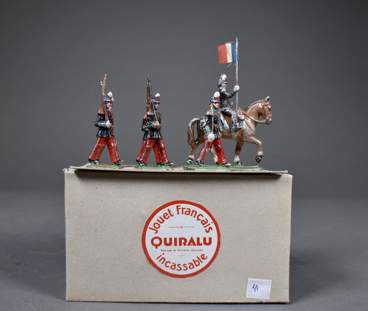 On joint une boîte réédition actuelle jouet français Quiralu, incassable contenant 6 Saint-Cyrien en état d’usage.