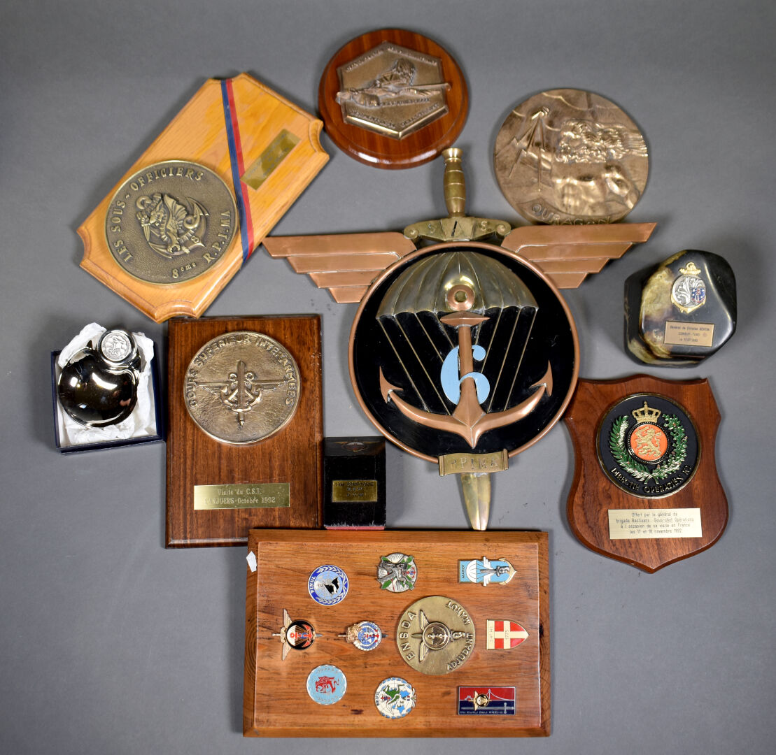 Lot de six cartons de souvenirs militaire, tape de bouche en bronze sur socle bois verni et divers. Etat 1