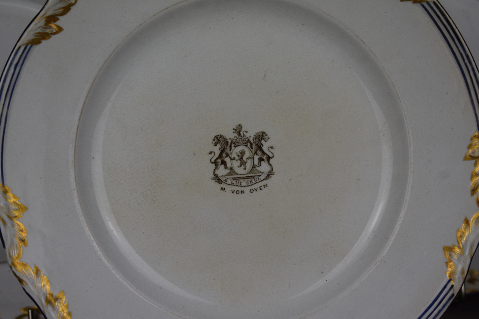 Lot de trois assiettes en faïence crème à liseré bleu et acanthes or, le centre du bassin orné d’un blason aux deux lions avec le nom et la devise M. VON OVEN « A lui seul ».