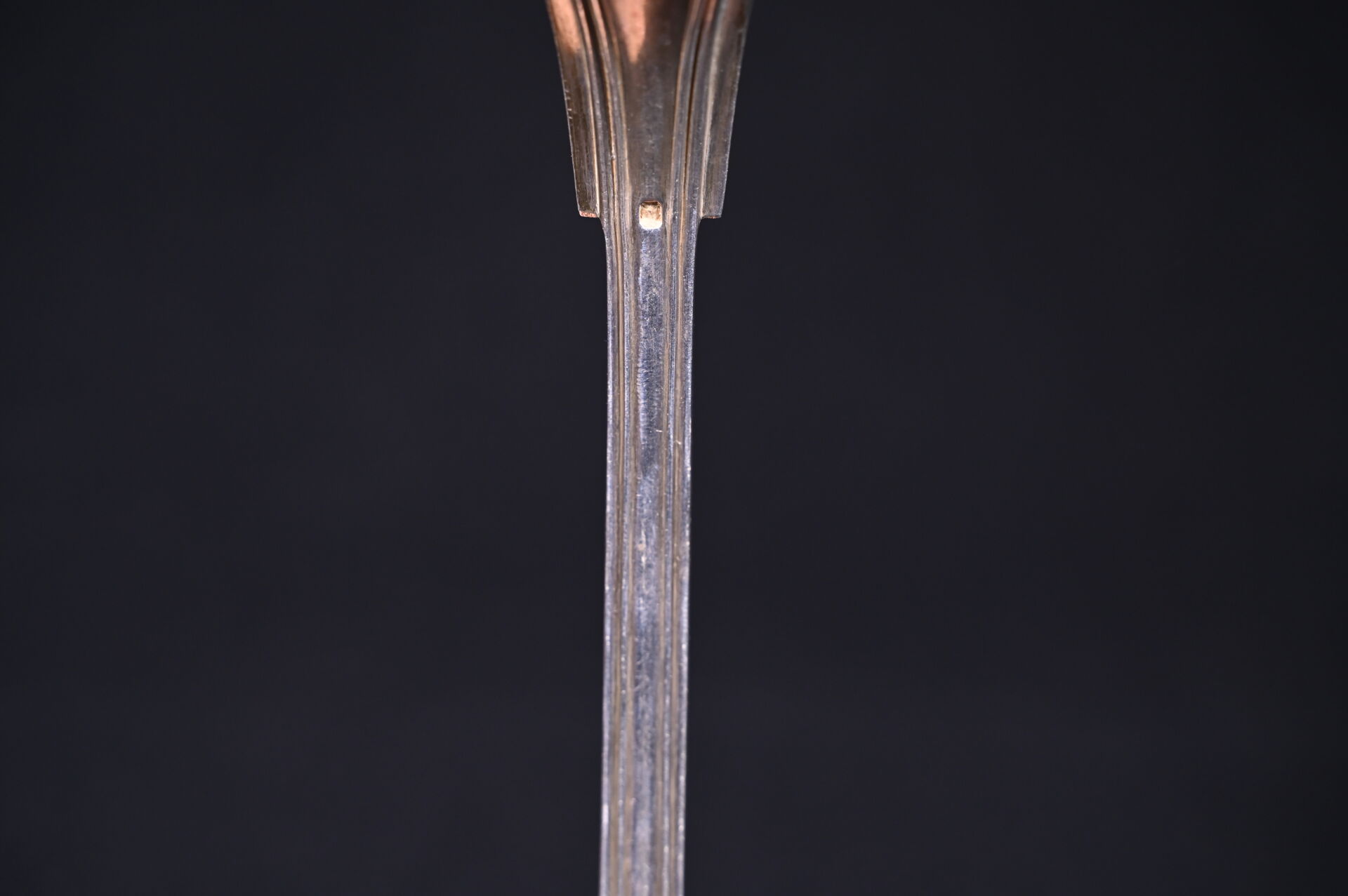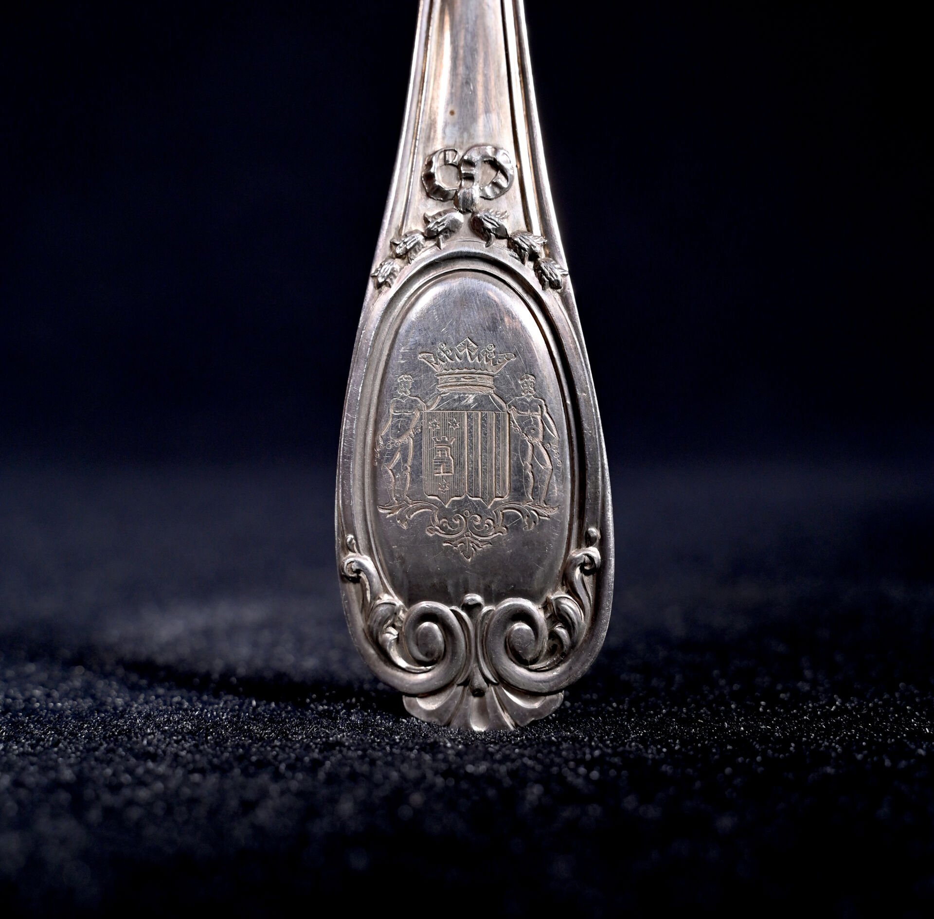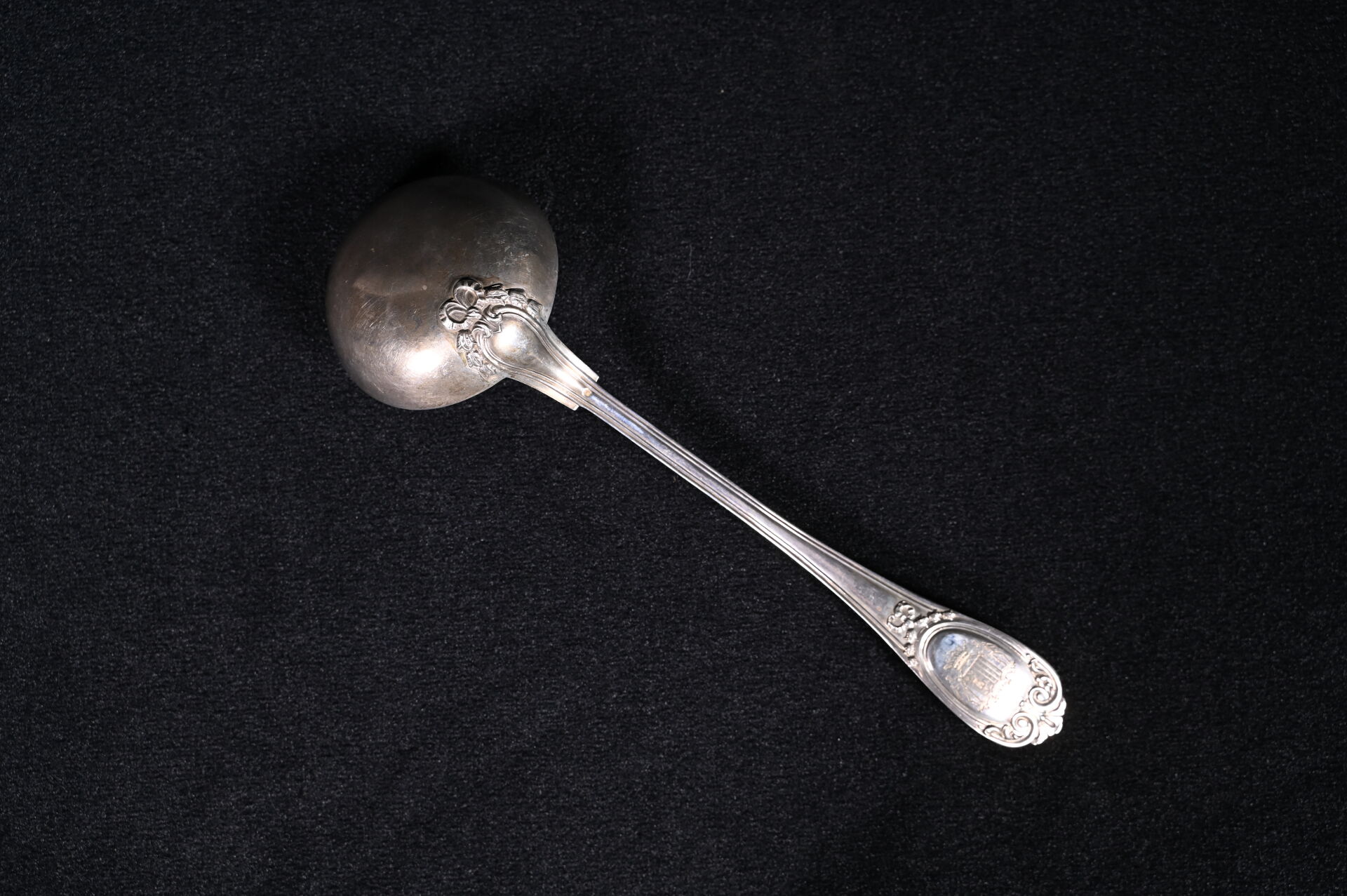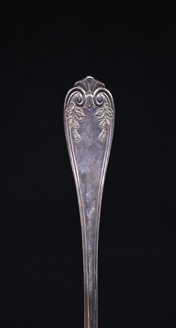 Louche en argent 800/1000e, (poinçon Minerve) la spatule à décor ciselé d’armoiries sous une couronne de Marquis. Poids. : 265 g.