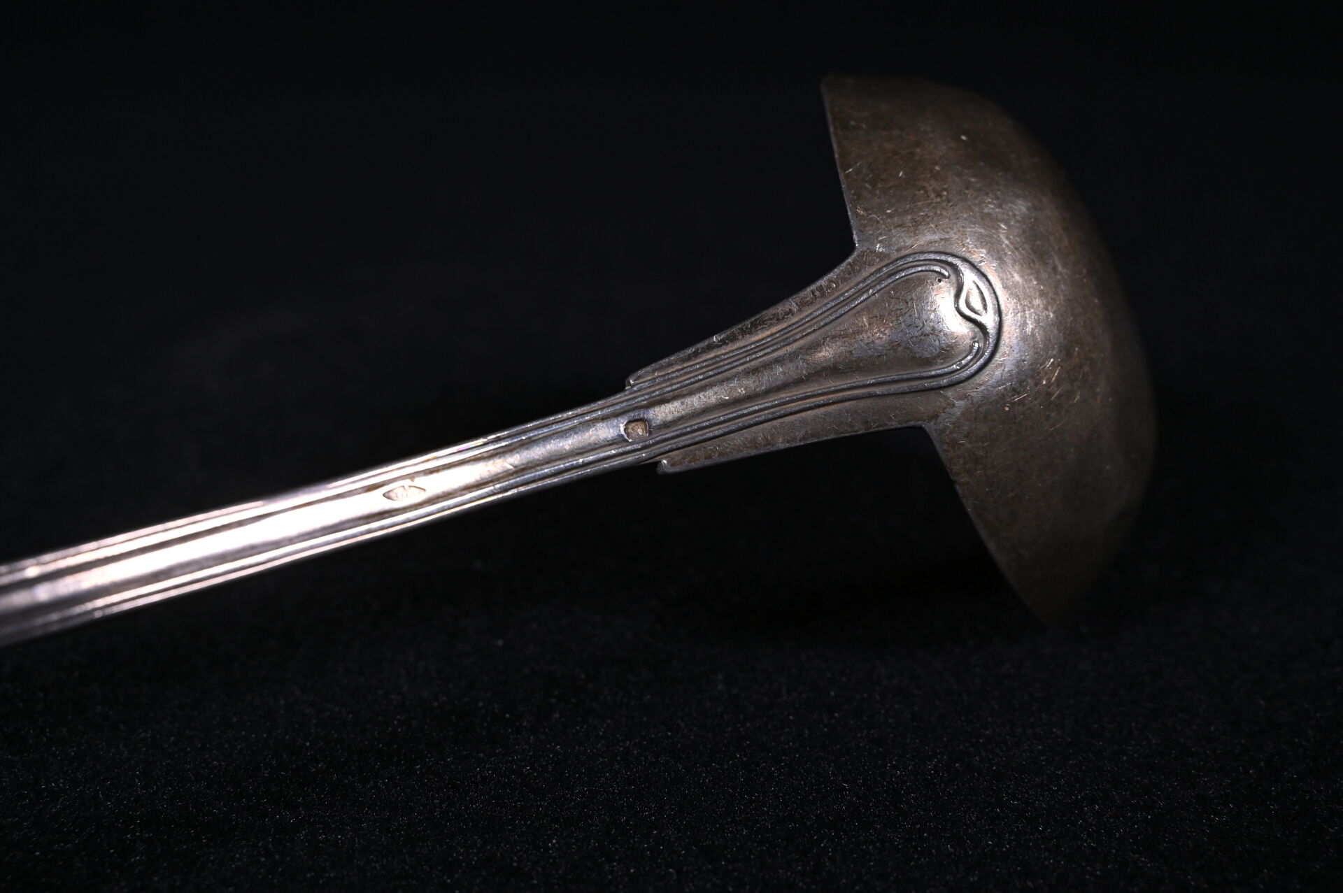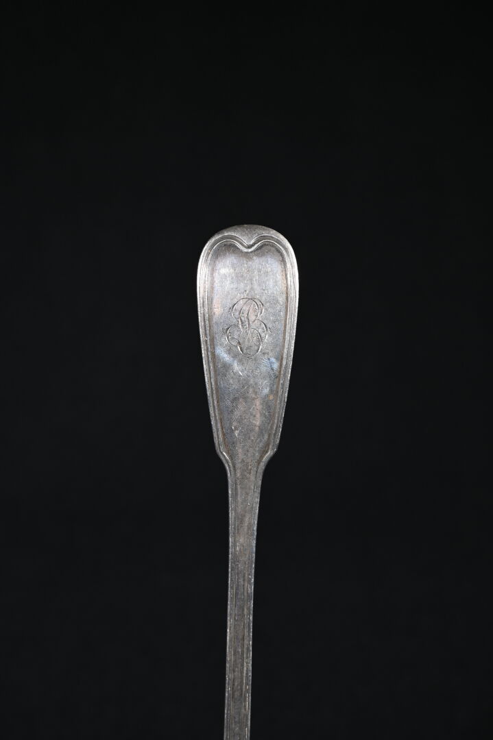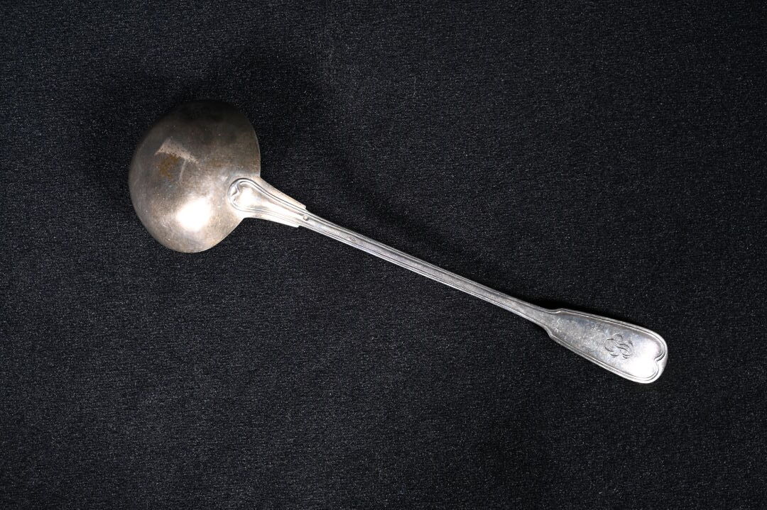 Louche en argent 925/1000e (poinçon Minerve) (déformations). Modèle à filet. Poids : 304 g.