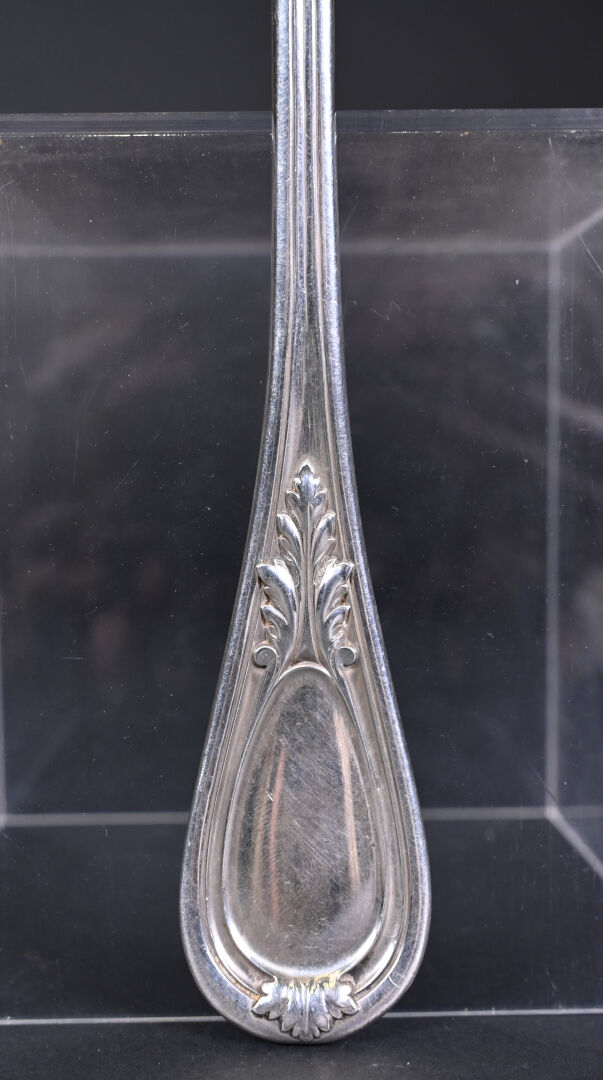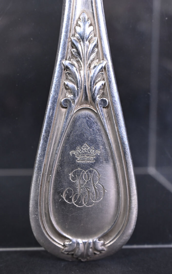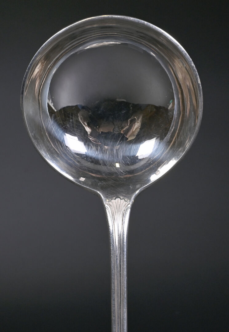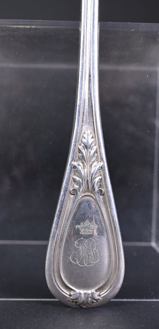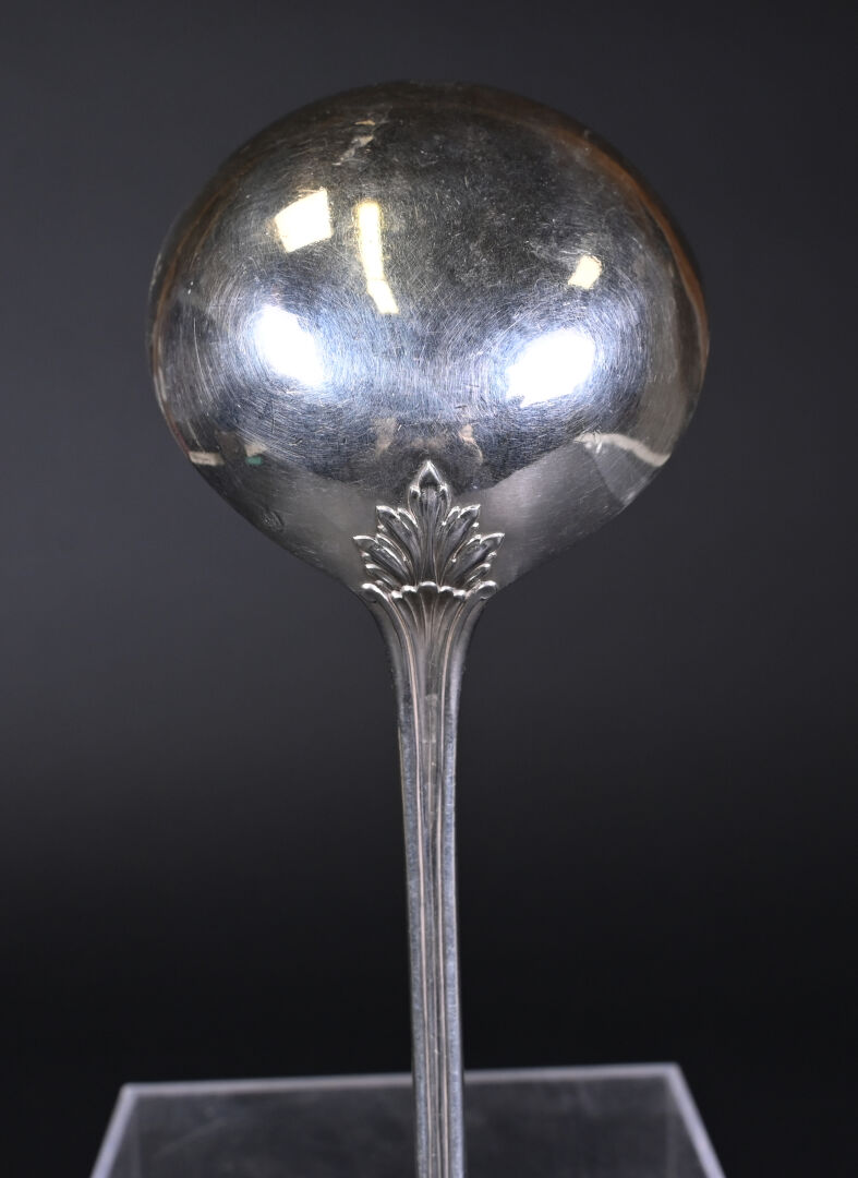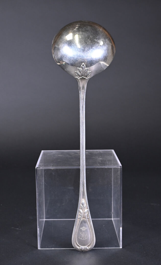 Louche en argent 925/1000e, (poinçon Minerve) la spatule ornée d’un médaillon chiffré sous une couronne de marquis. Poids : 256 g.