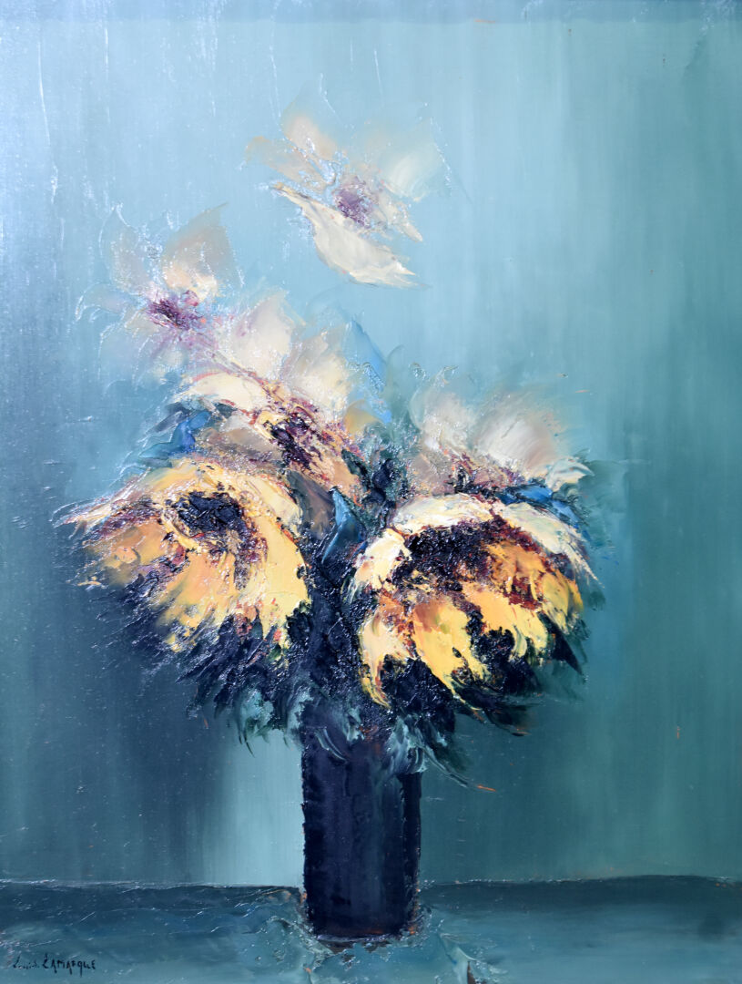 Louis LAMARQUE (Né en 1912). Bouquet de tournesols. Huile sur toile, signée en bas à gauche, contre signée et titrée au dos. 65,5 x 50 cm.