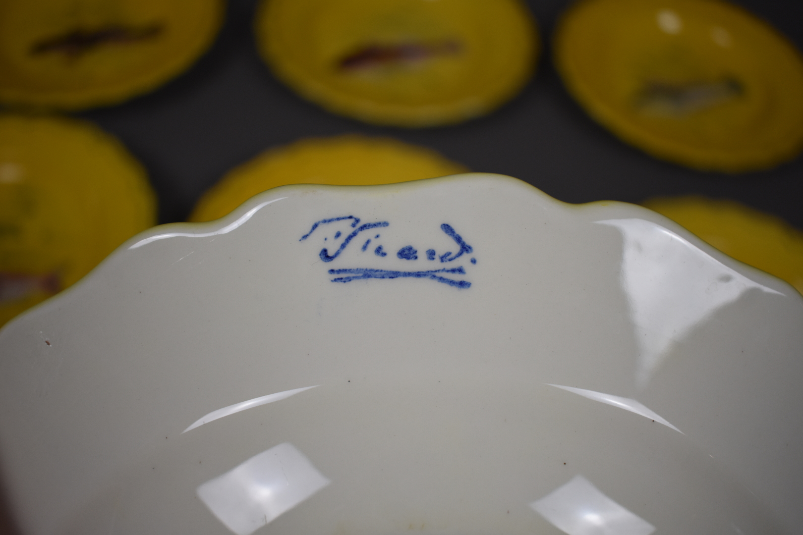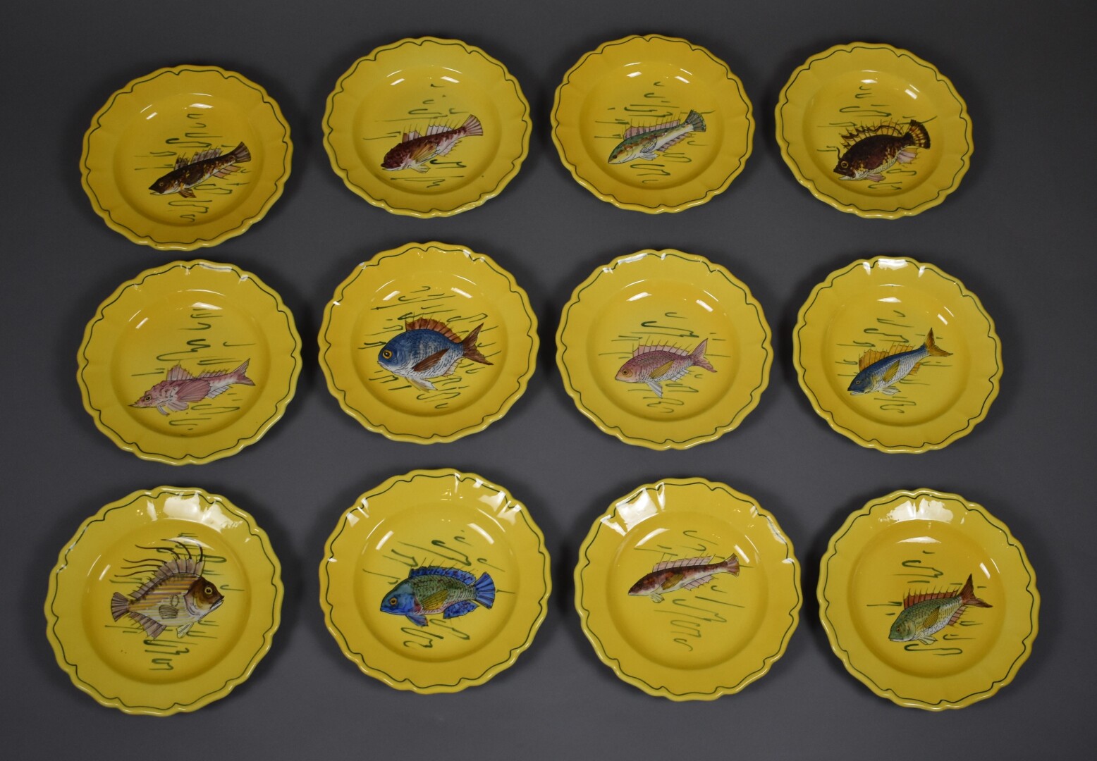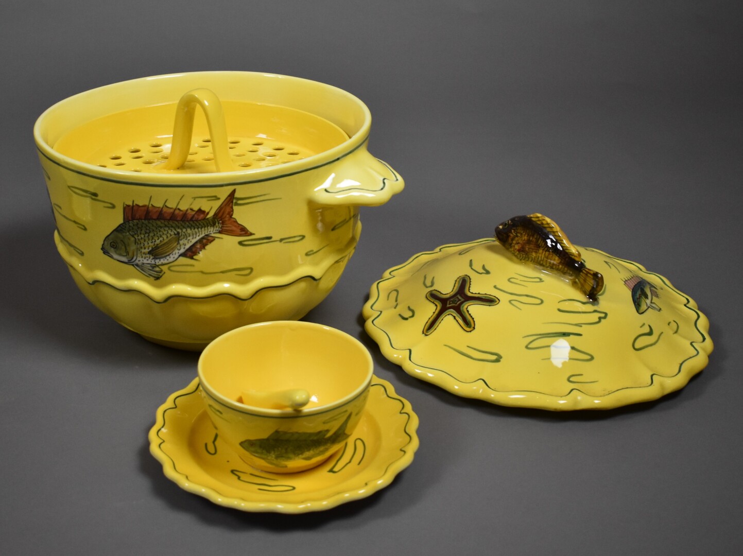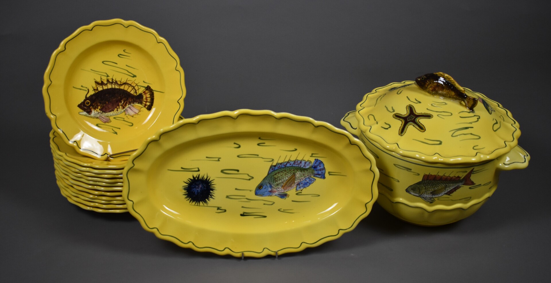 Louis SICARD. Service à bouillabaisse en faïence jaune à décor de poissons comprenant une grande soupière et son panier passoire, douze assiettes creuses, un plat ovale, le bol à rouille et sa cuillère. Marqués.