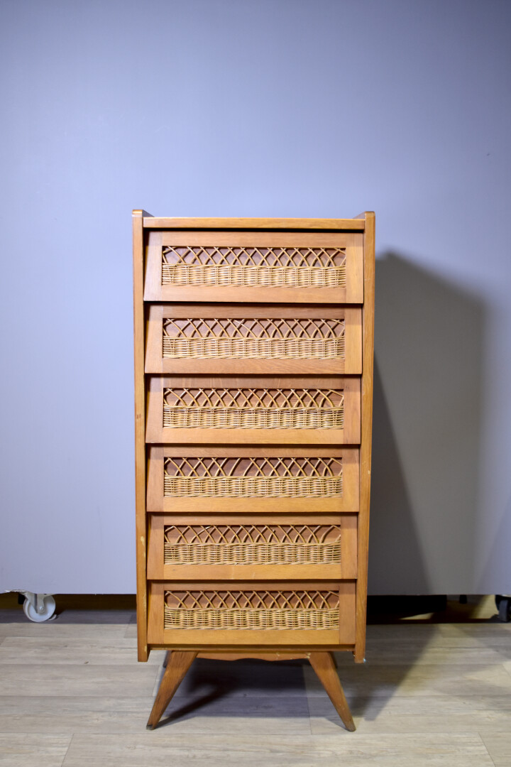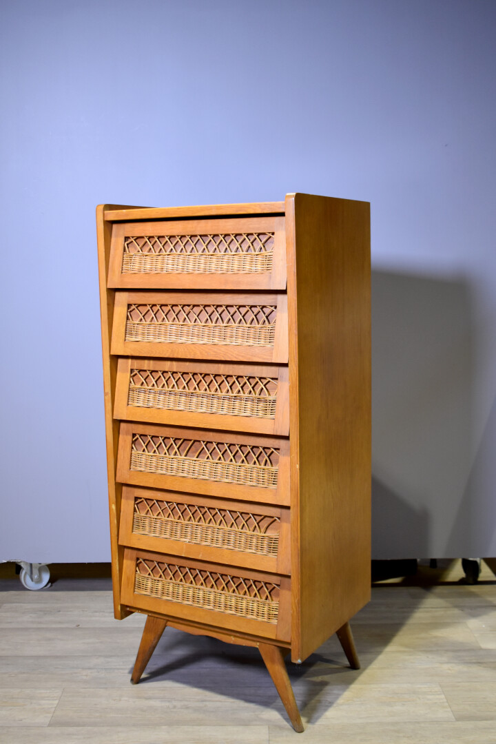Louis SOGNOT (1892-1969). Chiffonnier en placage de chêne et osier tressé (quelques frottements). Il ouvre à 6 tiroirs. Seconde moitié du XXe siècle. Haut. : 126,5 cm – Larg. : 55 cm – Prof. : 43 cm.