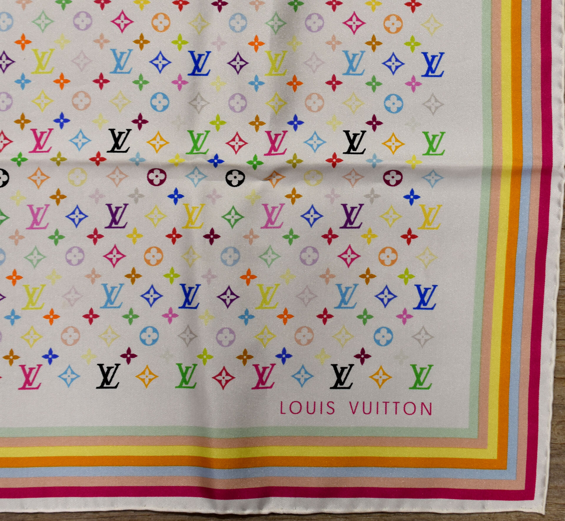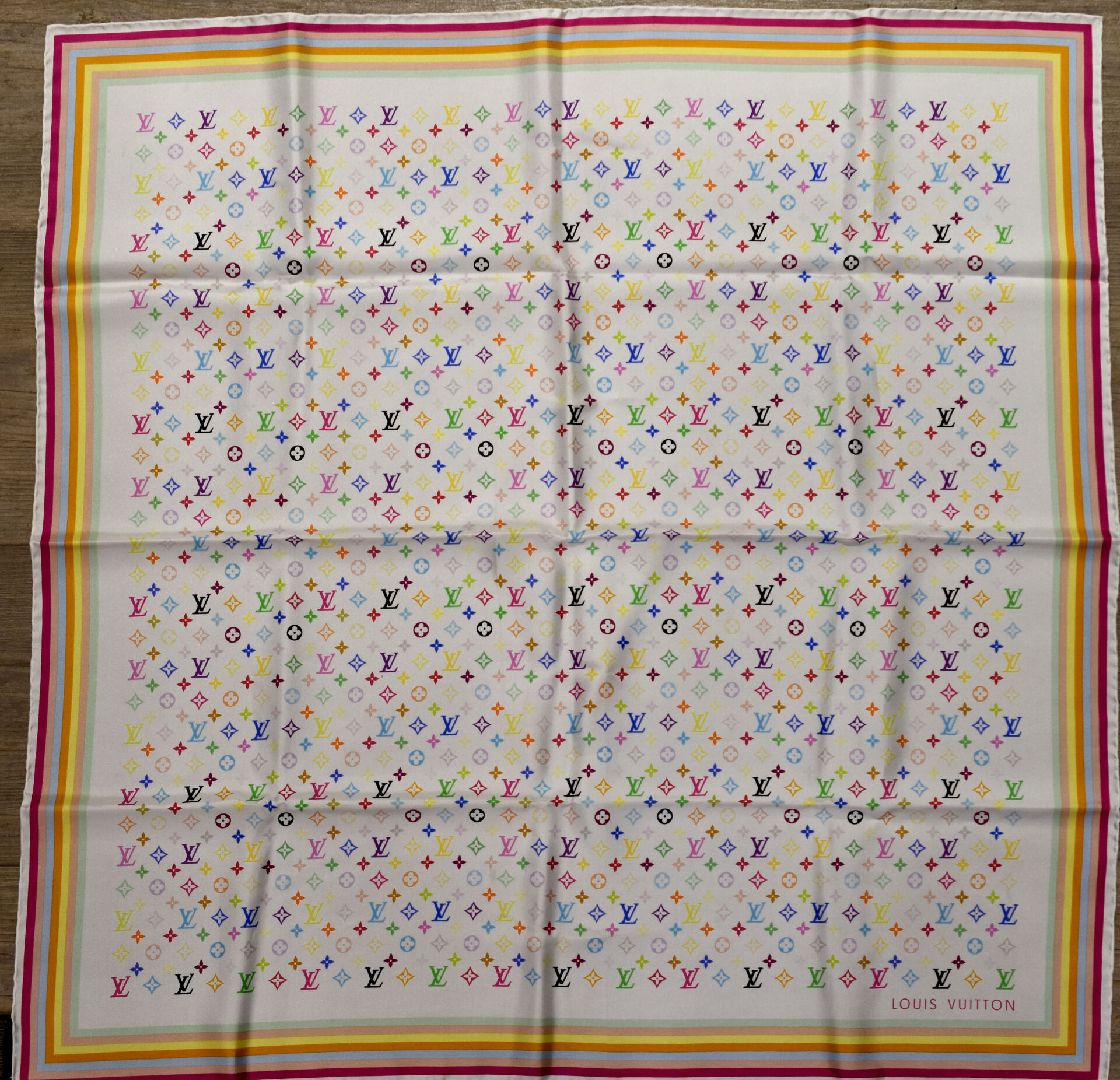 LOUIS VUITTON. Carré de soie à motif du monogramme en polychromie sur fond blanc. 68 x 68 cm.