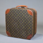 Louis VUITTON. Petite valise carrée en toile enduite monogram et cuir cognac (usures et frottements, humidité, manque probablement la serrure). Intérieur en toile beige. 41 x 41 x 19 cm. Avec un cadenas n°303 et un autre rapporté sans marque.