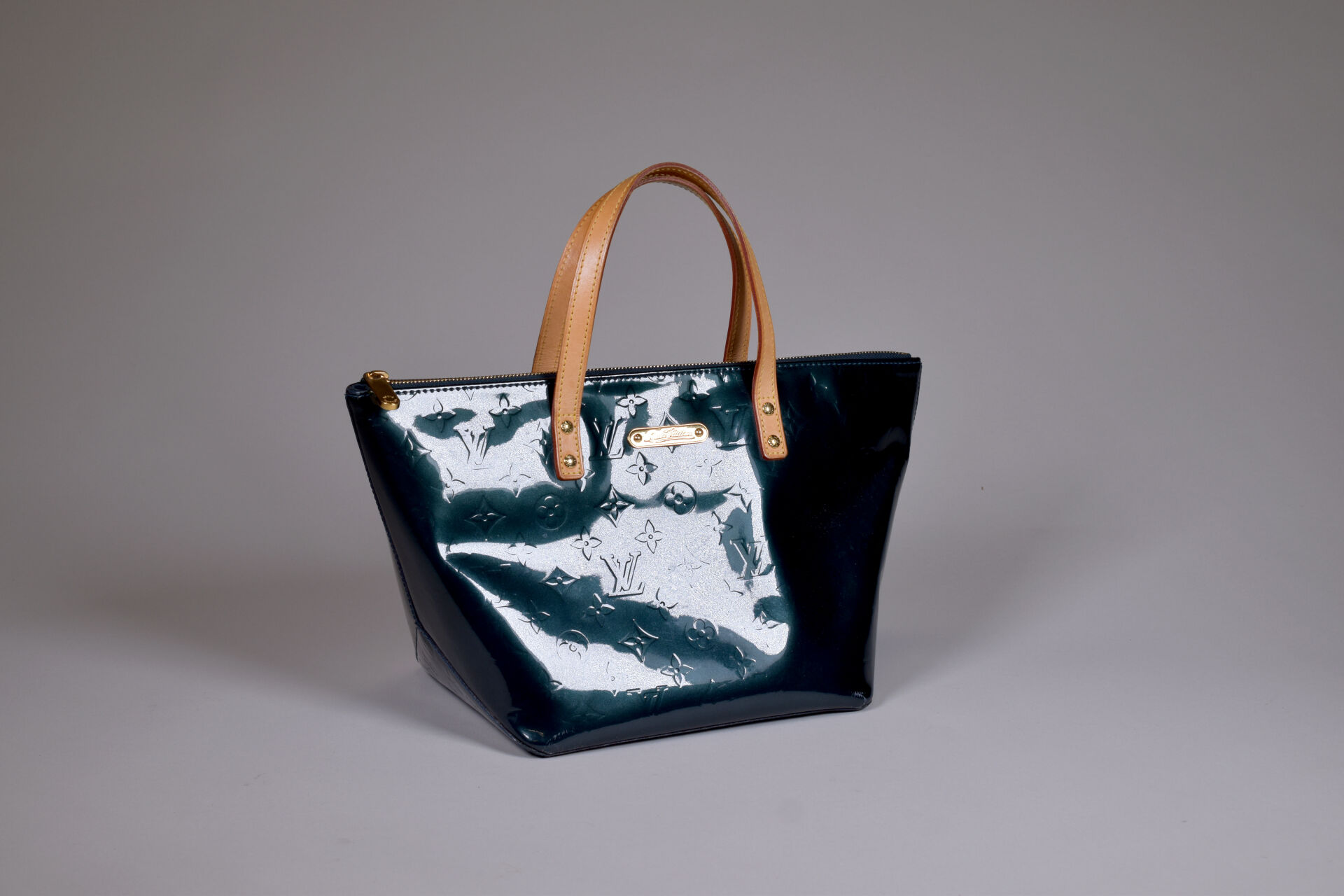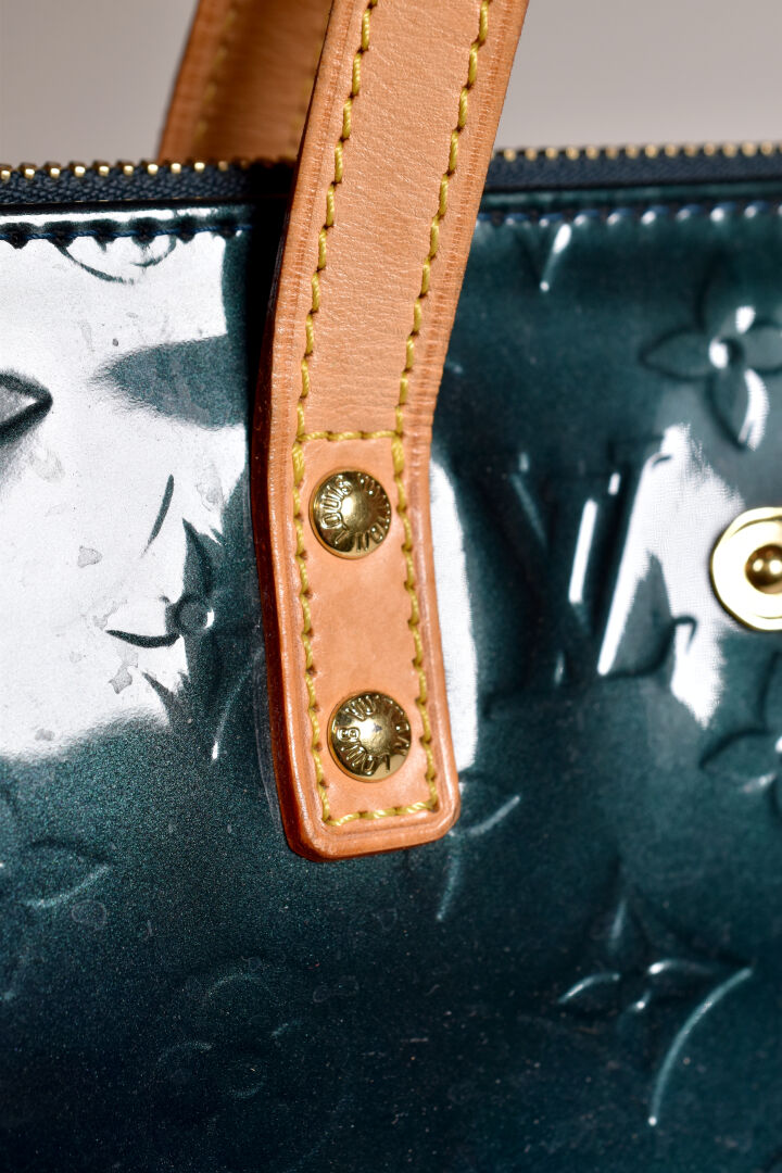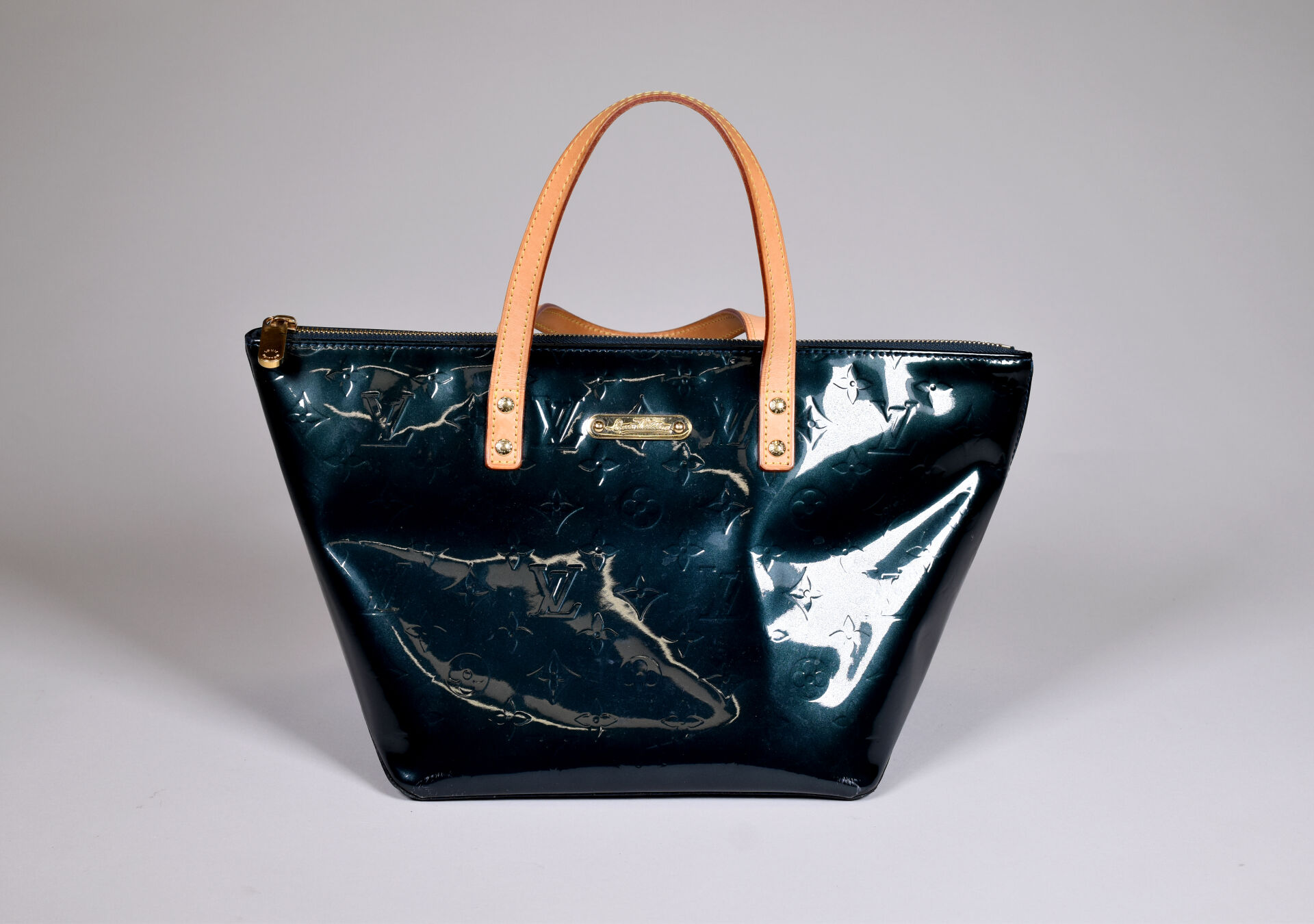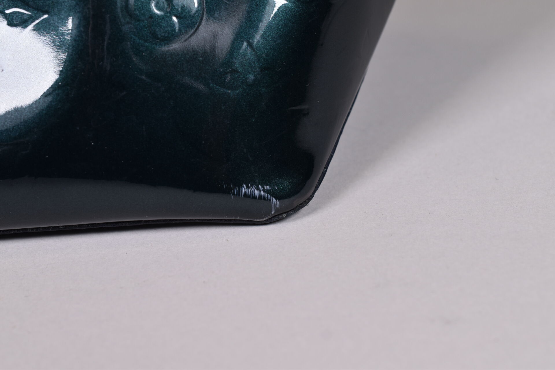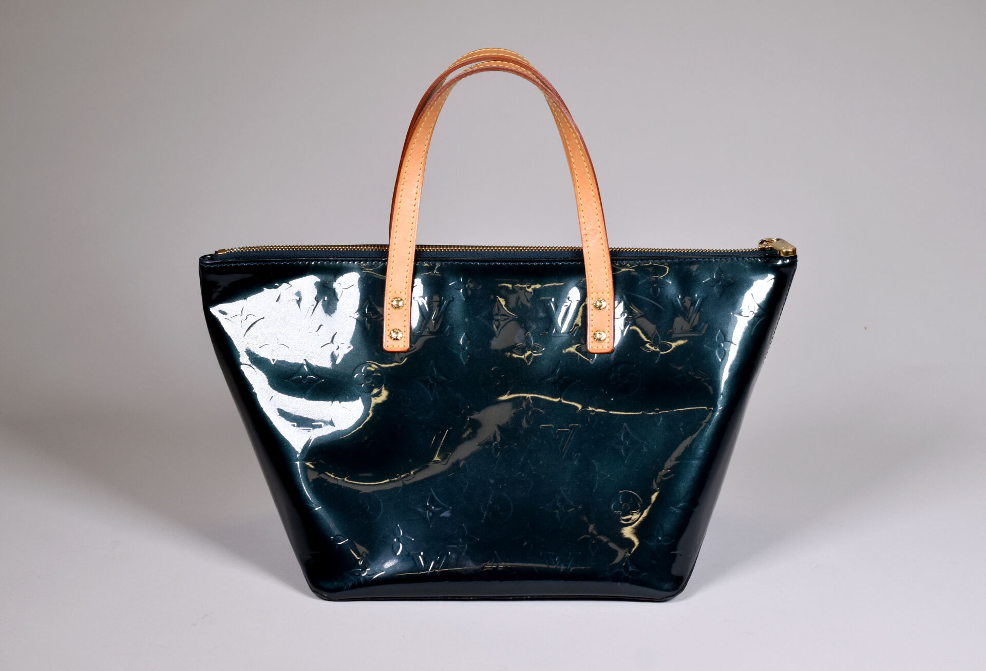 LOUIS VUITTON. Sac à main cabas en cuir verni vert foncé et camel (quelques usures et rayures d’usage). Haut. : 22 cm – Larg. : 38 cm.