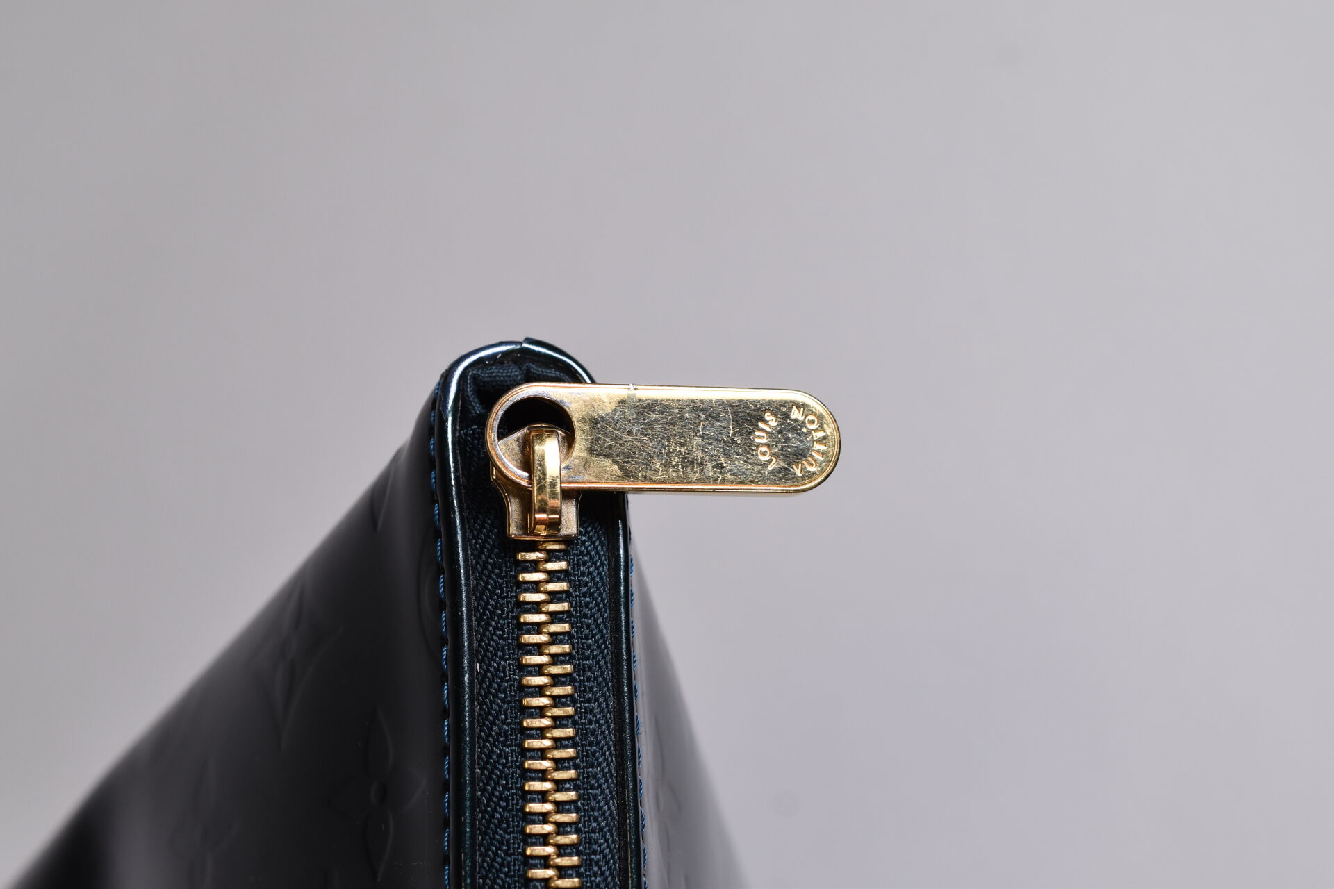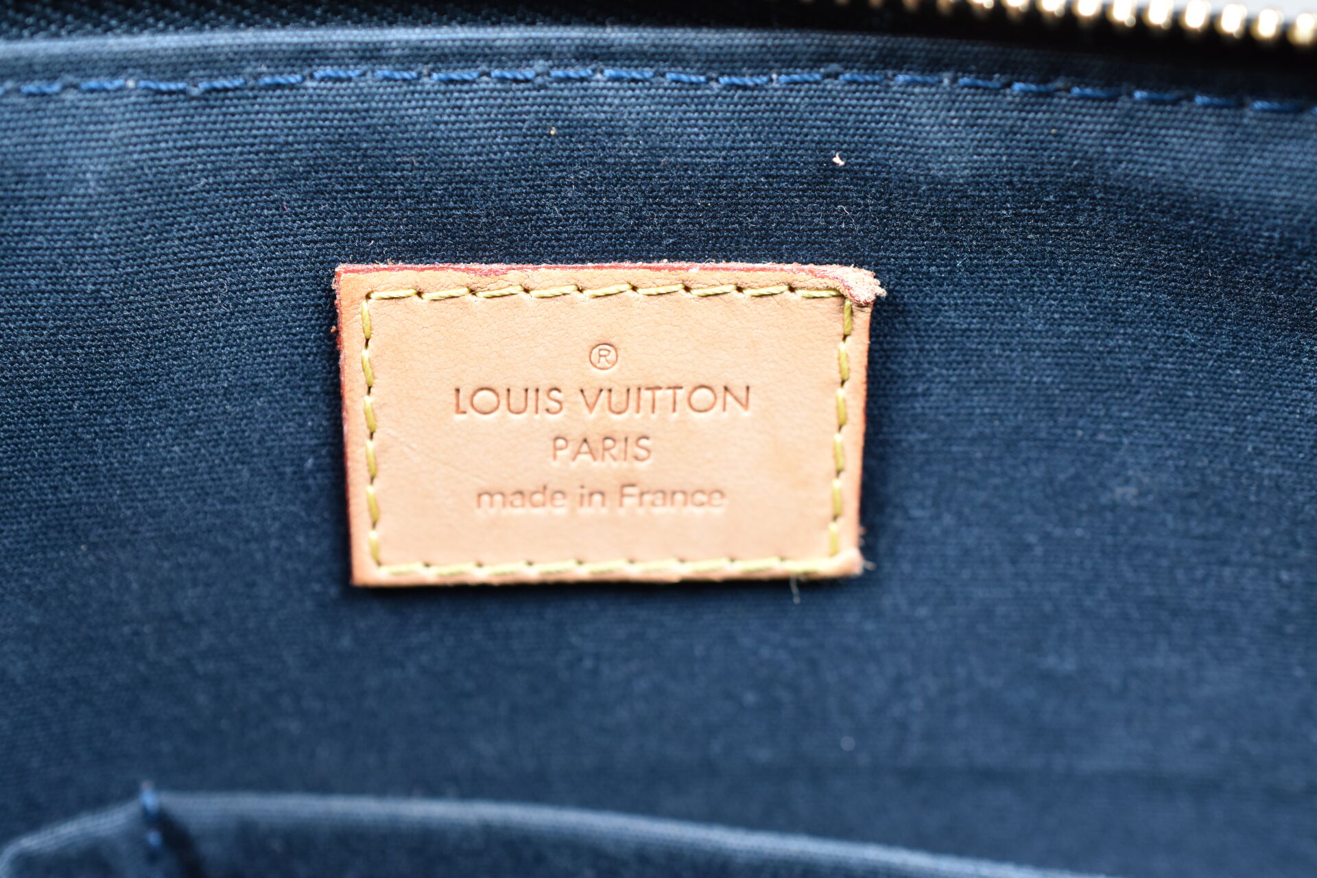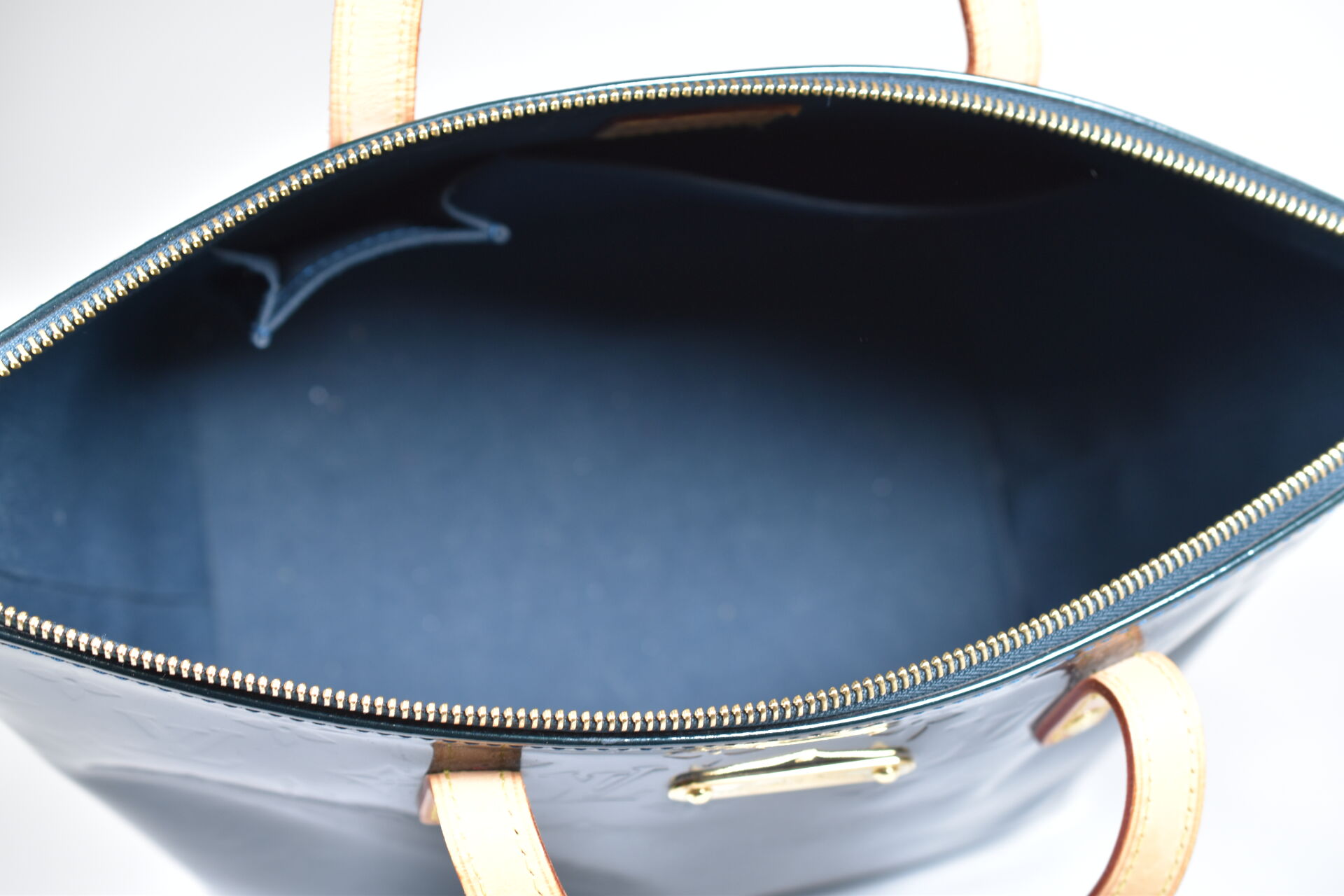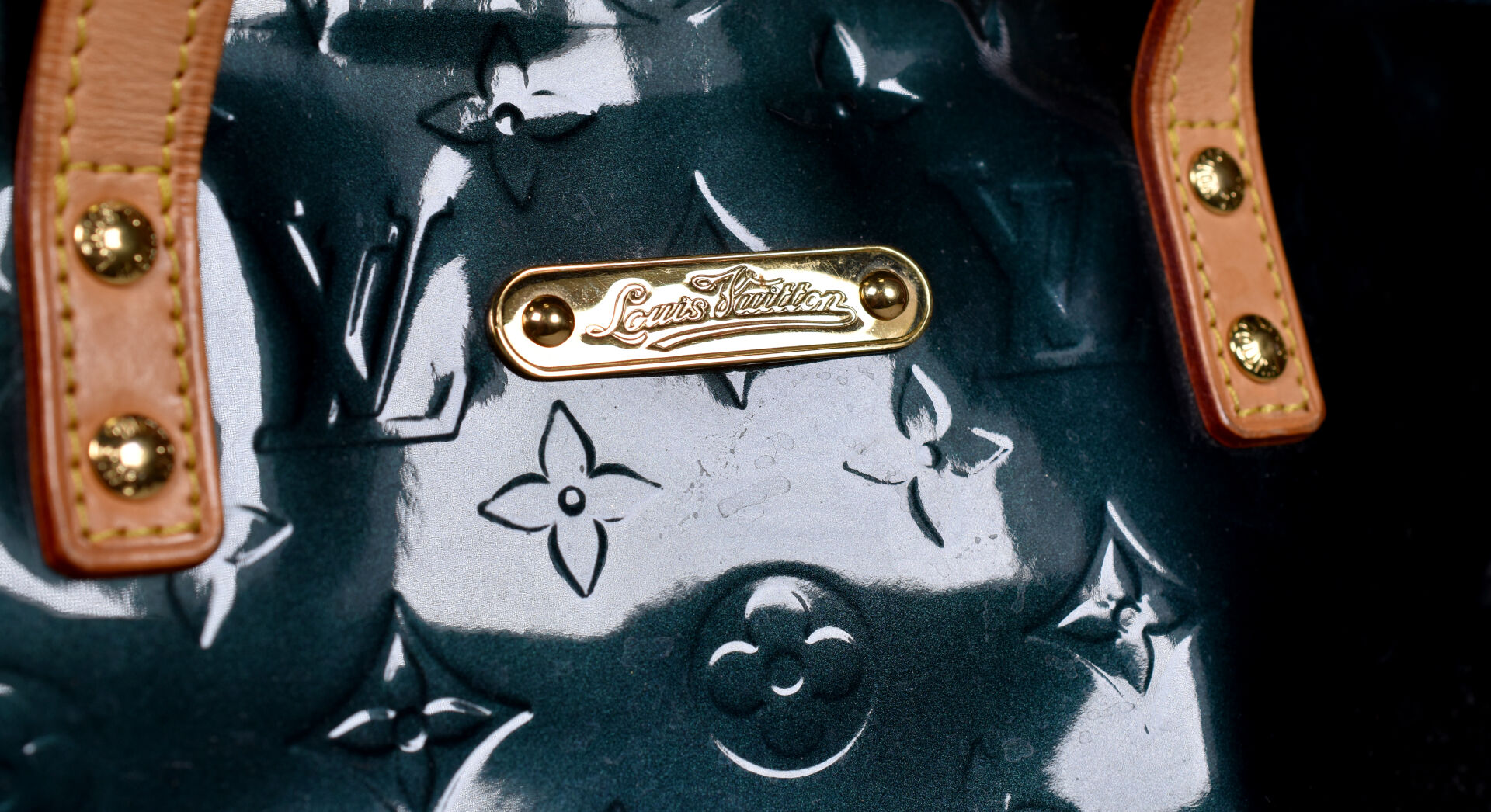 LOUIS VUITTON. Sac à main cabas en cuir verni vert foncé et camel (quelques usures et rayures d’usage). Haut. : 22 cm – Larg. : 38 cm.
