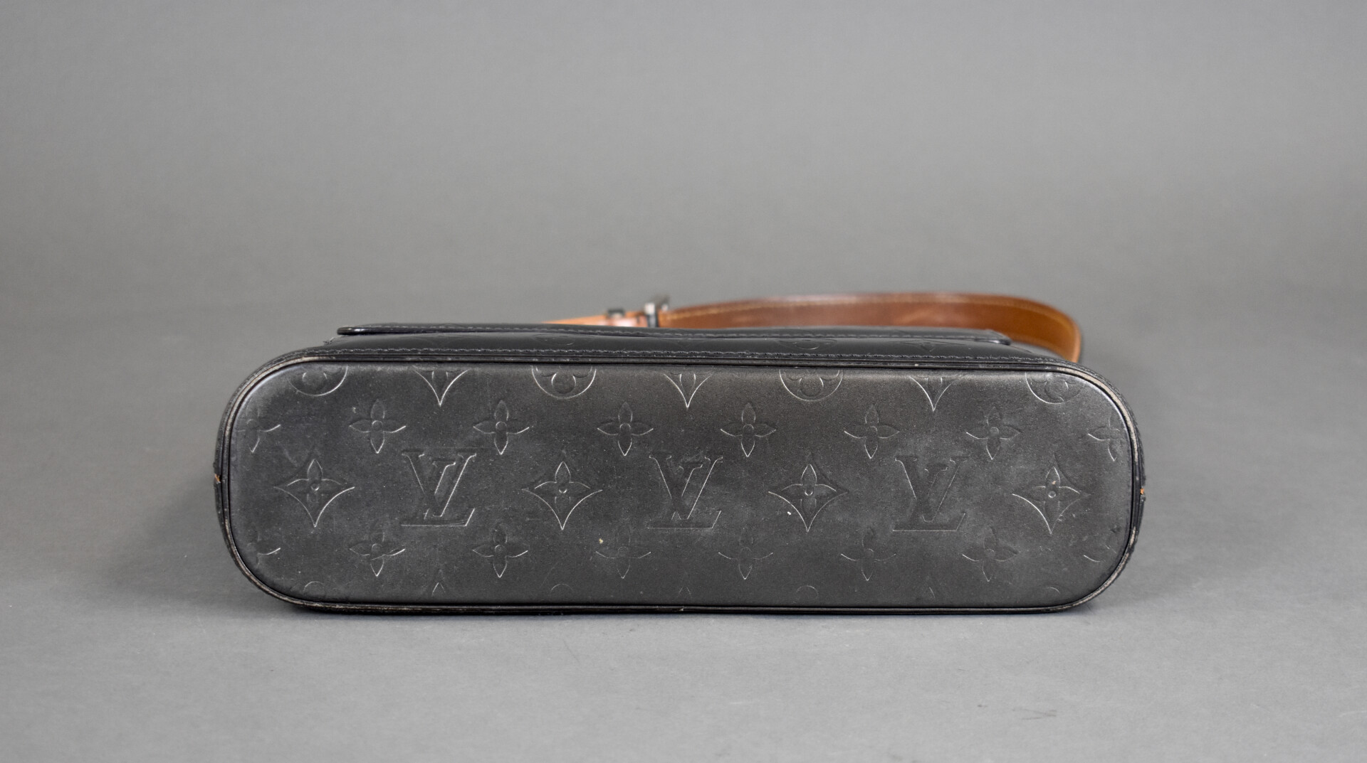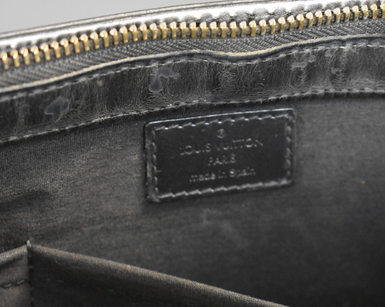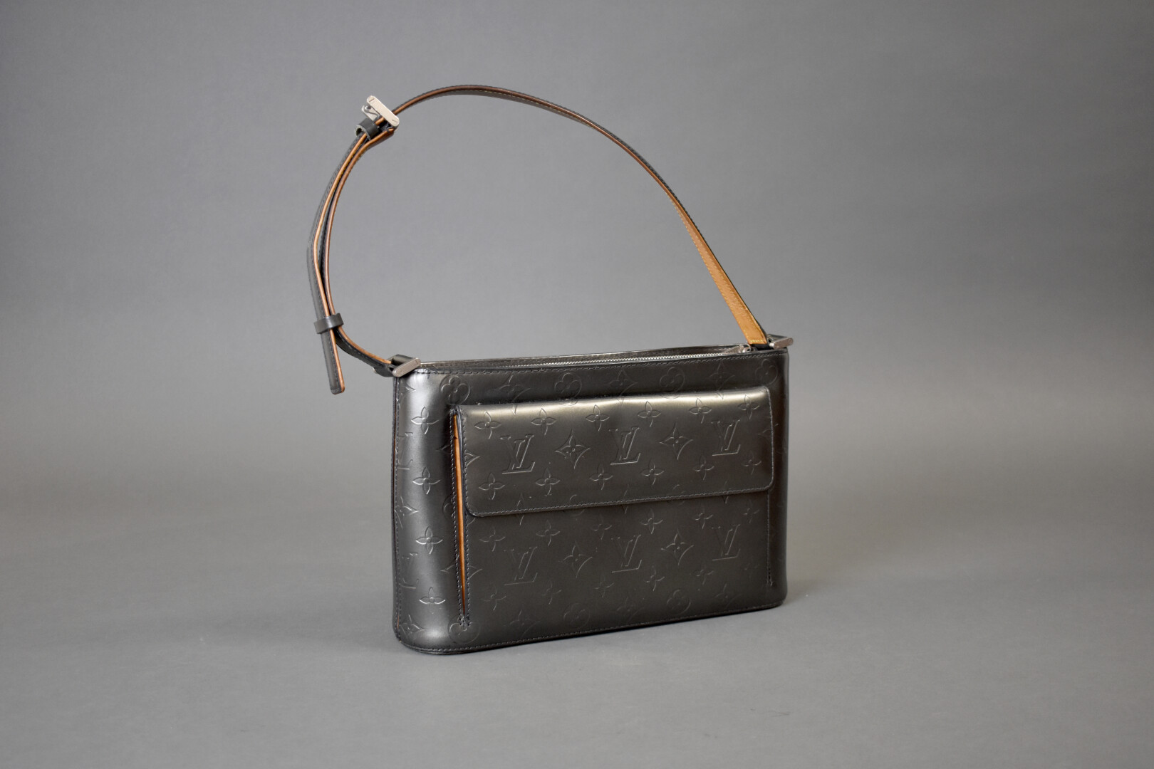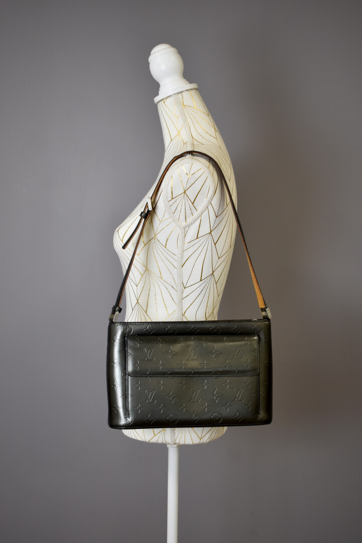 LOUIS VUITTON. Sac à main en cuir gris métallisé monogrammé (quelques légères traces de frottement). En très bon état général. Haut. : 19,5 cm – Larg. : 30 cm – Prof. : 8,5 cm. Vendu avec un dust bag et une boîte.