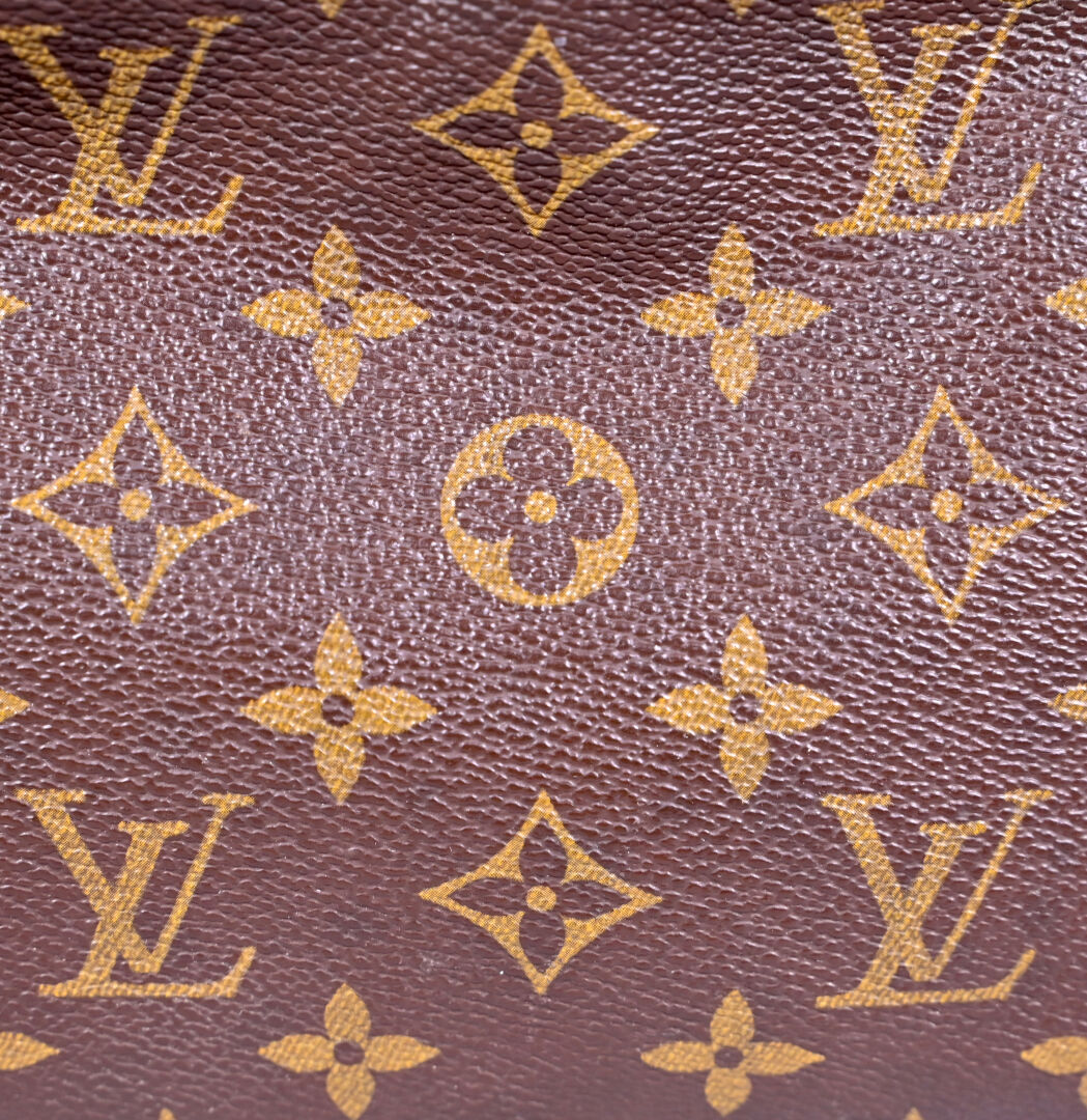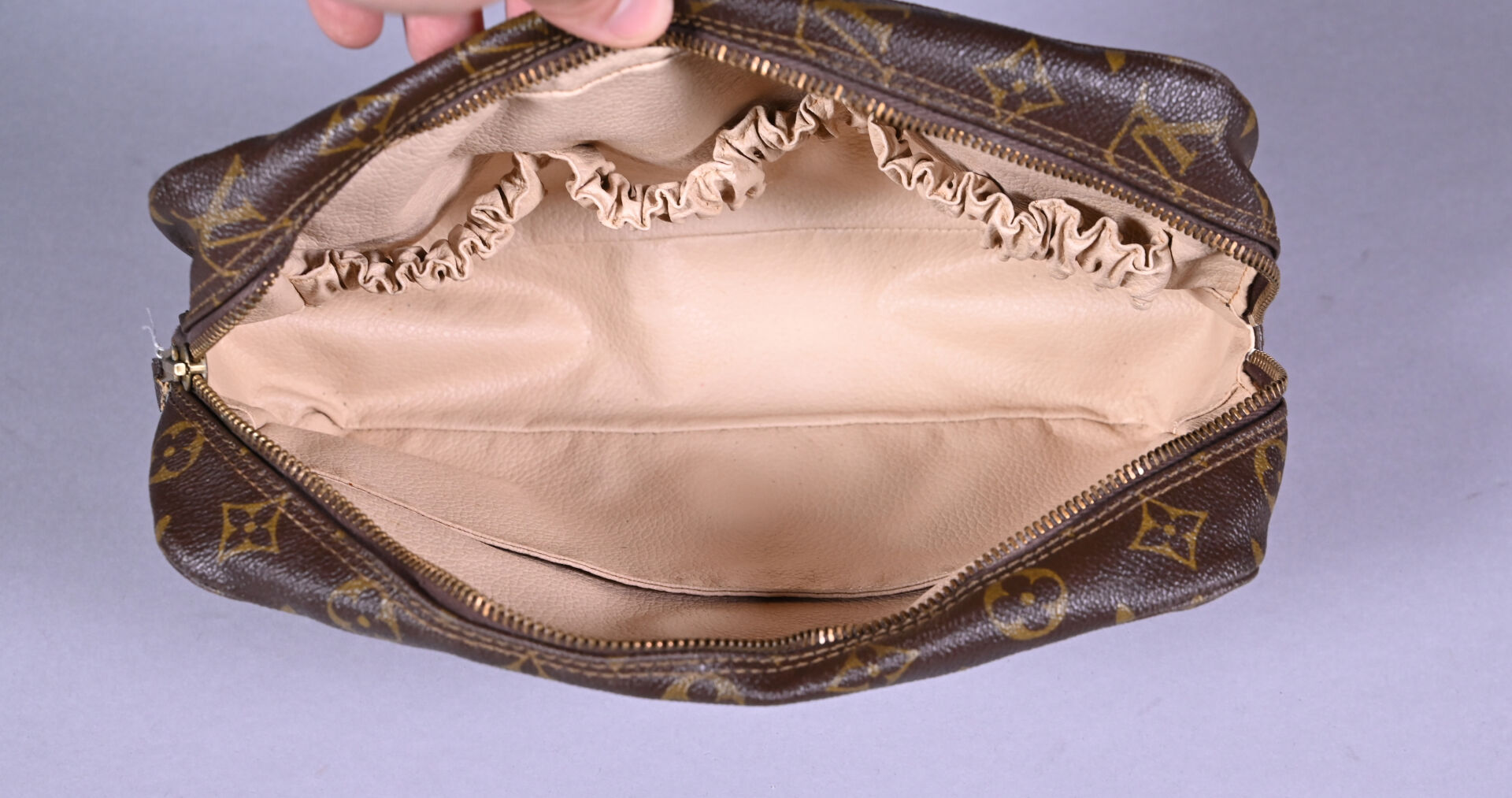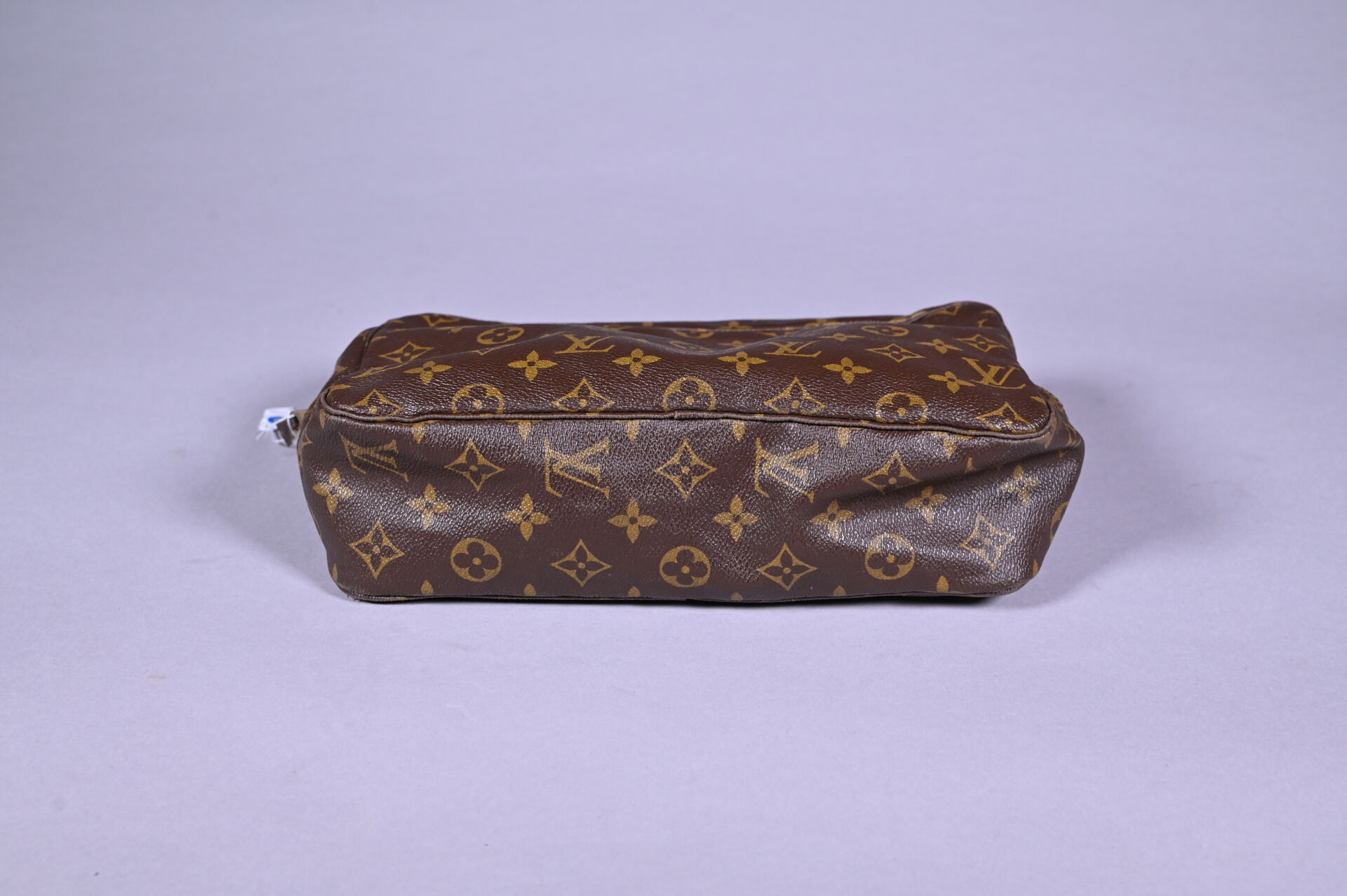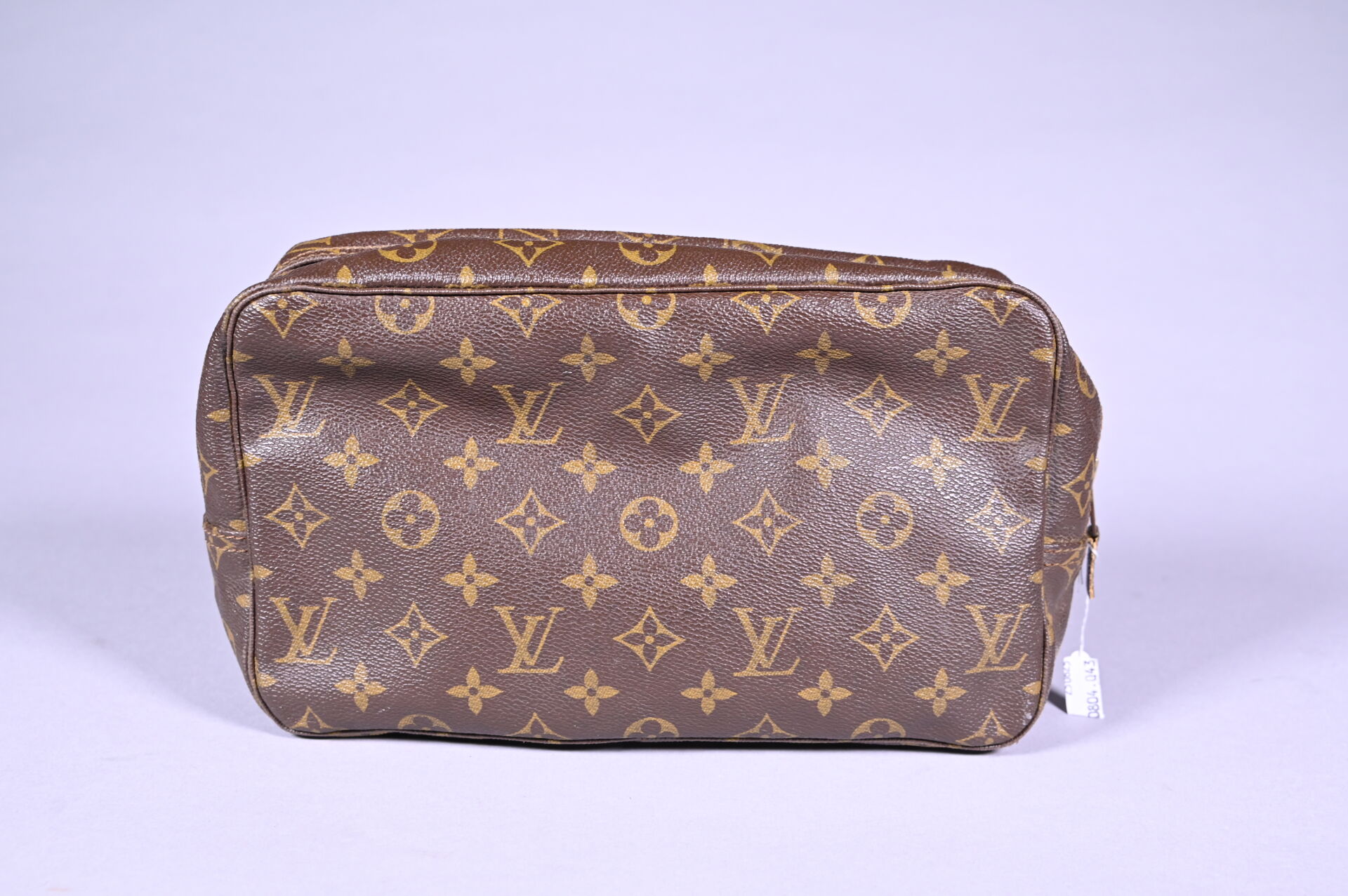 LOUIS VUITTON. Trousse de toilette en toile enduite monogram. Intérieur en cuir beige (quelques usures). Vers 1970/1980 ? Haut. : 17 cm – Larg. : 32 cm – Prof. : 8 cm.