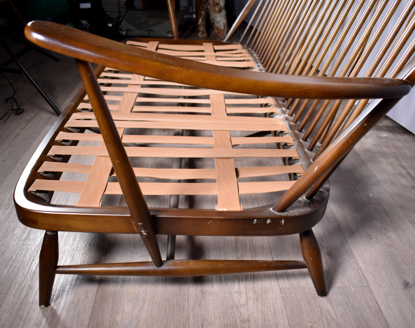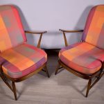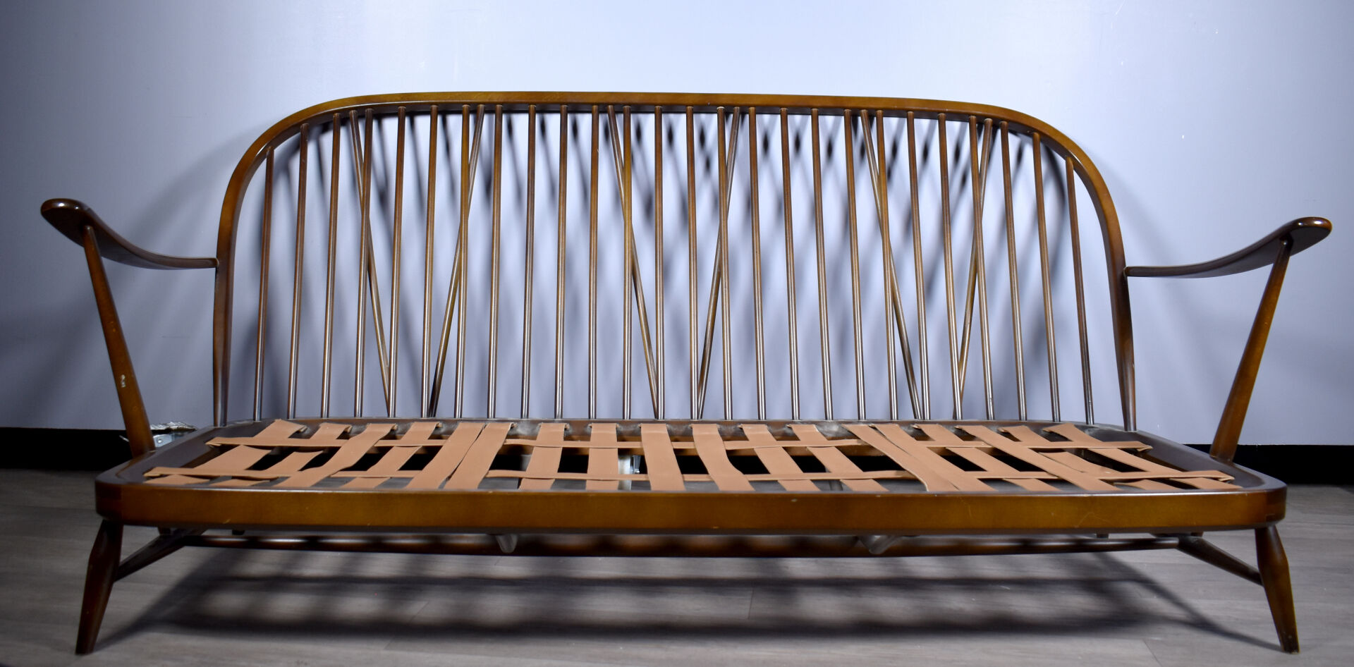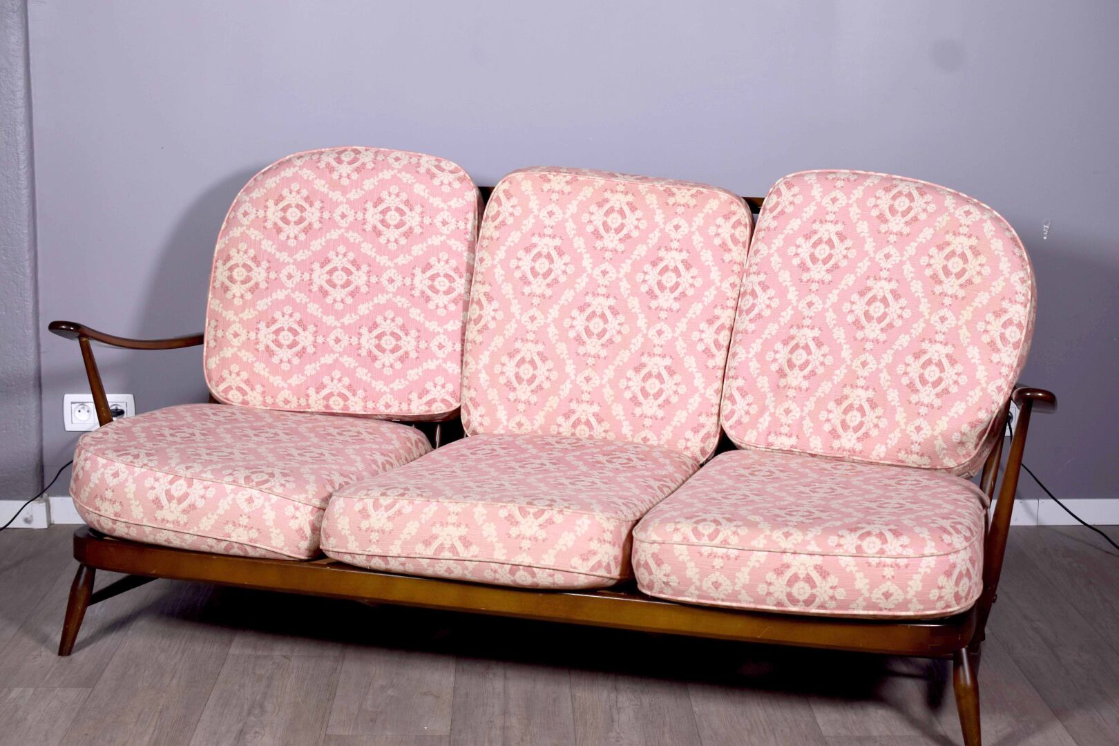 Luciano Randolph ERCOLANI (1888-1976). Mobilier de salon modèle WINDSOR à structure en hêtre teinté foncé à dossier ajouré. Il comprend une paire de fauteuils et un canapé. Garniture de tissus fleuri à carreaux postérieure. Dim. du canapé : Haut. : 78 cm – Larg. : 174 cm – Prof. : 92 cm.