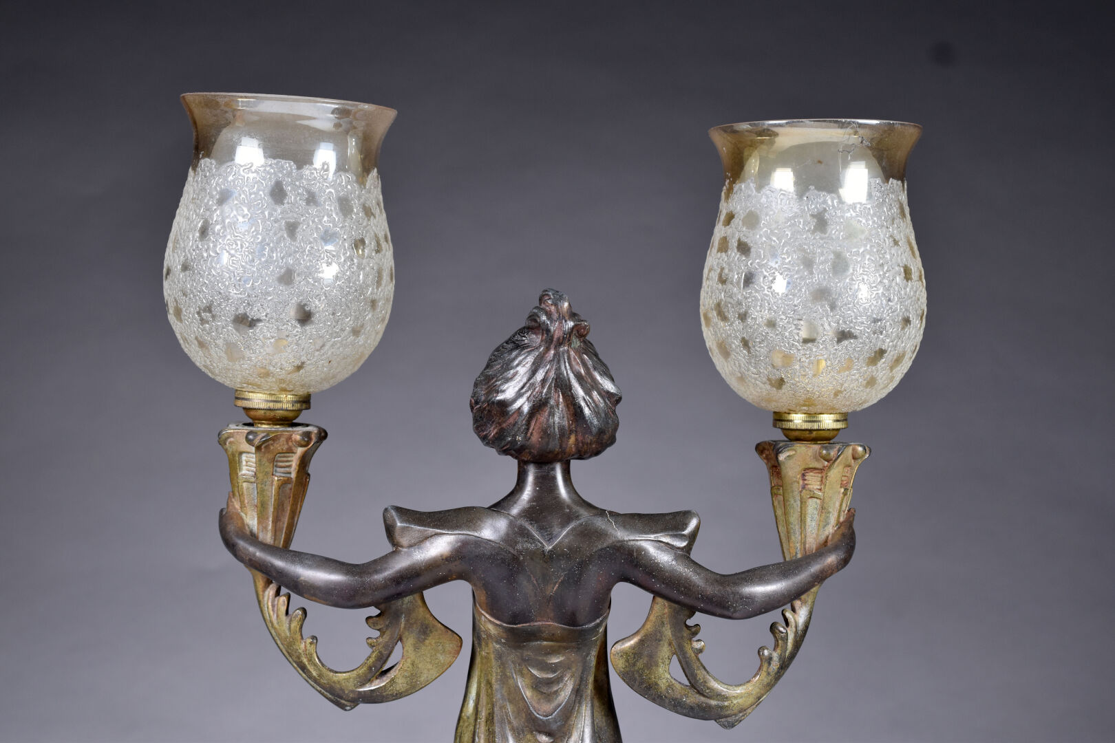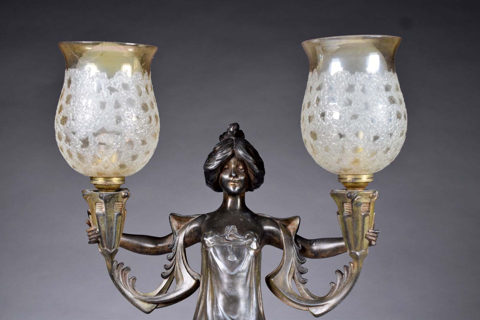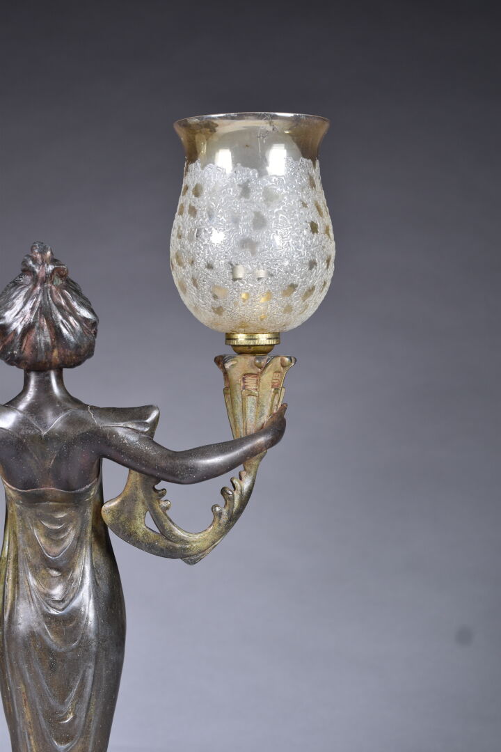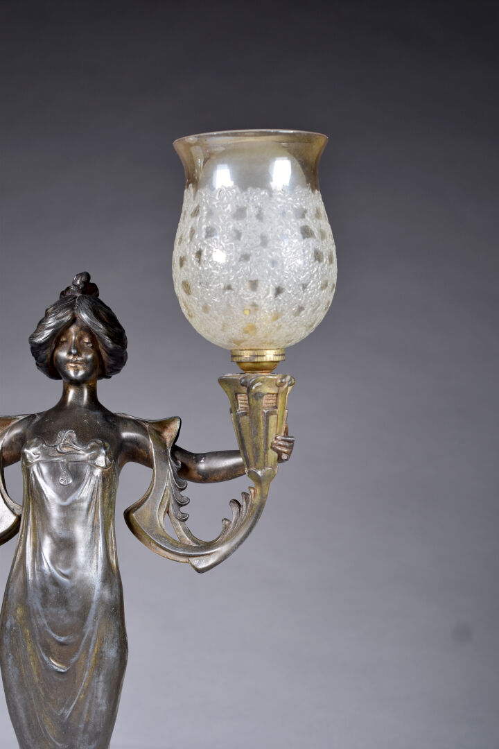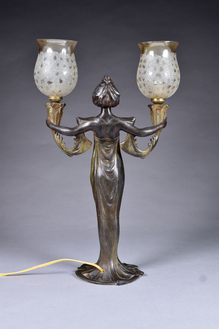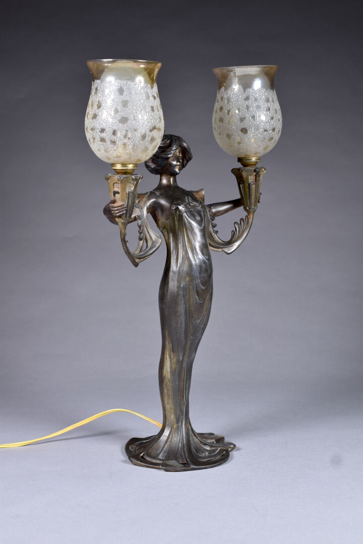 Lucien-Charles ALLIOT (1877-1967). Lampe à poser en régule patiné brun, le fût représentant une femme tenant deux flambeaux (usures). Tulipes en verre légèrement jaune (probablement postérieures, fèle). Signée. Epoque Art Nouveau. Haut. : 48,8 cm.