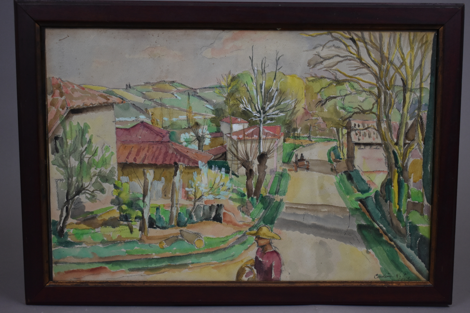 Lucien-Pierre CADENE (1887-1958). Scène de vie dans un village. Dessin à l’aquarelle sur papier Montgolfier, signé et daté 1929. 31 x 47 cm à vue.