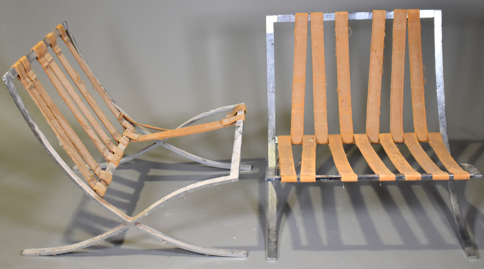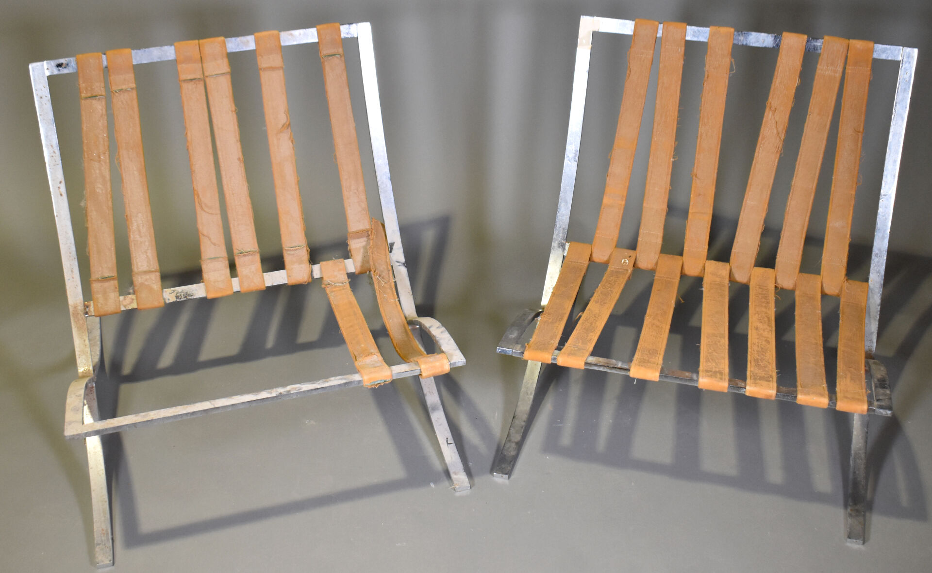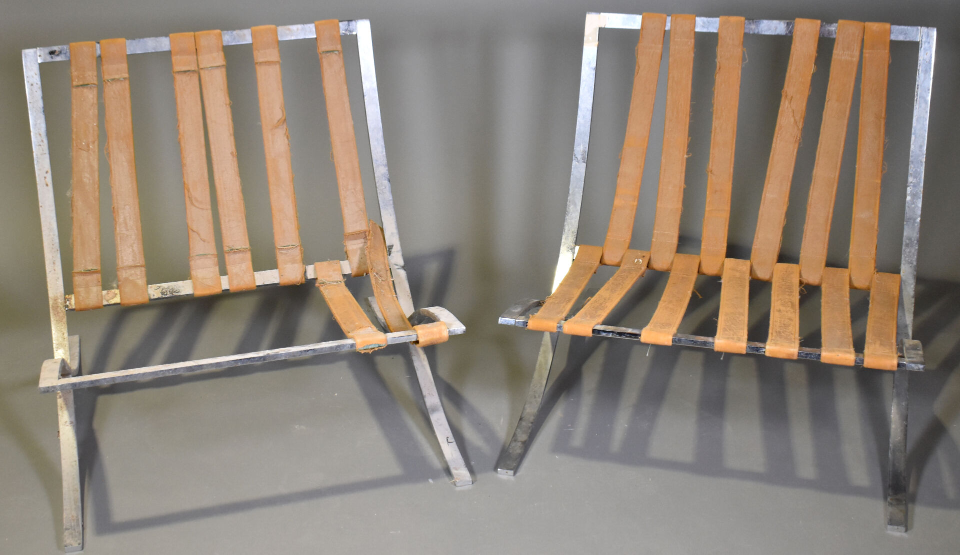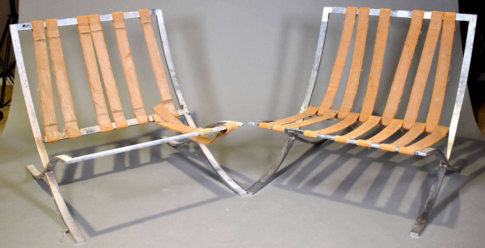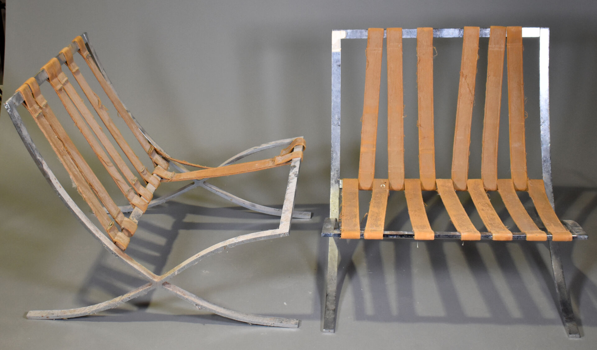 Ludwig MIES VAN DER ROHE (1886-1969). Structure d’une paire de fauteuils modèle « Barcelona » à sangles de cuir tendu sur une structure en acier plat chromé (usures, piqures, manque des sangles). Sans coussins. Dim. : 72 x76 x 85,5 cm.