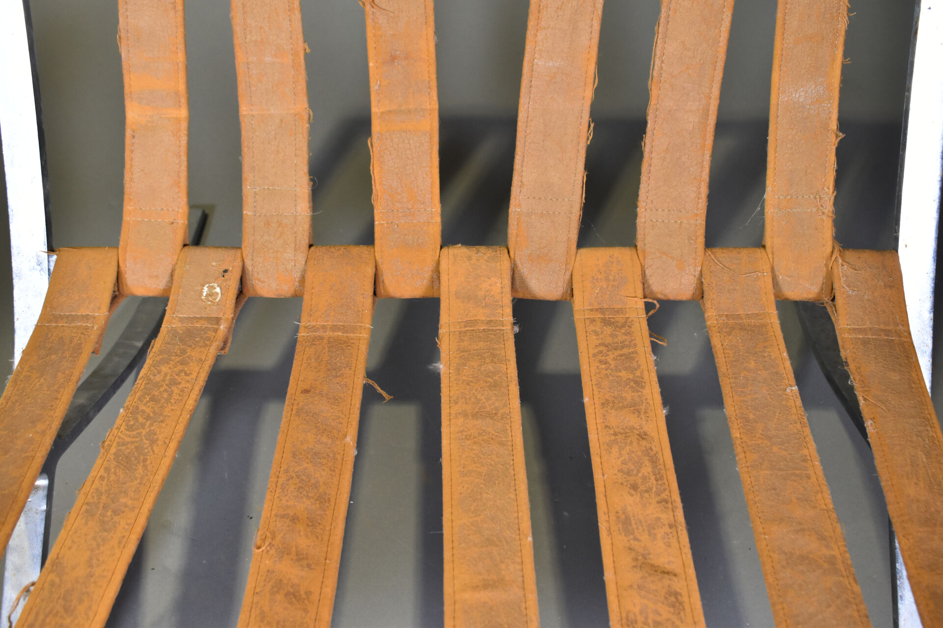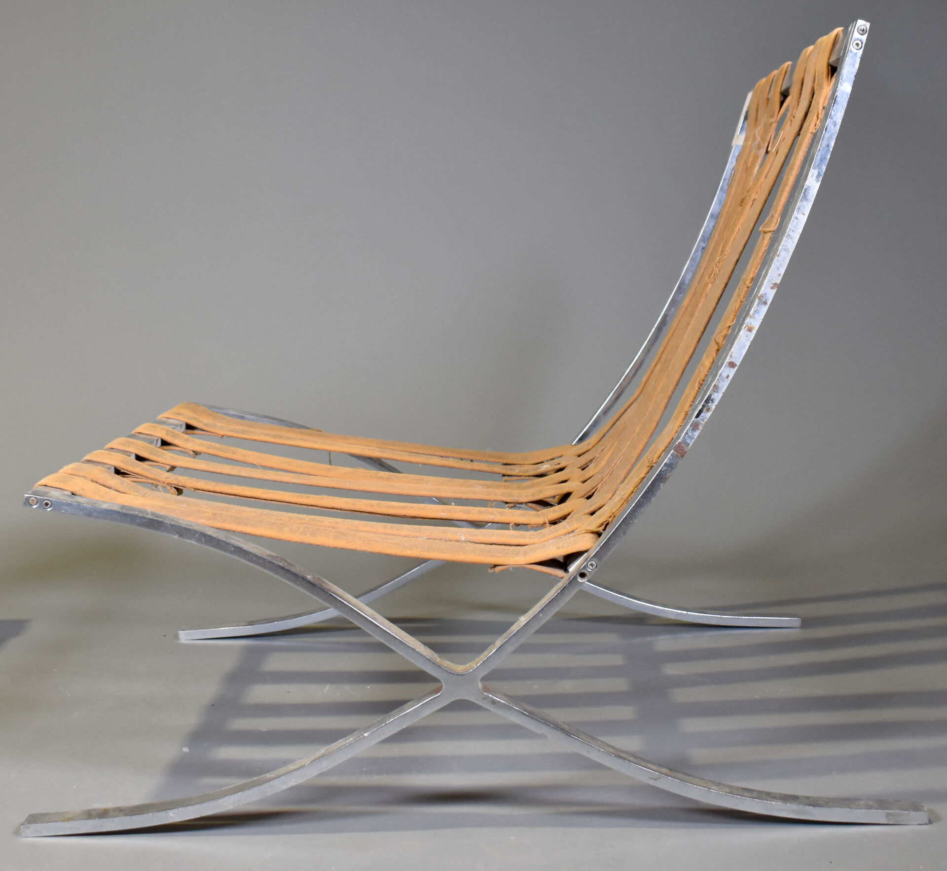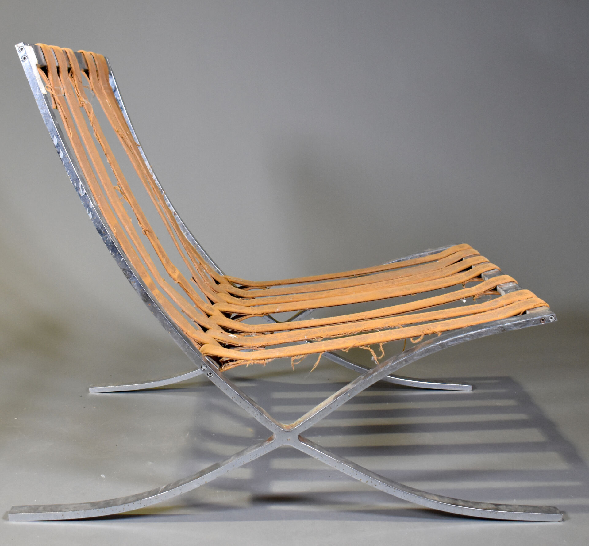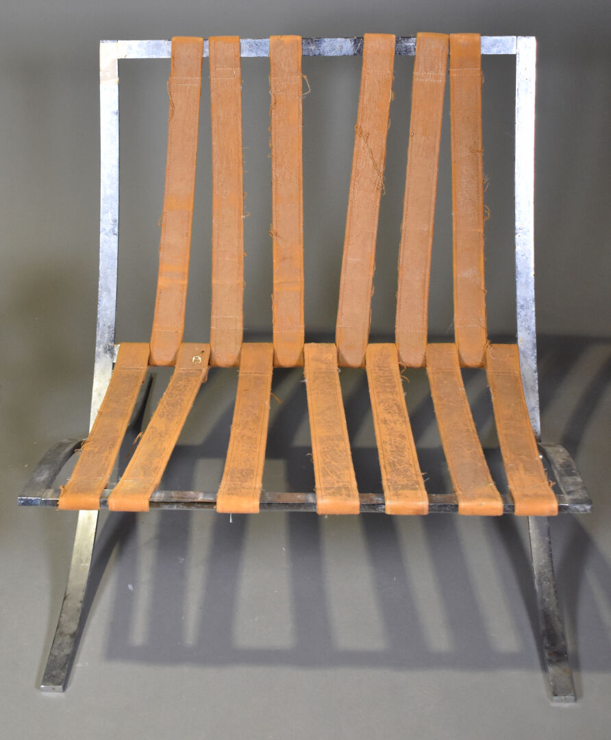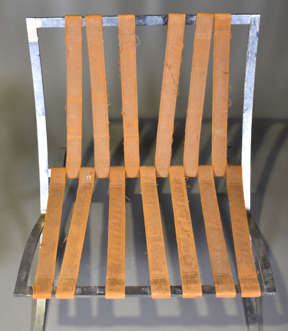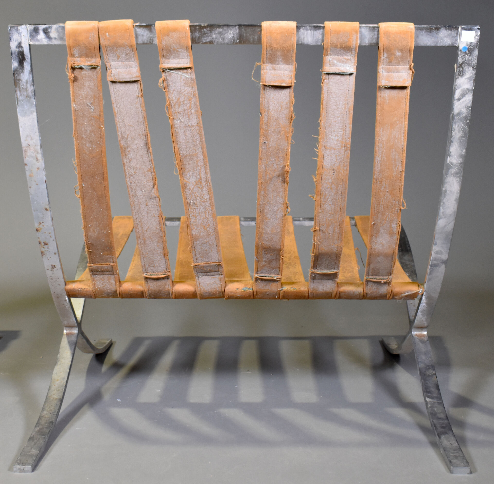 Ludwig MIES VAN DER ROHE (1886-1969). Structure d’une paire de fauteuils modèle « Barcelona » à sangles de cuir tendu sur une structure en acier plat chromé (usures, piqures, manque des sangles). Sans coussins. Dim. : 72 x76 x 85,5 cm.