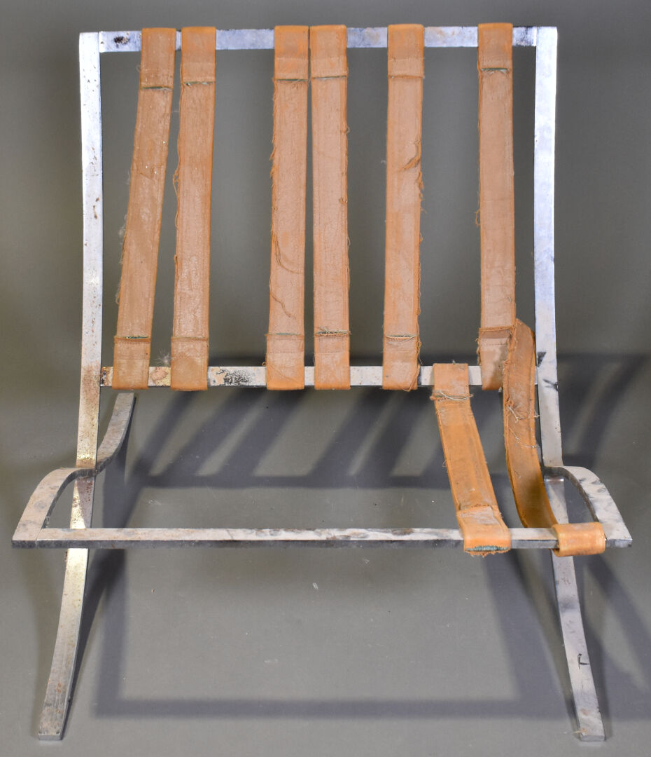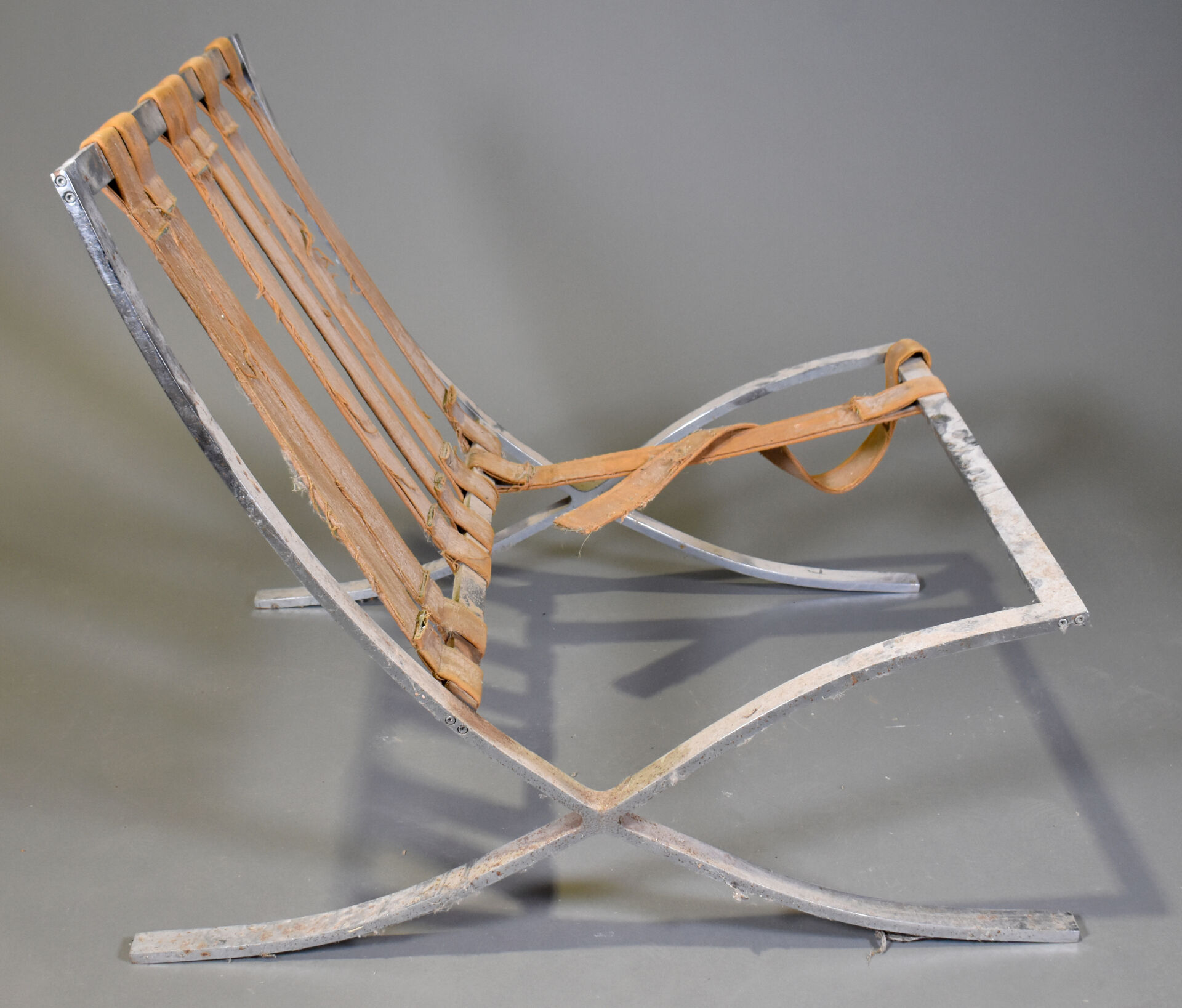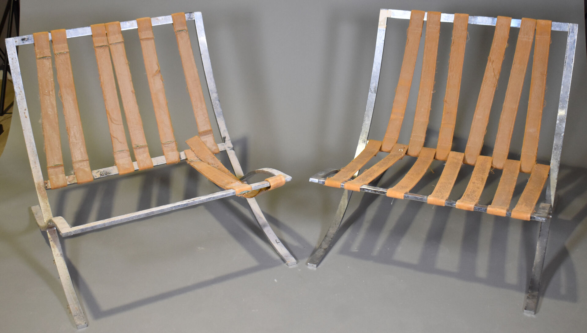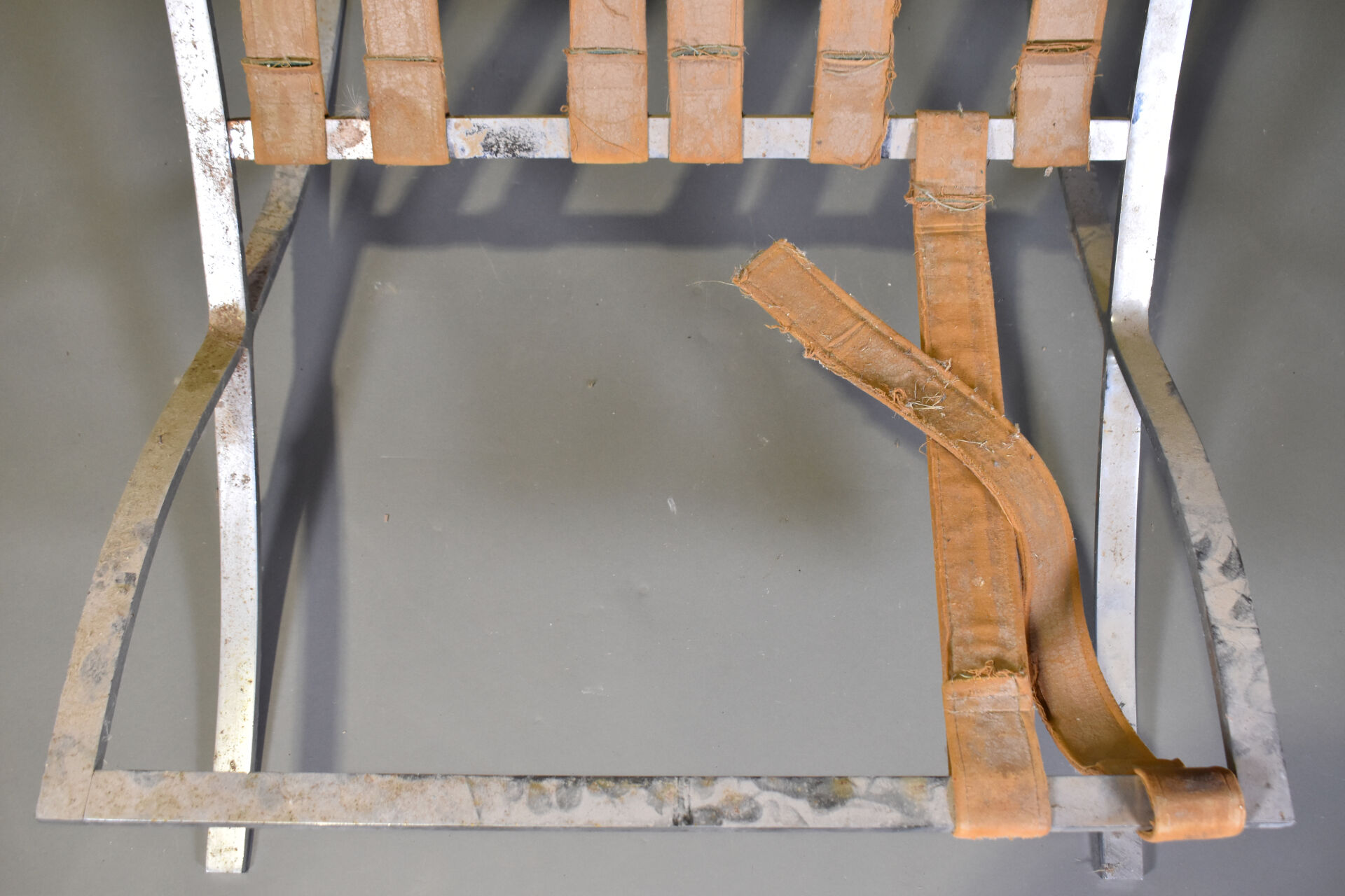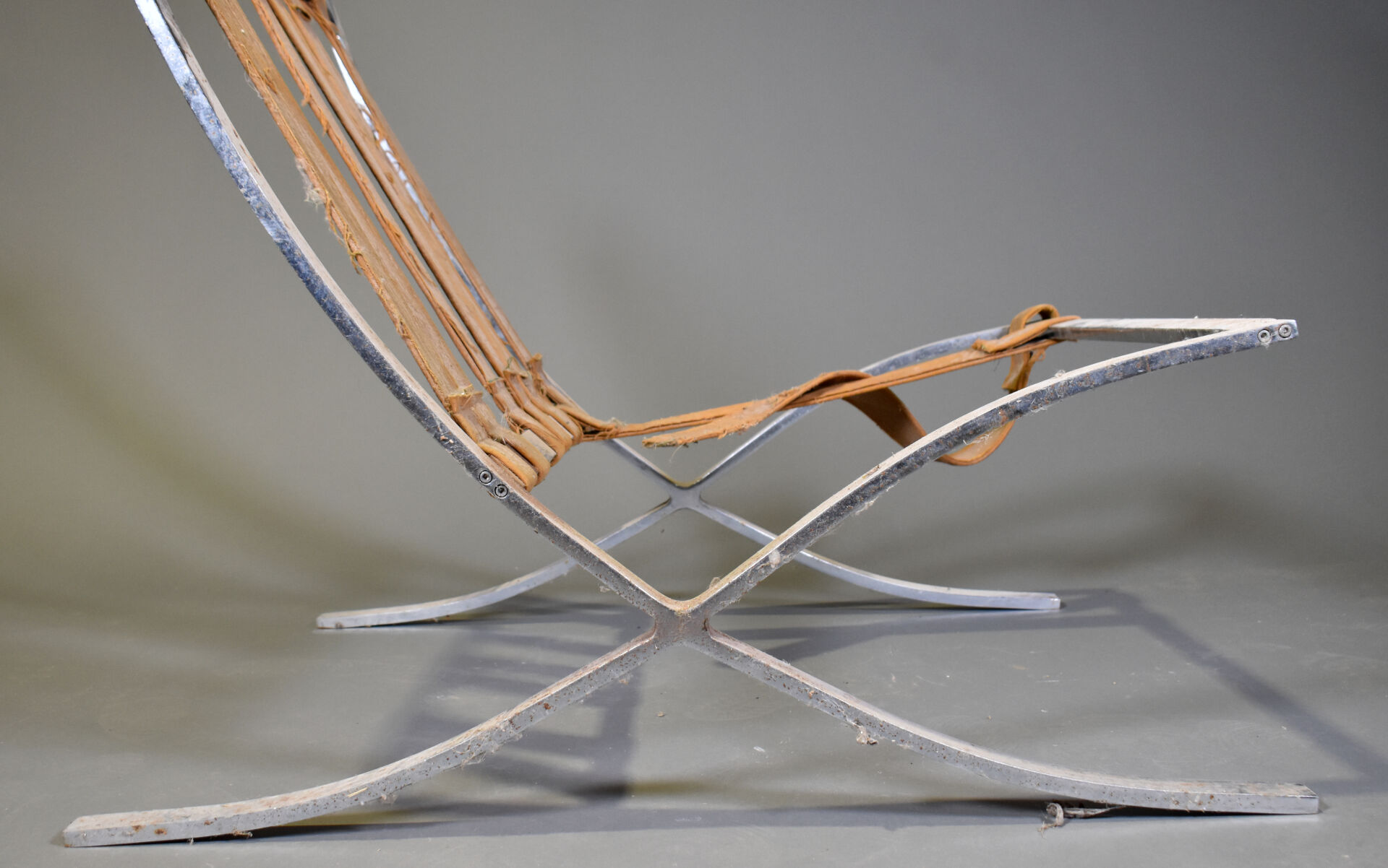 Ludwig MIES VAN DER ROHE (1886-1969). Structure d’une paire de fauteuils modèle « Barcelona » à sangles de cuir tendu sur une structure en acier plat chromé (usures, piqures, manque des sangles). Sans coussins. Dim. : 72 x76 x 85,5 cm.