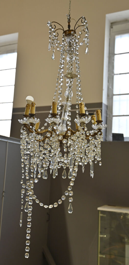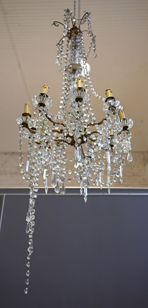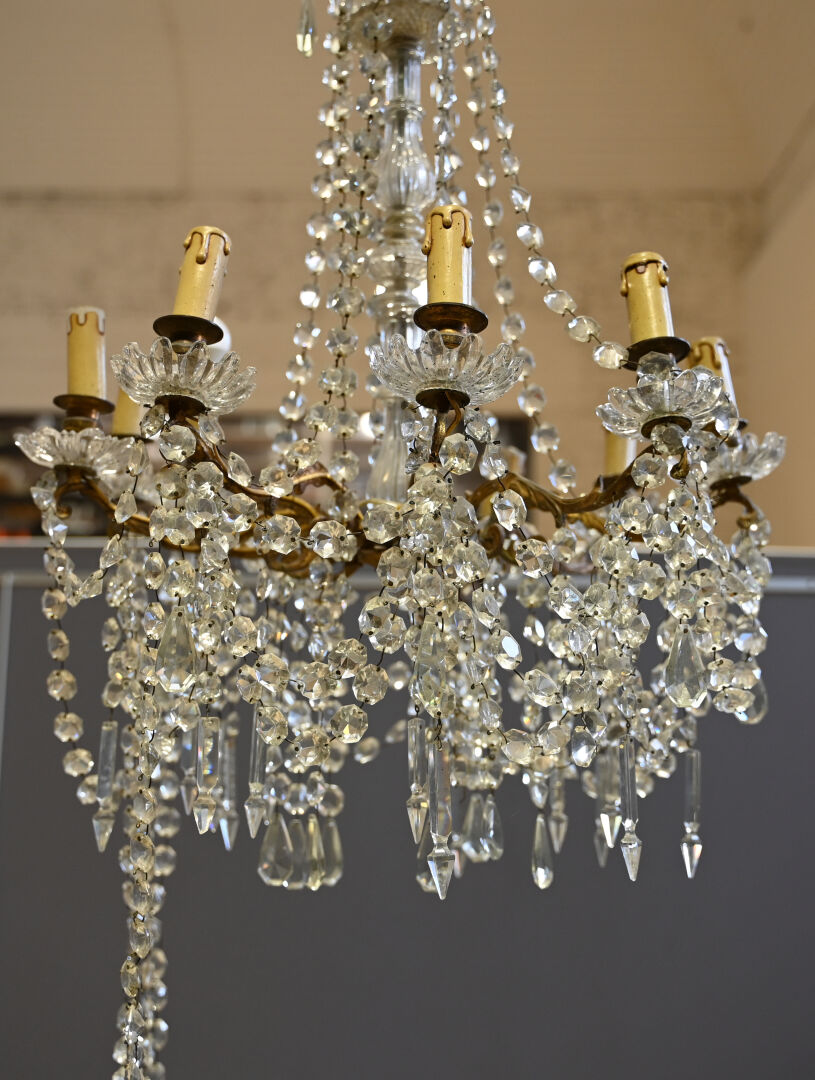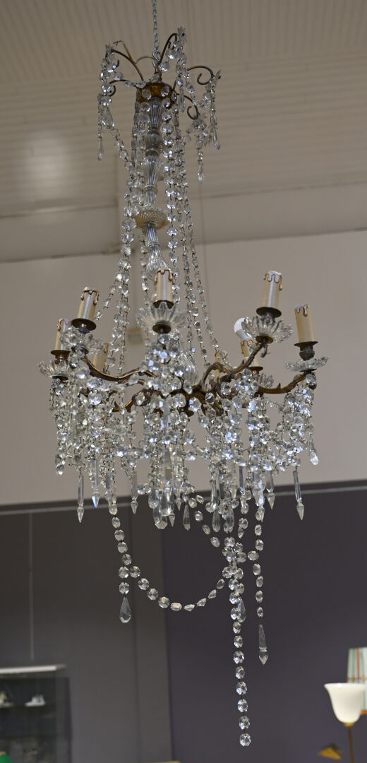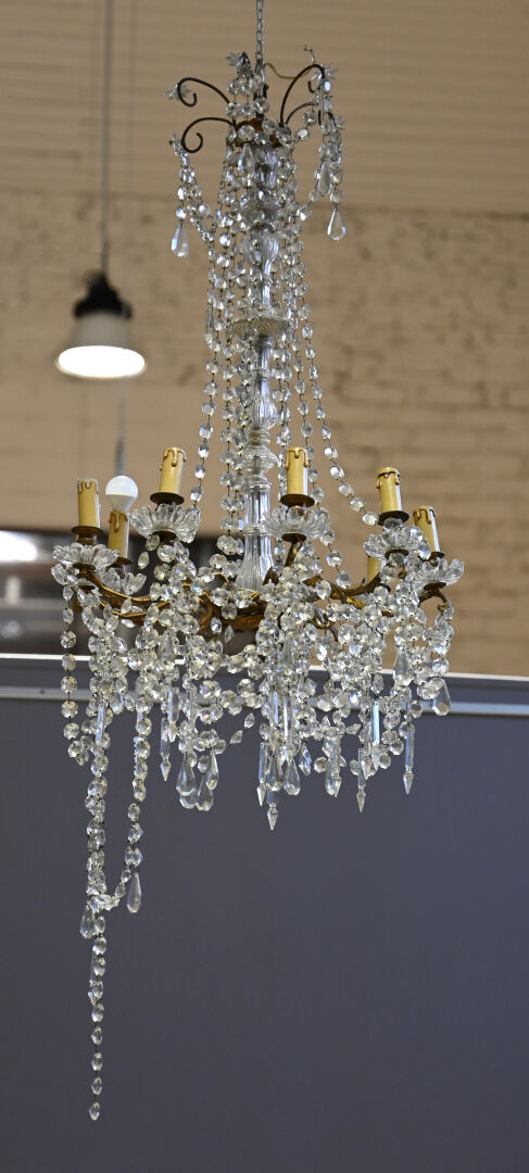 Lustre à pampilles de cristal et bronze à 9 bras de lumière. Le fût en verre moulé, dans le goût de Baccarat. Monté à l’électricité (accidents et manques). Style Louis XV.Haut. : 98 cm. Diam. : 55 cm.