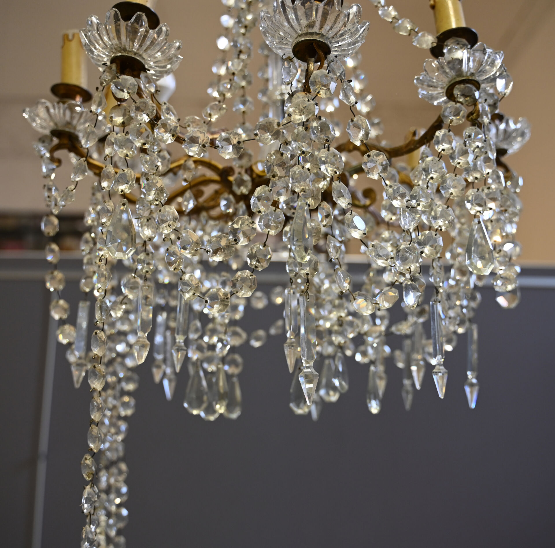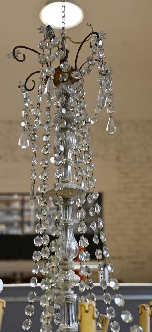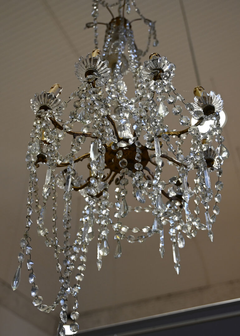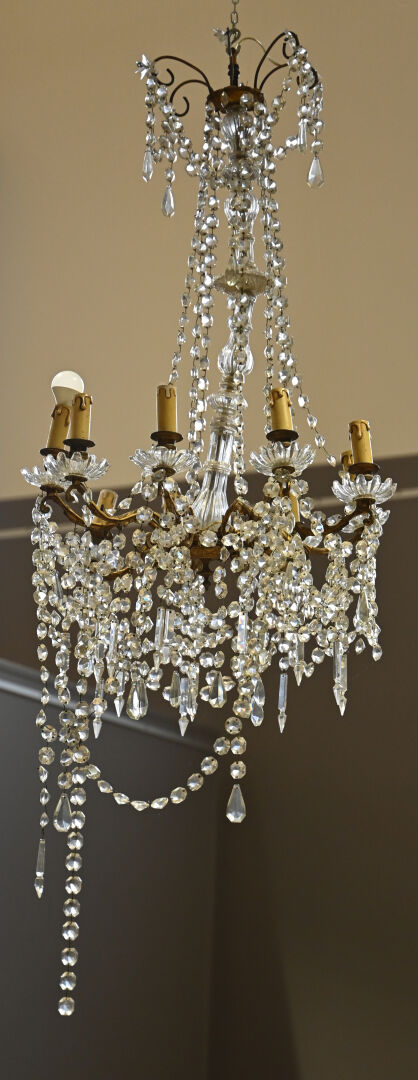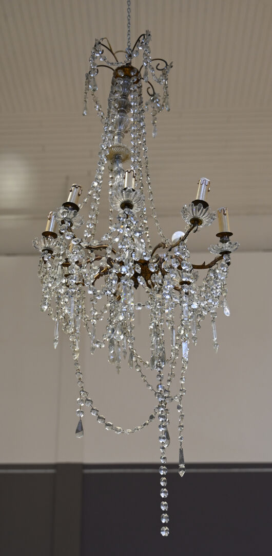 Lustre à pampilles de cristal et bronze à 9 bras de lumière. Le fût en verre moulé, dans le goût de Baccarat. Monté à l’électricité (accidents et manques). Style Louis XV.Haut. : 98 cm. Diam. : 55 cm.