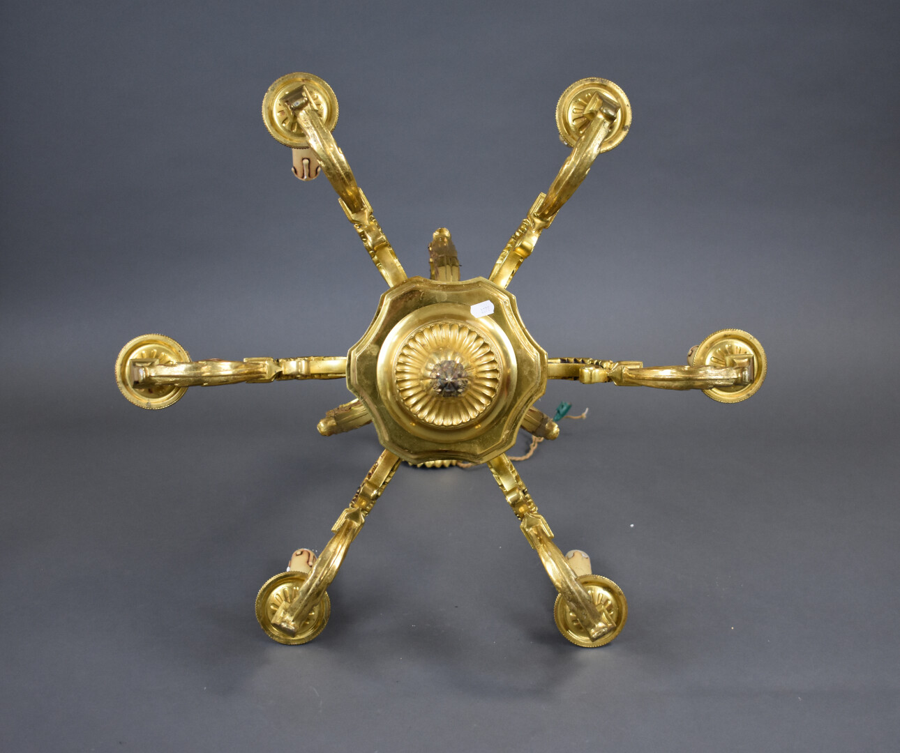 Lustre en bronze ciselé doré à 6 bras de lumière en consoles feuillagées. Style Louis XVI. Haut. : 75 cm.