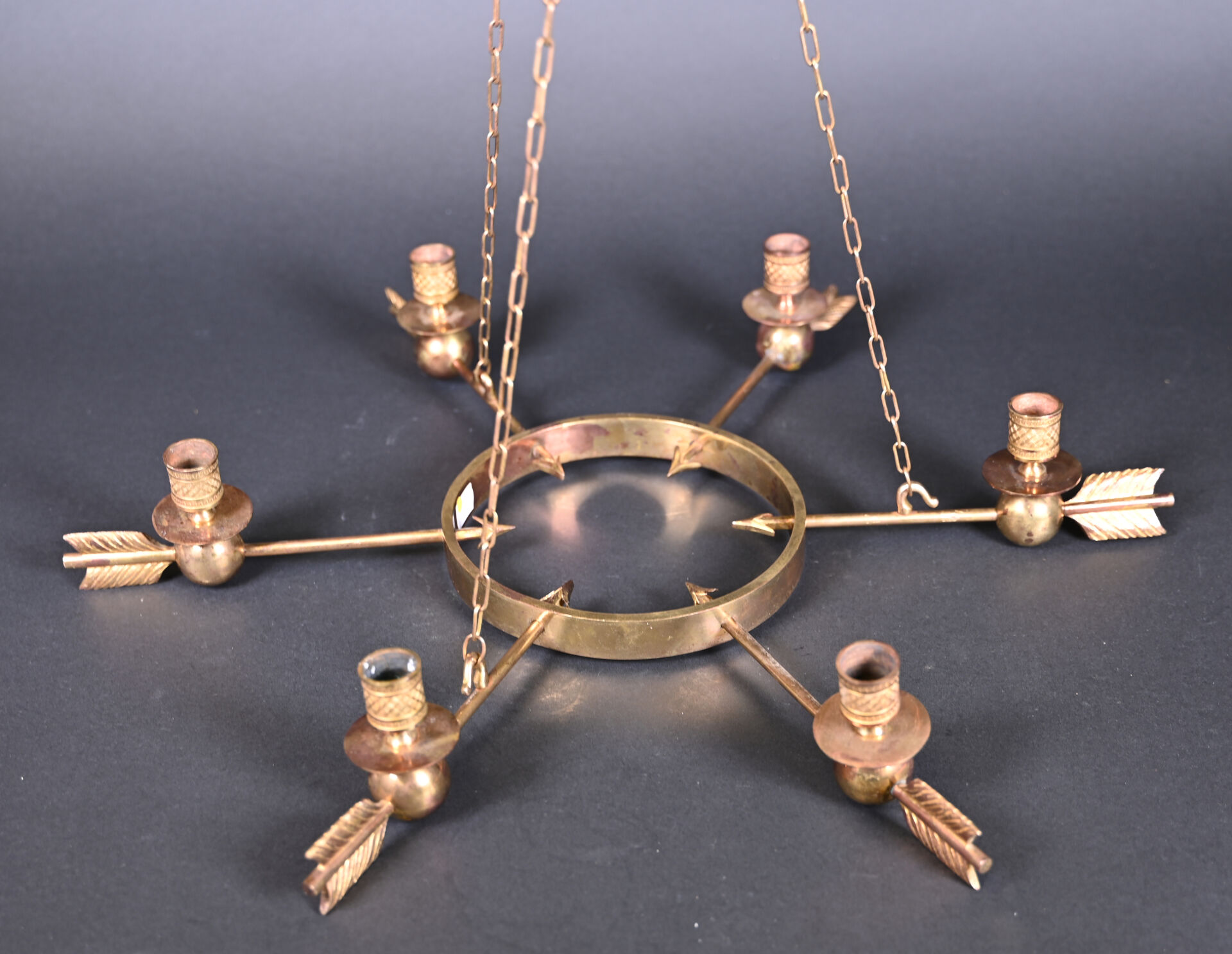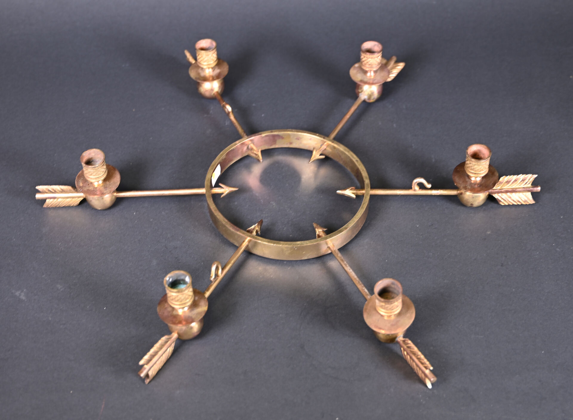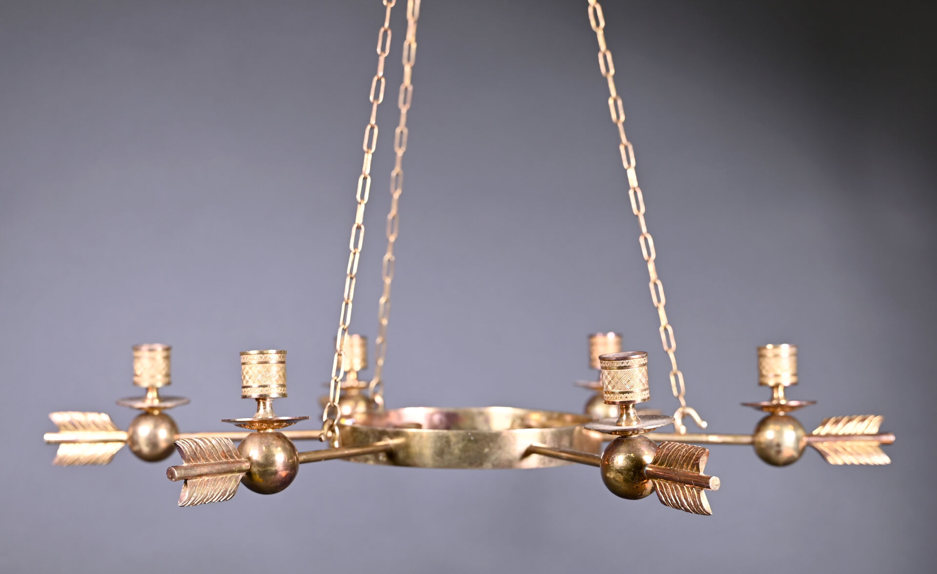 Lustre en laiton à 6 bras de lumières en forme de flèches, non électrifié. Démontable. Style Empire. Diam. : 58,5 cm.