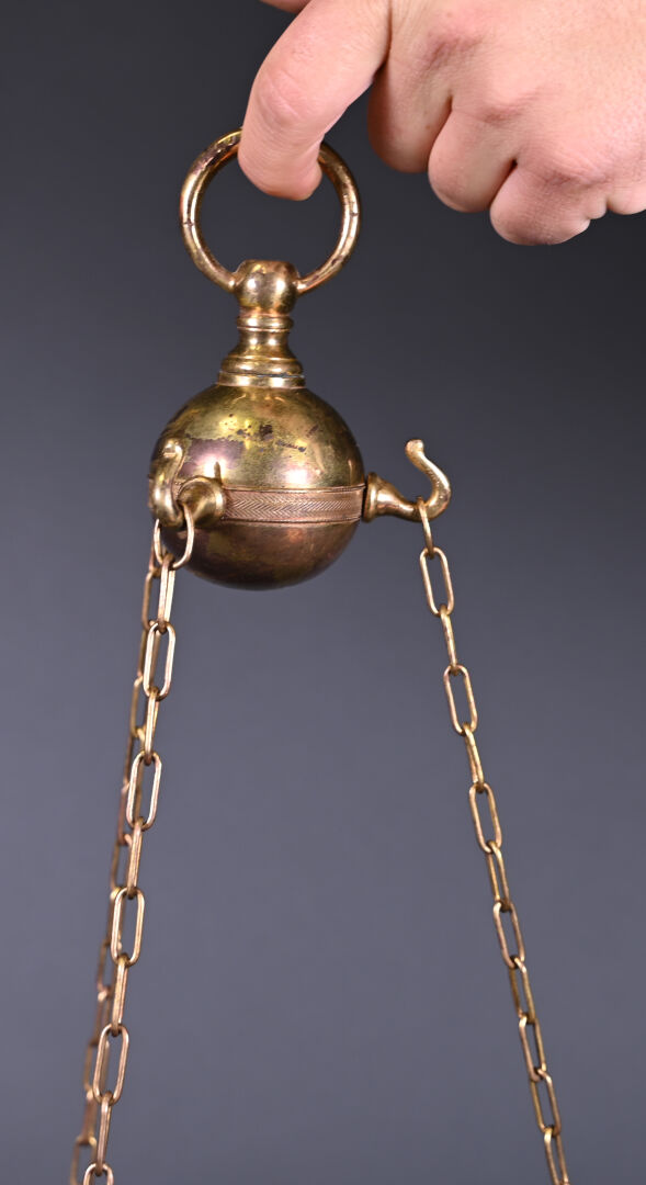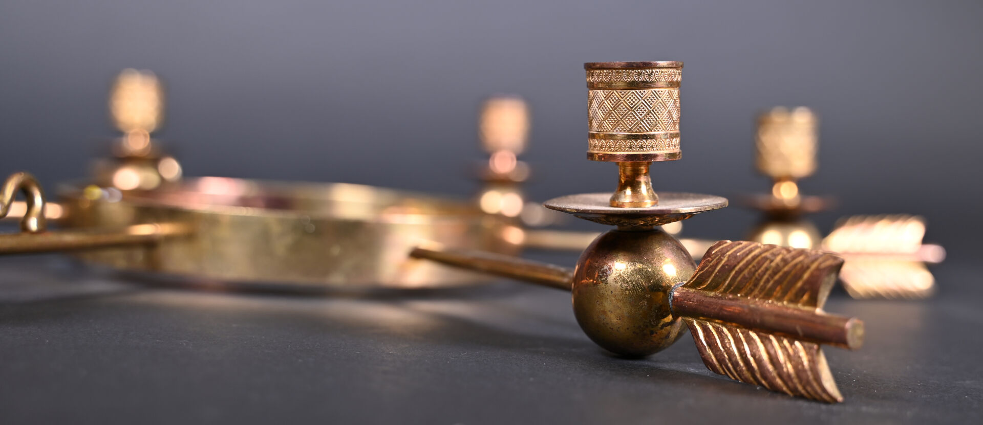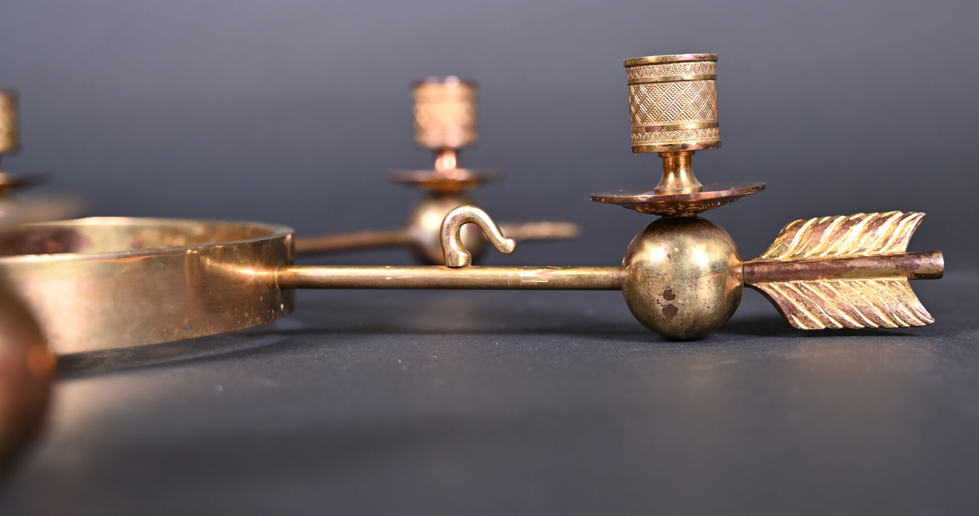 Lustre en laiton à 6 bras de lumières en forme de flèches, non électrifié. Démontable. Style Empire. Diam. : 58,5 cm.
