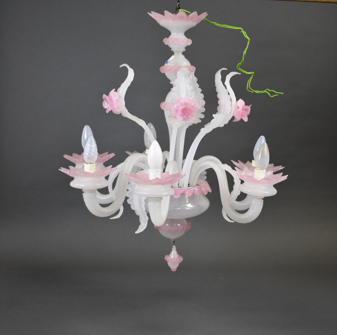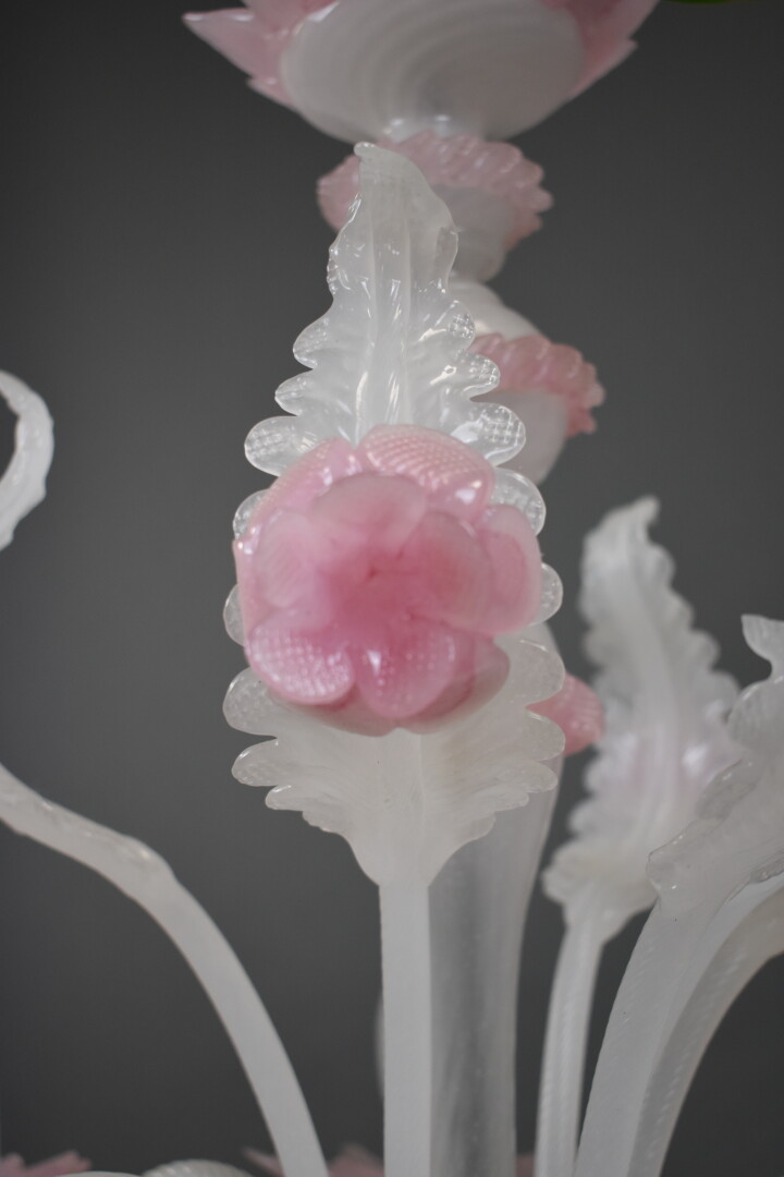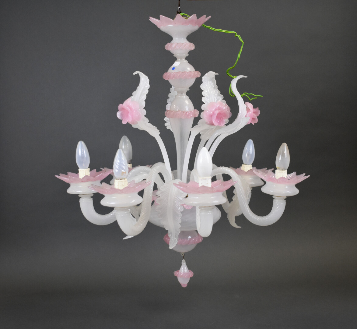 Lustre en verre torsadé blanc et rose à 6 bras de lumière en console, ornementation de feuilles et fleurs de verre (une restauration à une feuille). Murano, XXe siècle. Haut. : 66 cm.