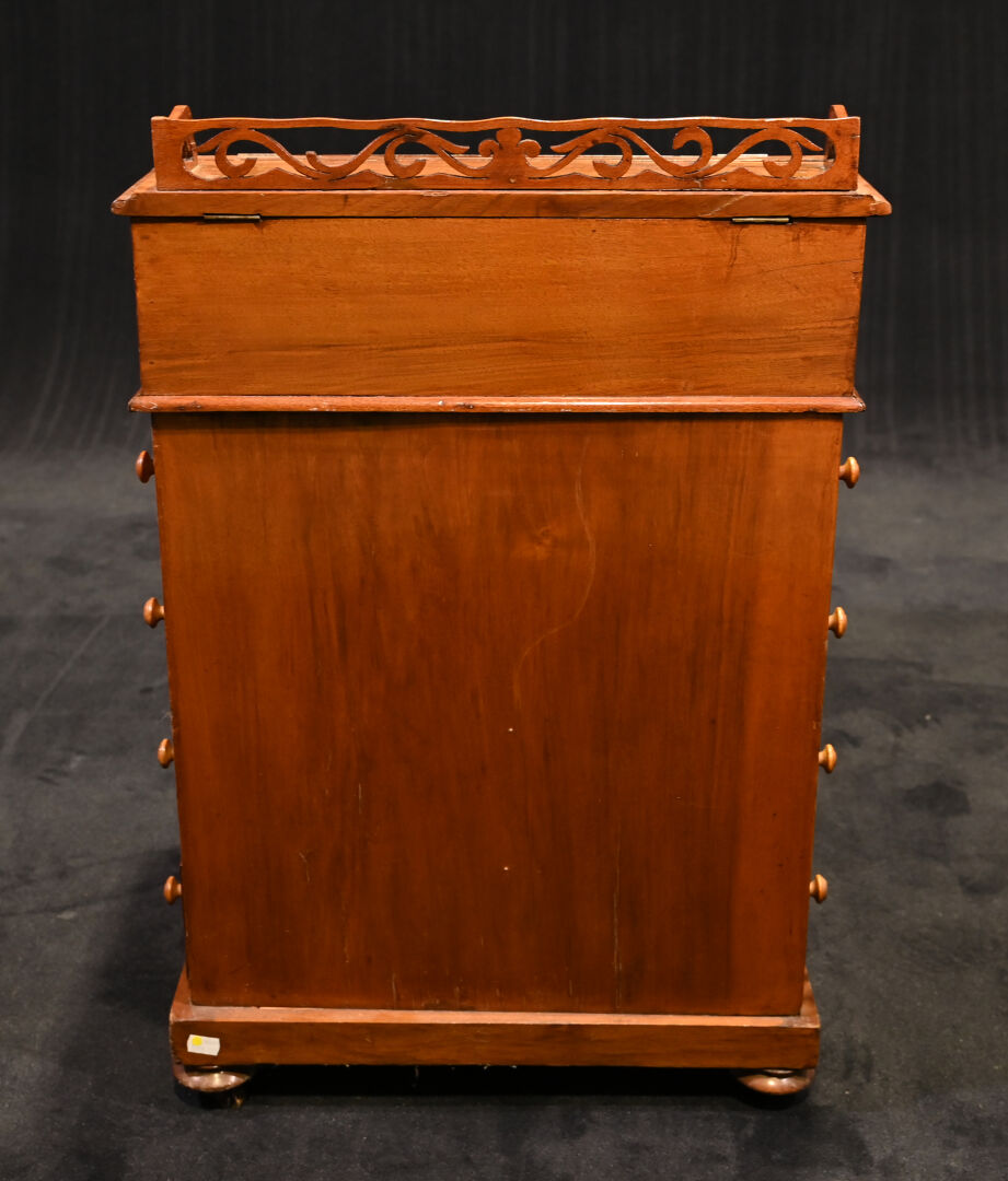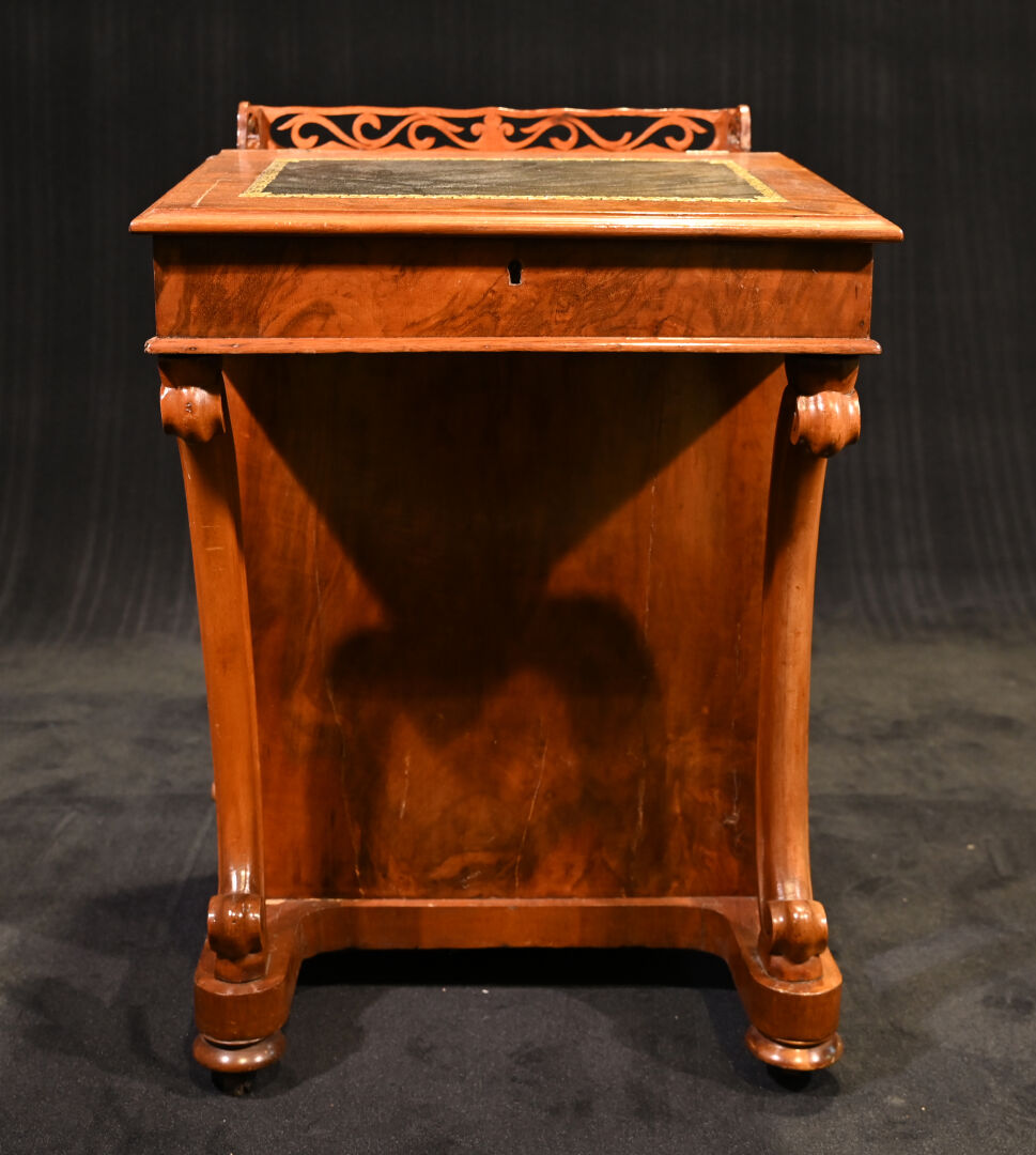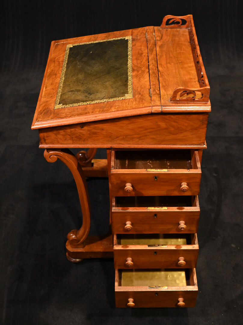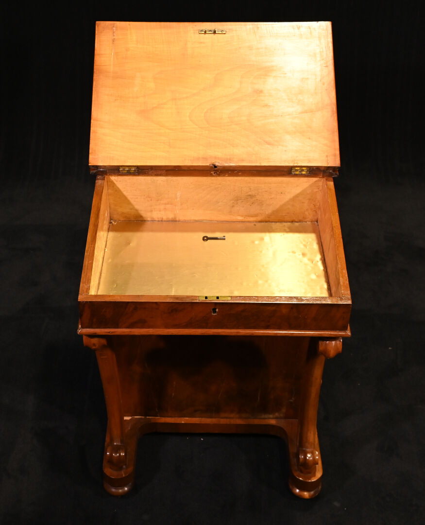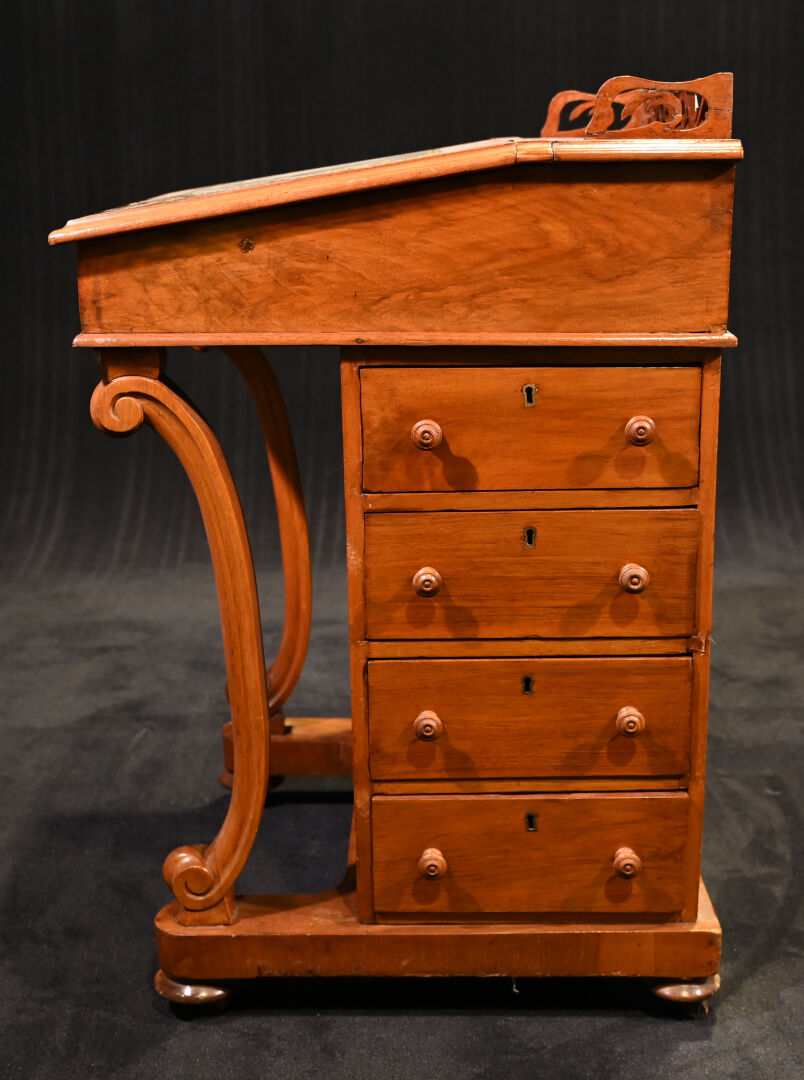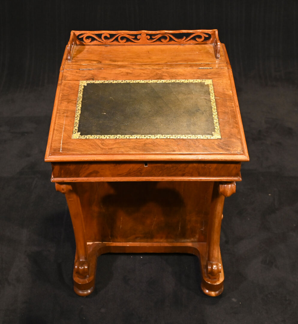 Lutrin en placage de noyer, il ouvre à un abattant formant écritoire garni de cuir noir doré au petit fer (usures et rayures, fente) et 4 tiroirs latéraux et repose sur quatre roulettes (usures). Début du XXe siècle. Haut. : 81 cm – Larg. : 53 cm – Prof. : 54 cm.