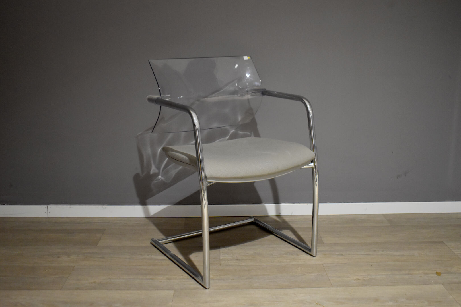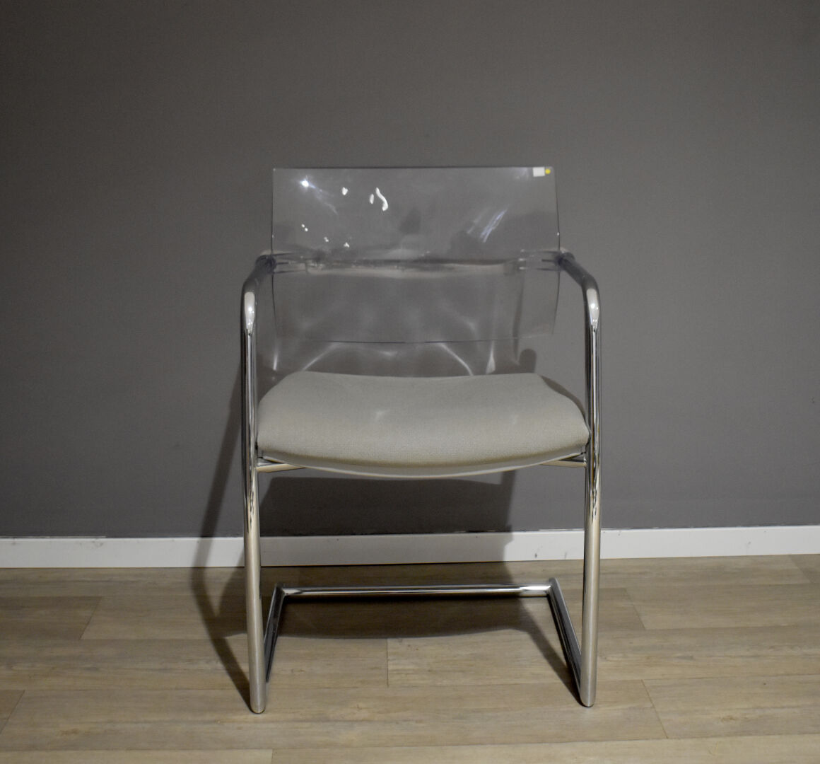 LUXY EDITEUR. Fauteuil de bureau à piètement en port-à-faux en métal tubulaire chromé, le dossier en plexiglas, l’assise en tissu gris (légères usures d’usage). Haut. : 81 cm.