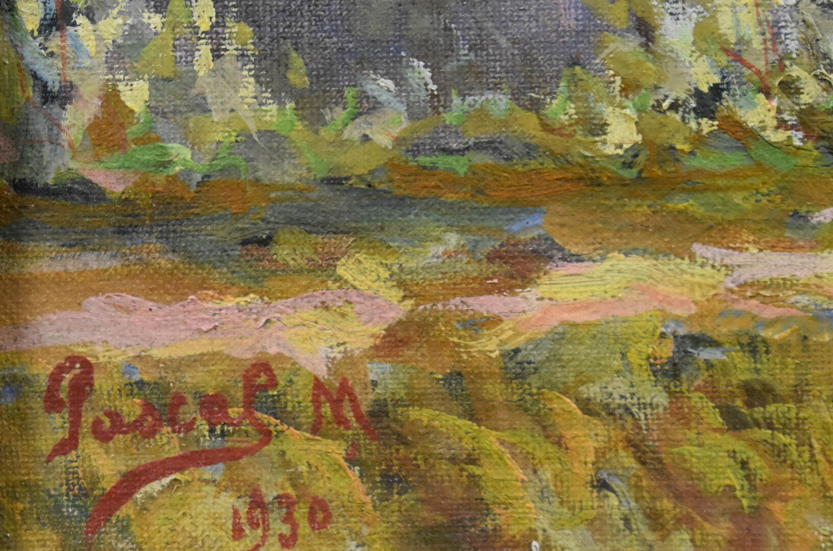 M. PASCAL (XXe siècle). Mas en Provence. Huile surtoile signée et datée 1930 en bas à gauche (usures et restaurations). 40,5 x 49,5 cm.