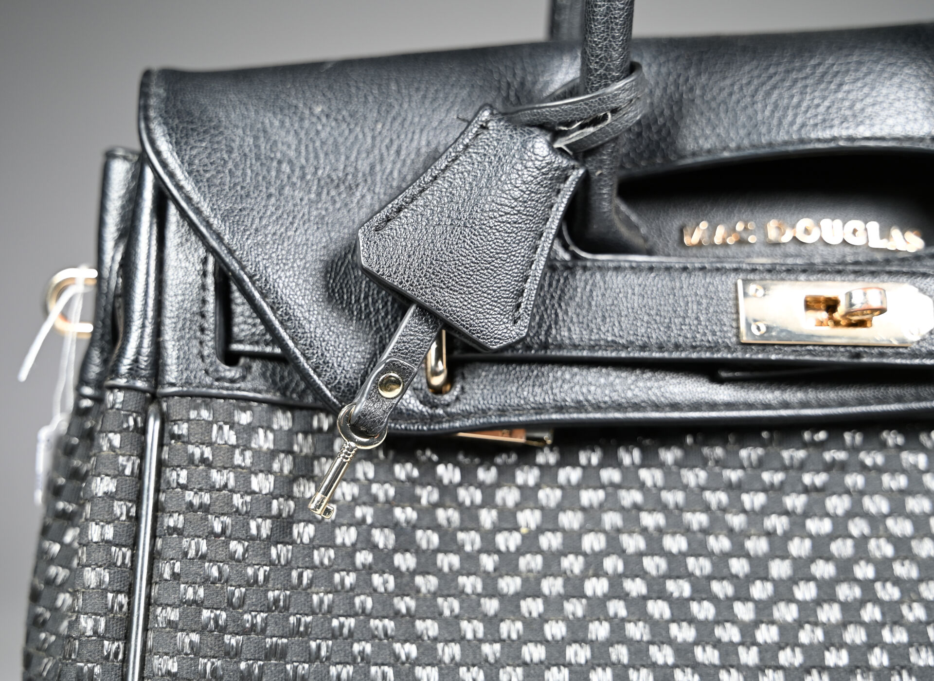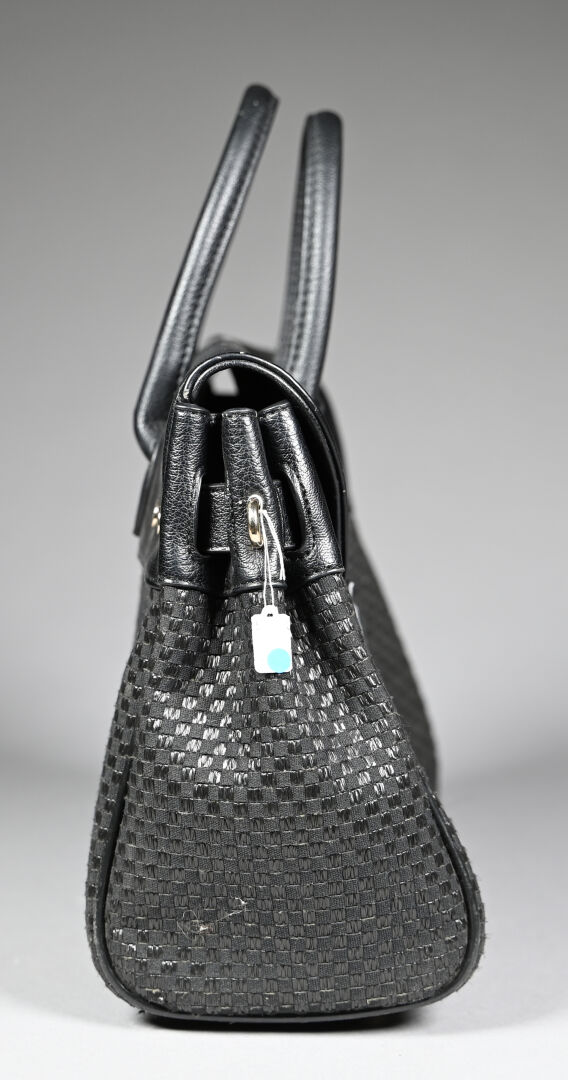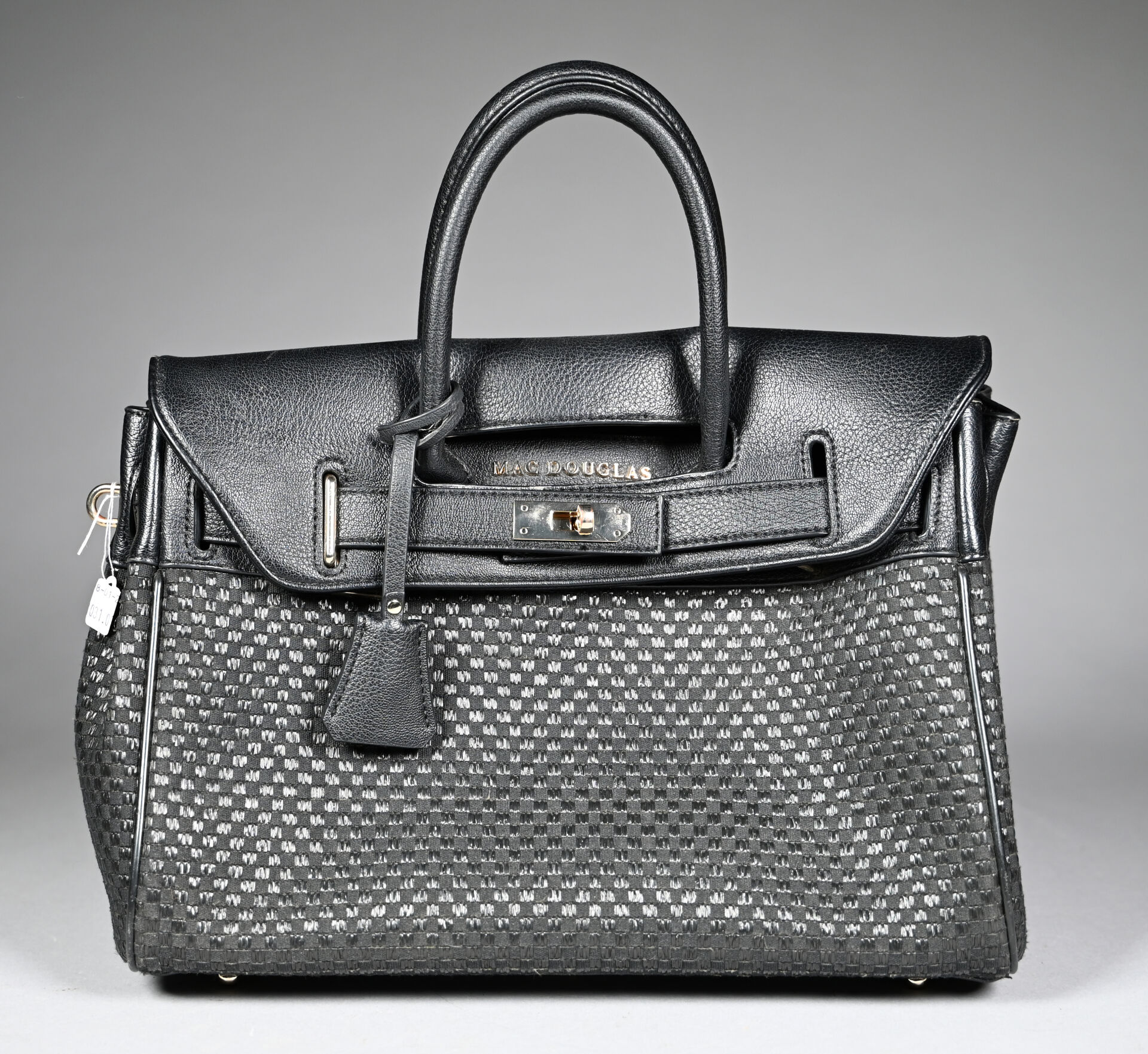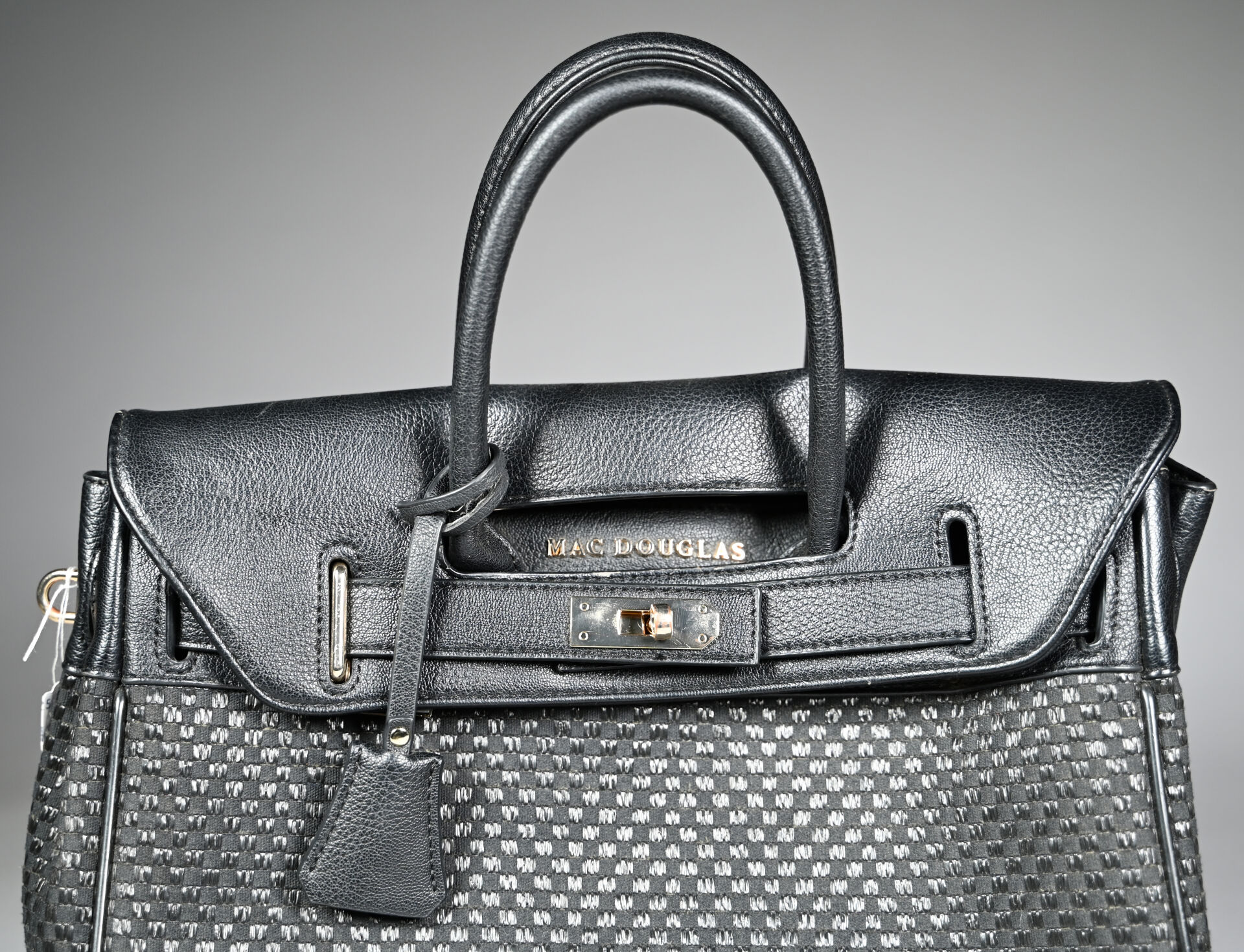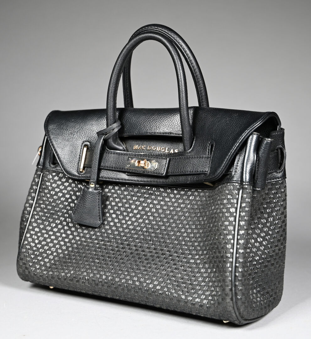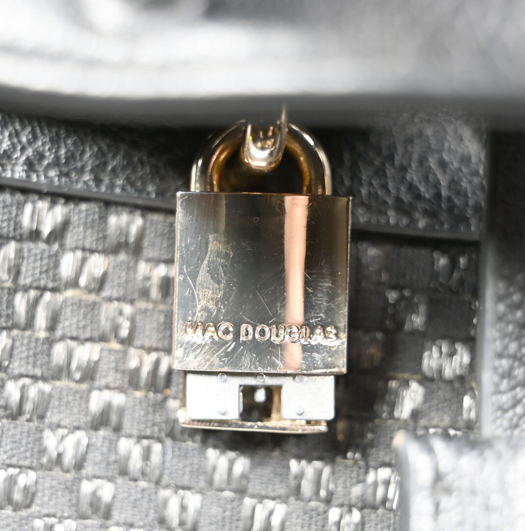 MAC DOUGLAS. Sac à main en cuir grainé et tressé dans le goût du Kelly (cadenas accidenté). Haut. : 25,5 cm – Larg. : 34 cm Prof. : 14 cm.