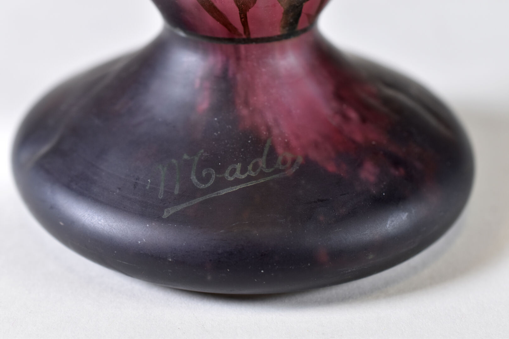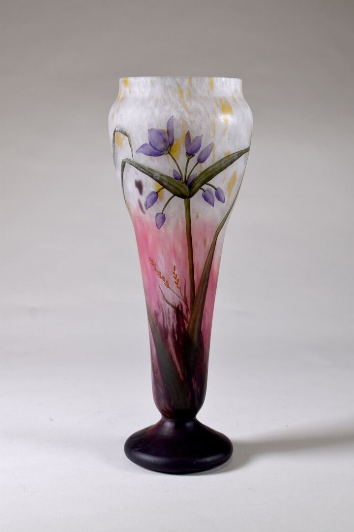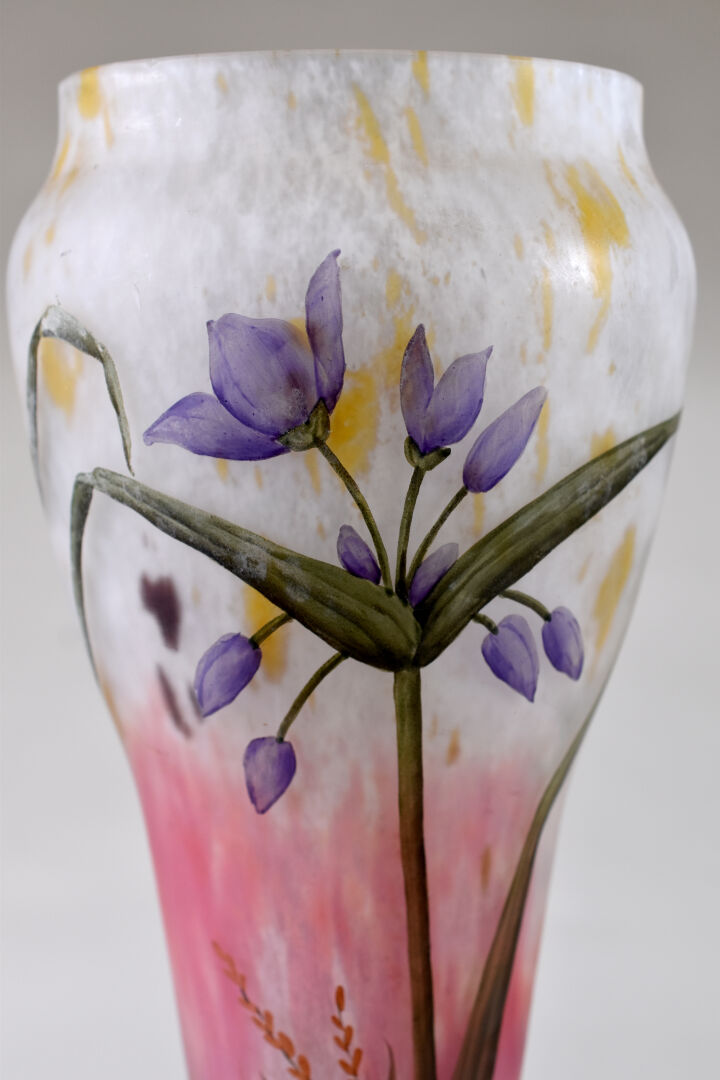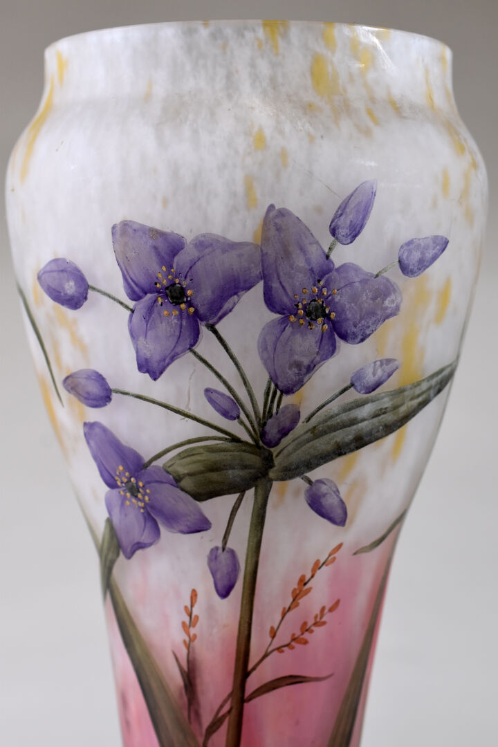 MADO. Vase balustre en verre marmoréen rose et beige à décor émaillé en polychromie de fleurs. Signé à la base. Haut. : 35,5 cm.