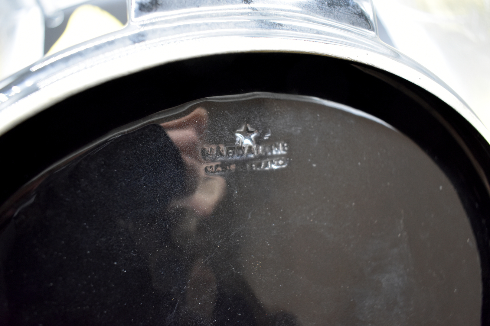 MAGDALITHE. Service à apéritif en faïence noir et jaune à rehauts or figurant deux scalaires et deux coquilles St Jacques. Marqués. Vers 1950.